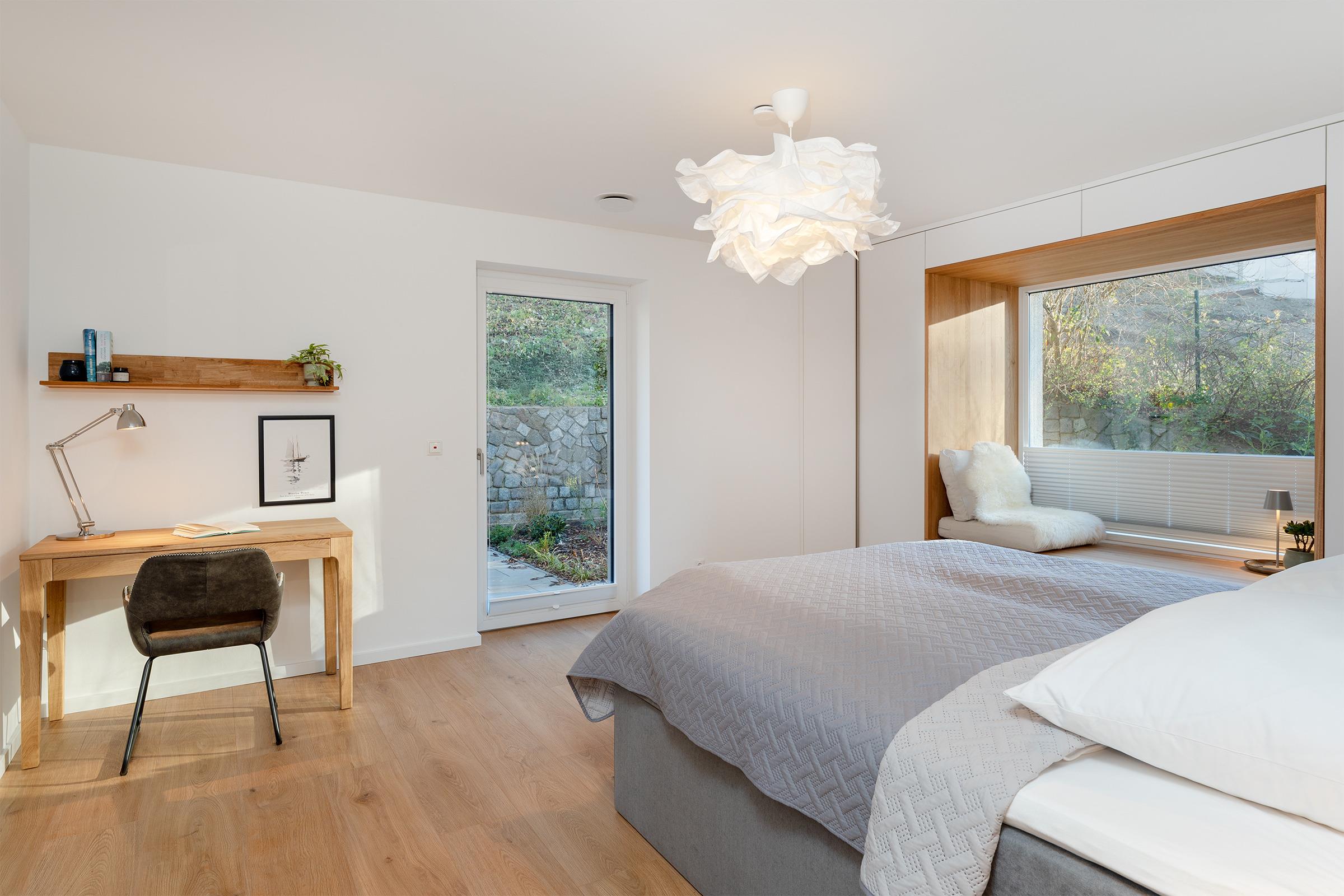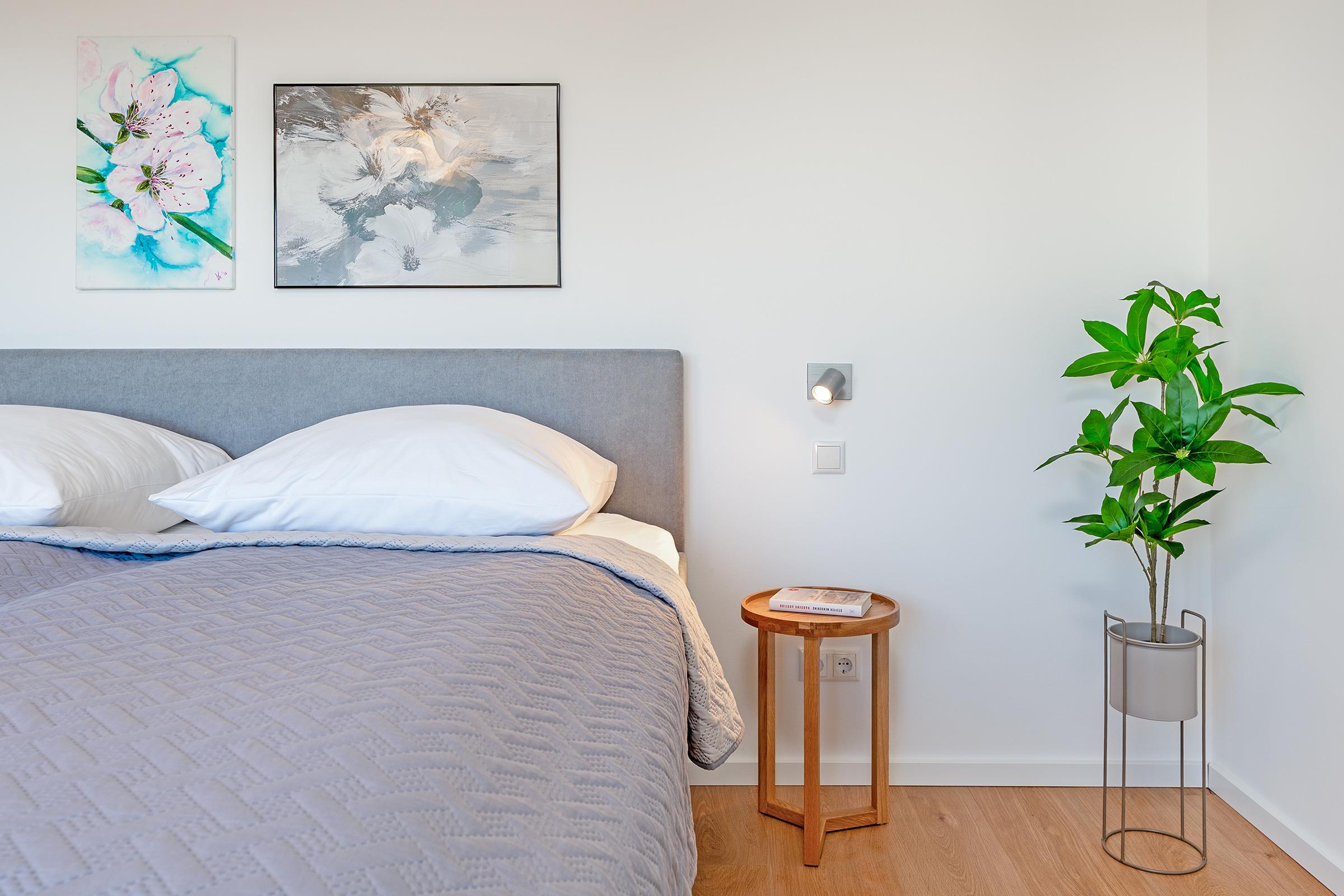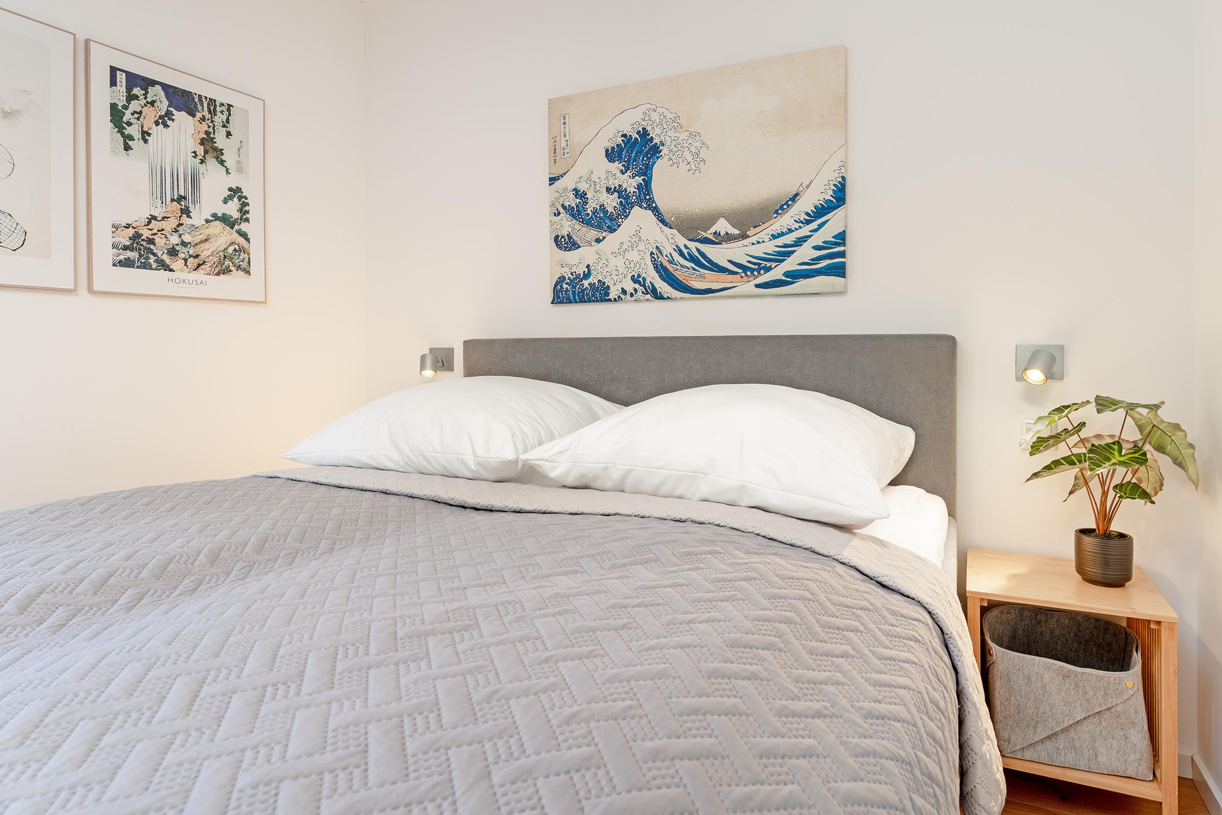 Schlafzimmer 3: 1 Doppelboxspringbett (160x200 cm mit durchgehendem Topper), Verdunkelung: Plissee, kein Platz für ein Babybett vorhanden