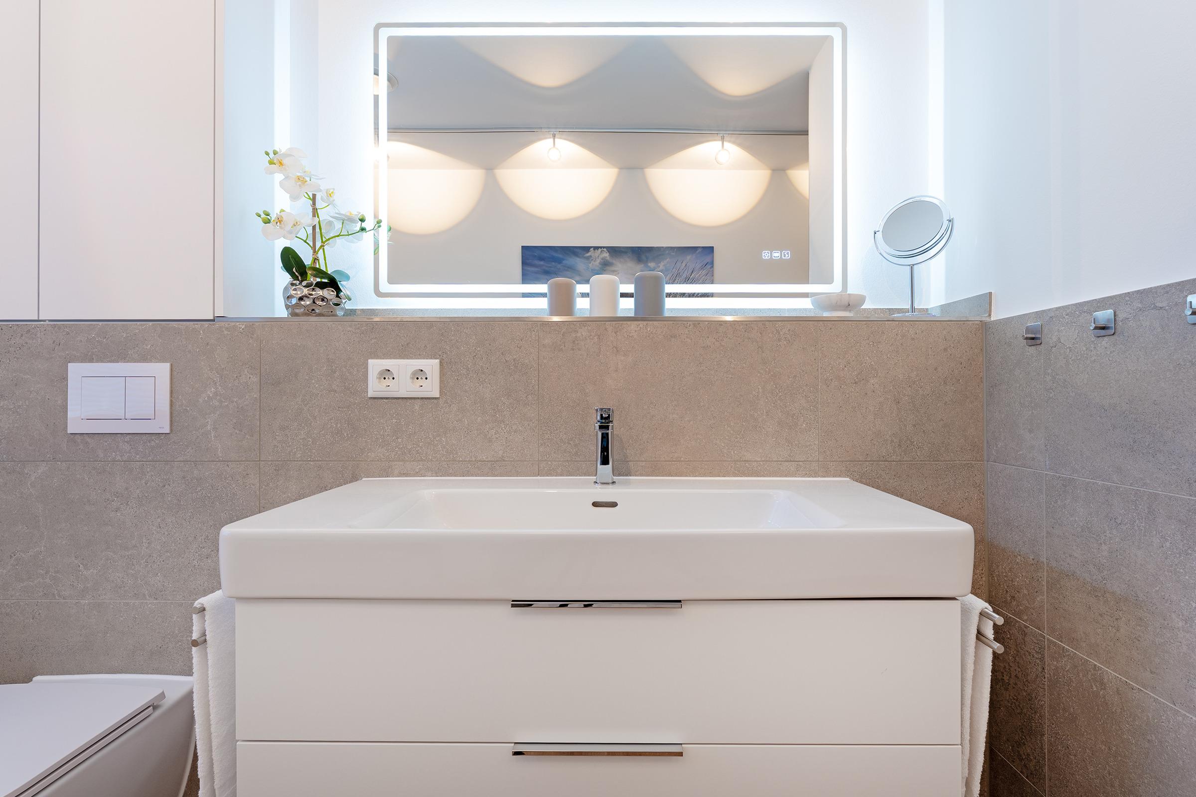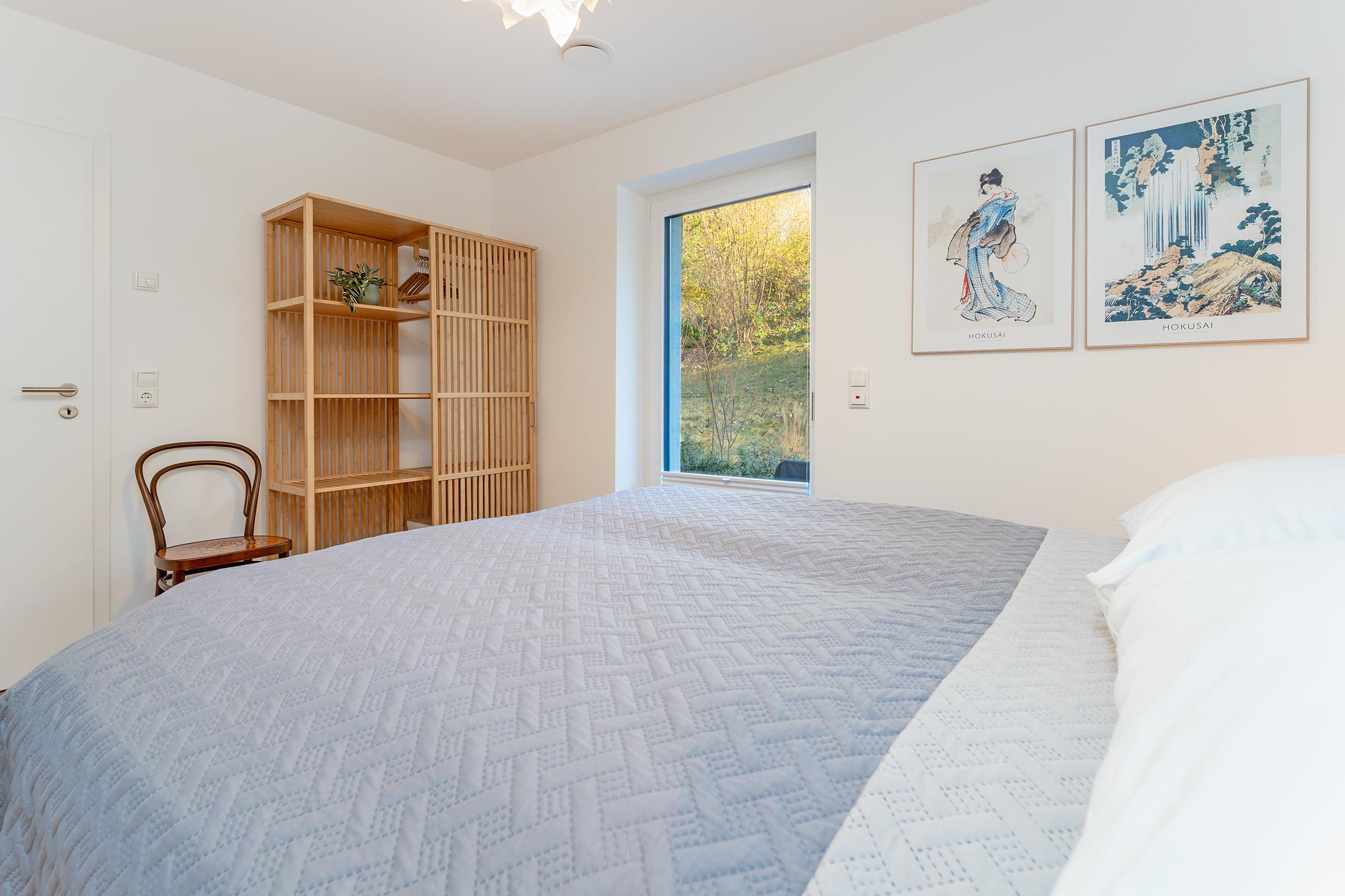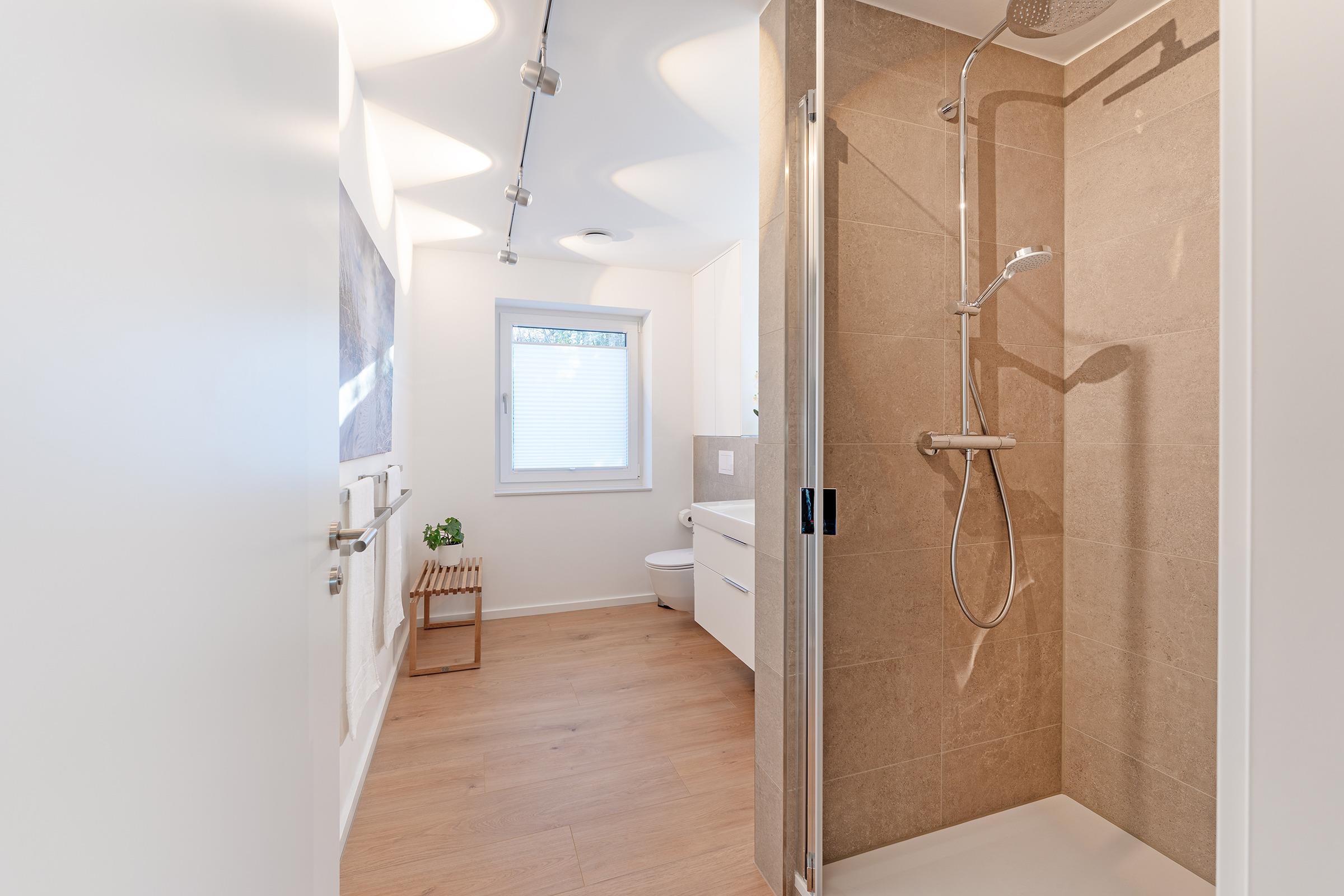Die offene Küche ist hochwertig ausgestattet mit Backofen, Geschirrspüler, Ceran-Kochfeld, Kühlschrank sowie praktischen Extras wie einer Nespresso-Kapselmaschine. Der angrenzende Essbereich mit großem Tisch bietet reichlich Platz für gemeinsame Mahlzeiten in geselliger Runde. Drei geschmackvoll eingerichtete Schlafzimmer, ausgestattet mit komfortablen Doppelbetten, versprechen erholsame Nächte. Das moderne Badezimmer verfügt über Dusche und Duschwanne (Einstiegshöhe 5 cm) sowie Fußbodenheizung. Ein separates Gäste-WC ist ebenfalls vorhanden.