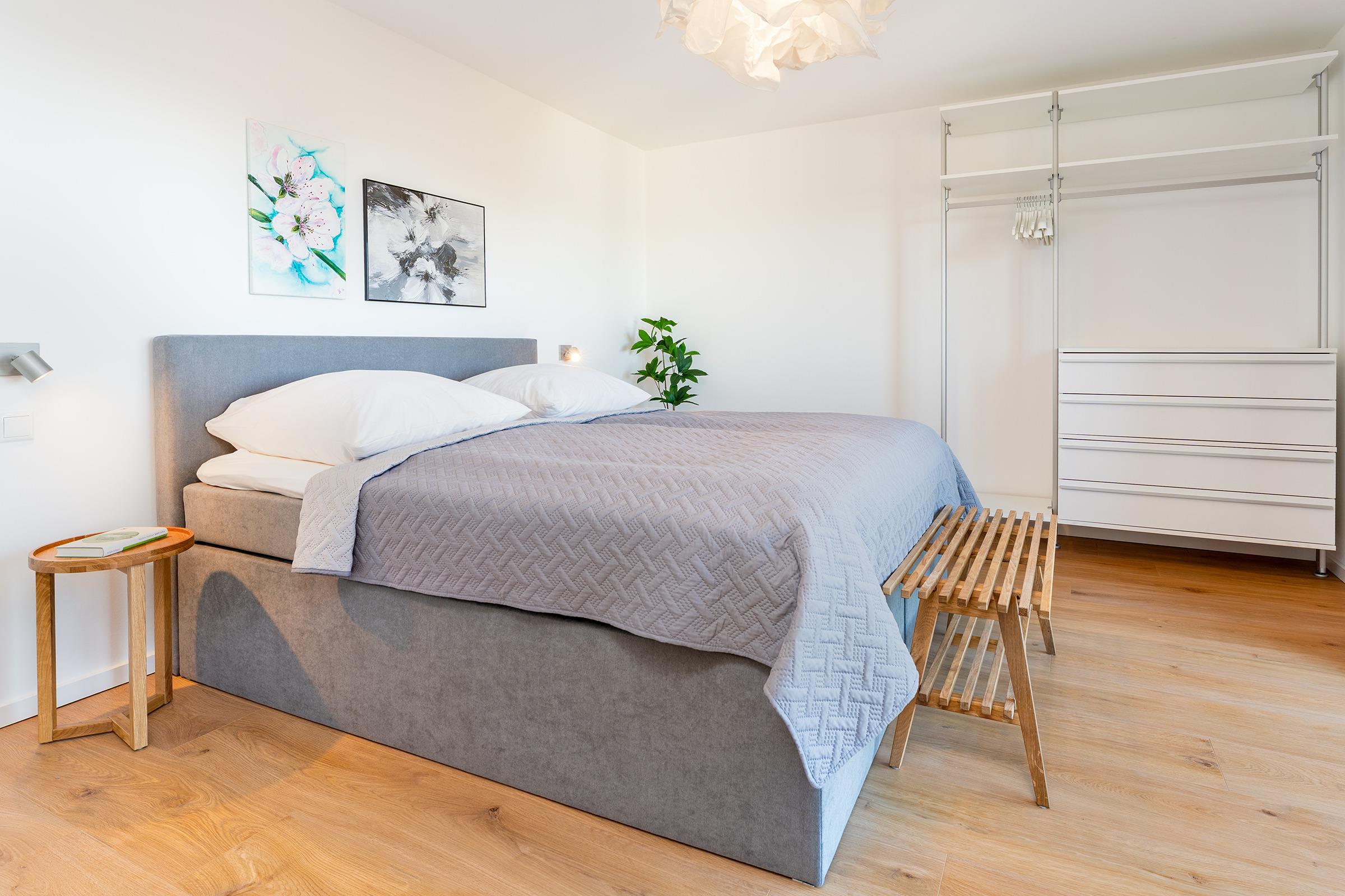 Schlafzimmer 1: 1 Doppelboxspringbett (180x200 cm mit durchgehendem Topper), Kleiderschrank, Verdunkelung: Plissee, Platz für ein Babybett vorhanden