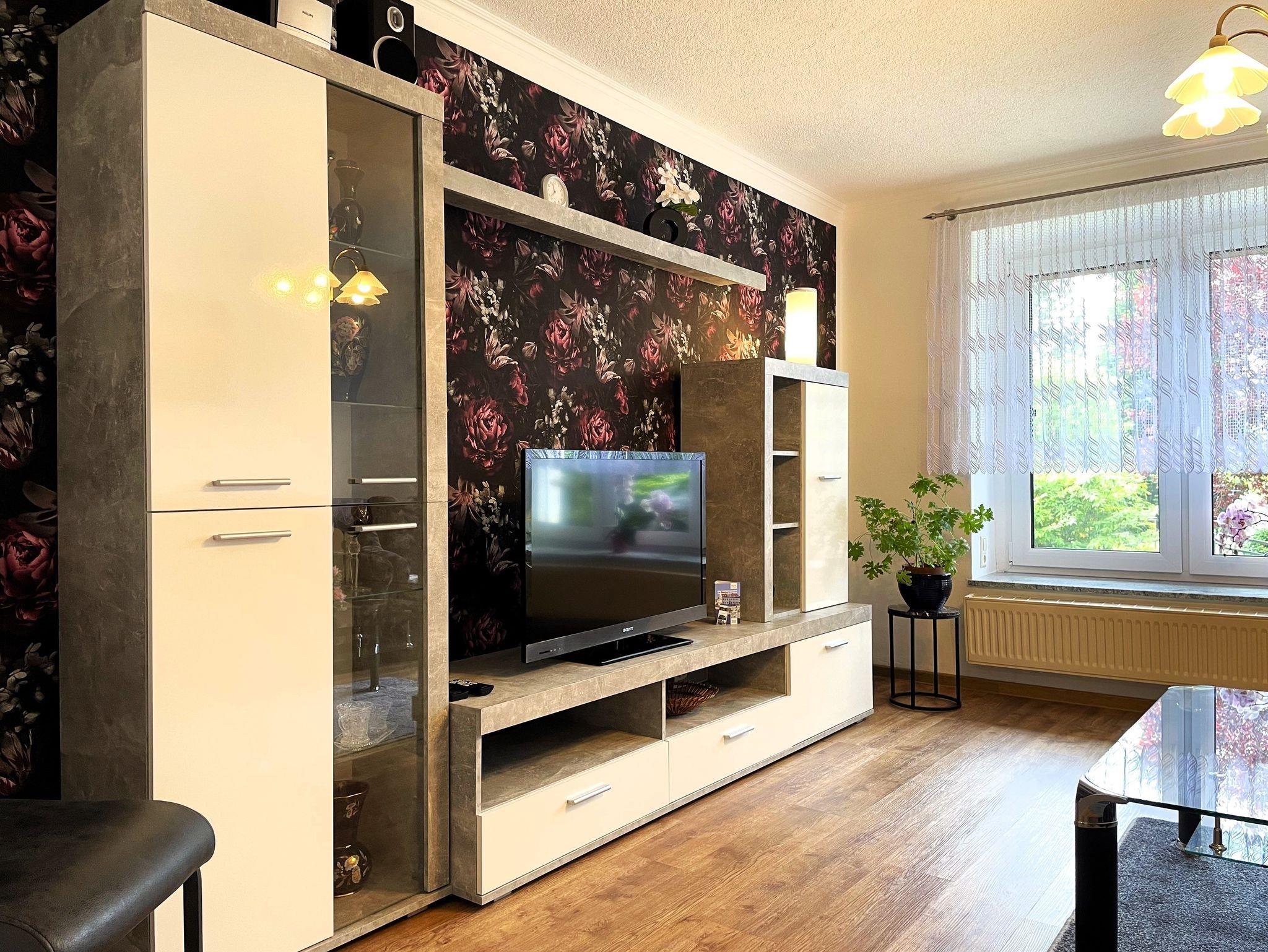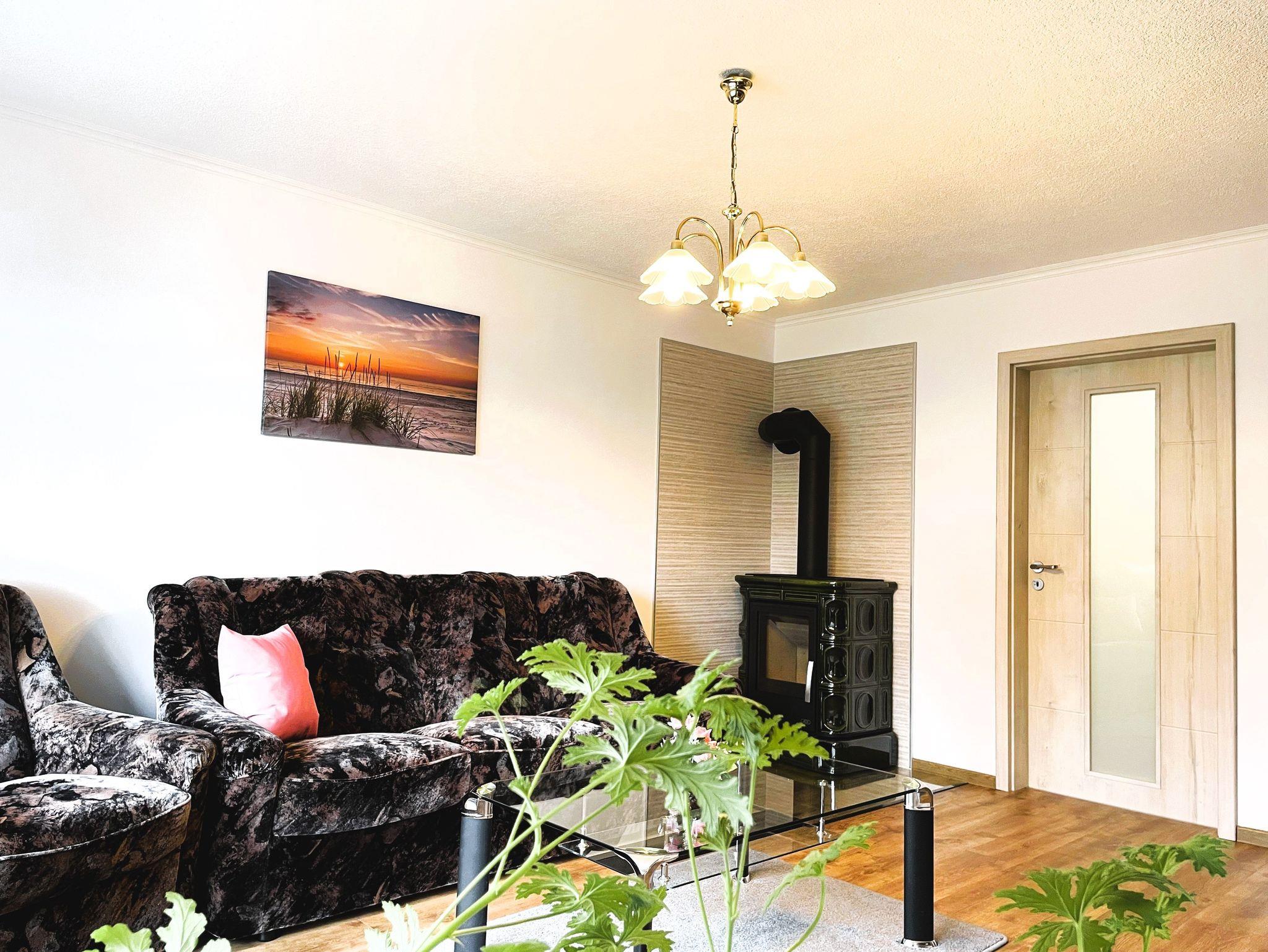 Das gemütliche Wohnzimmer lädt mit einem Sofa, einem Sessel und einer geschmackvollen Schrankwand zum Verweilen ein. Ein großer Flachbildfernseher sorgt abends für abwechslungsreiche Unterhaltung, während der Kaminofen an kühlen Tagen eine behagliche Atmosphäre schafft.