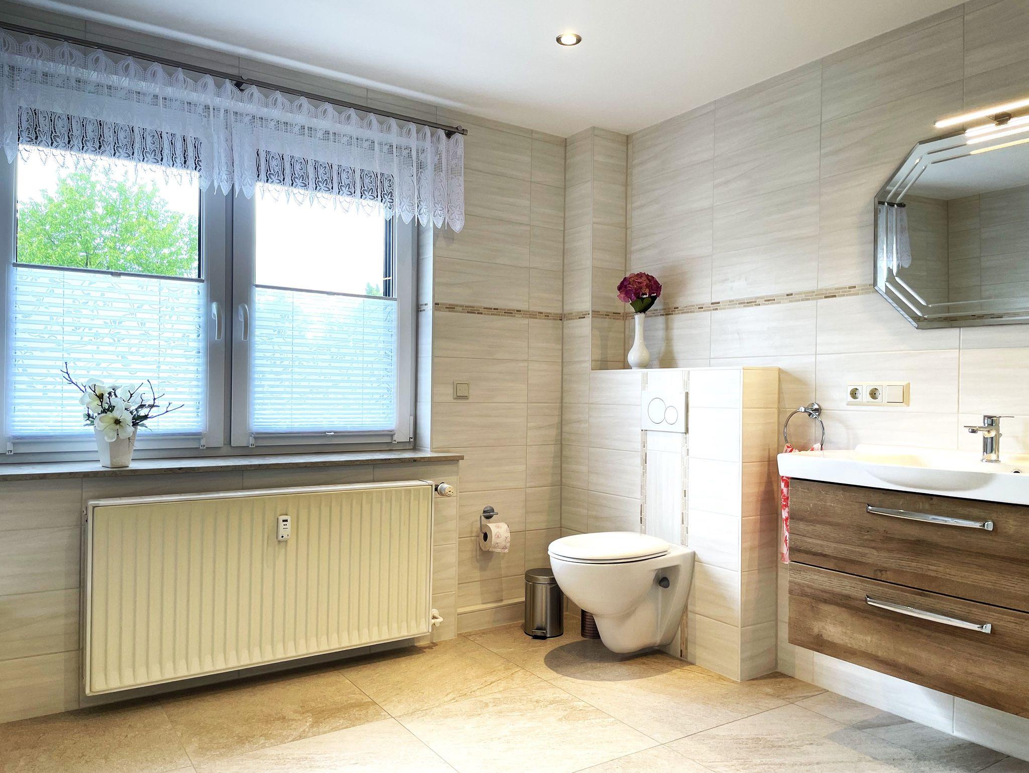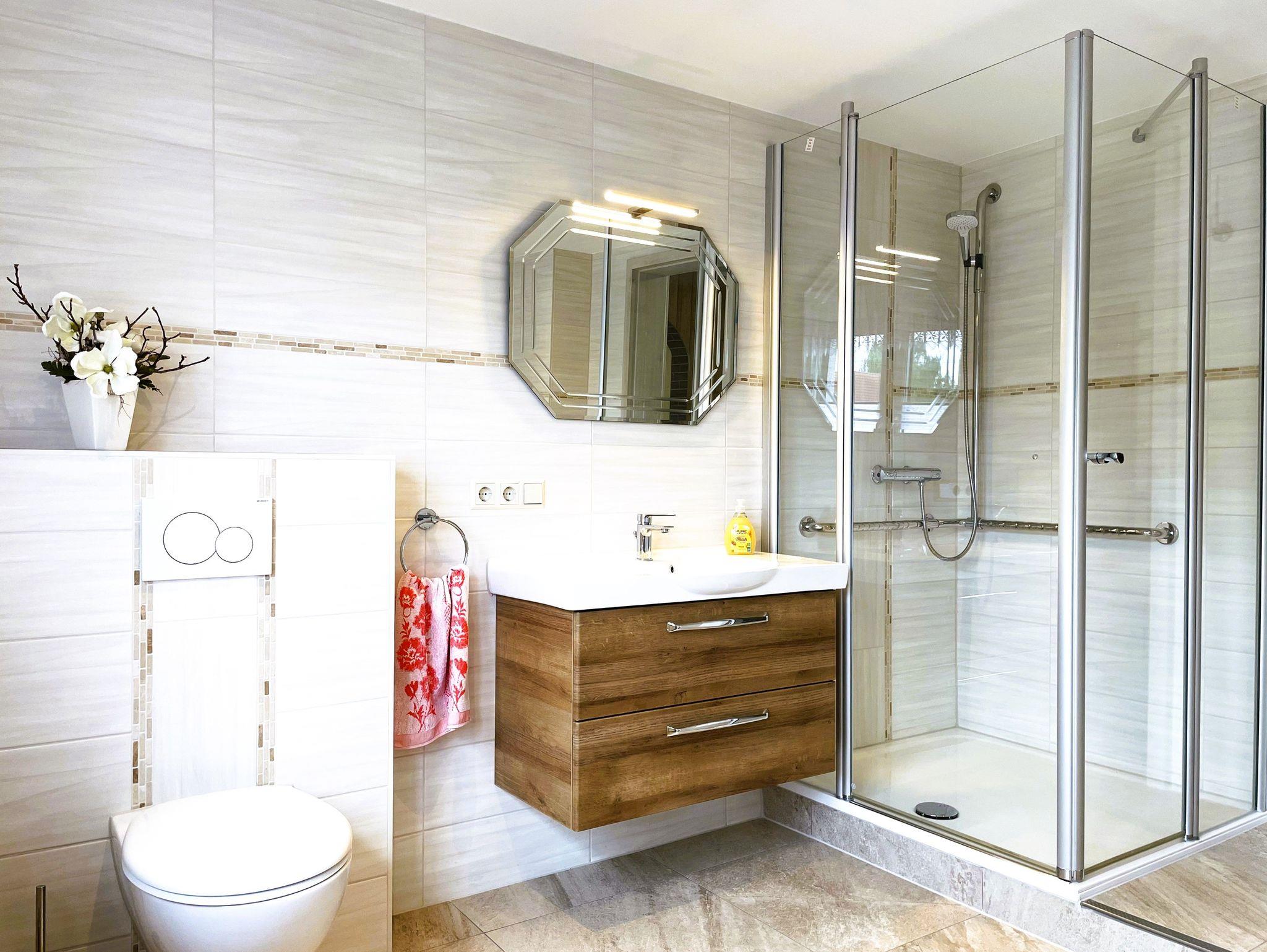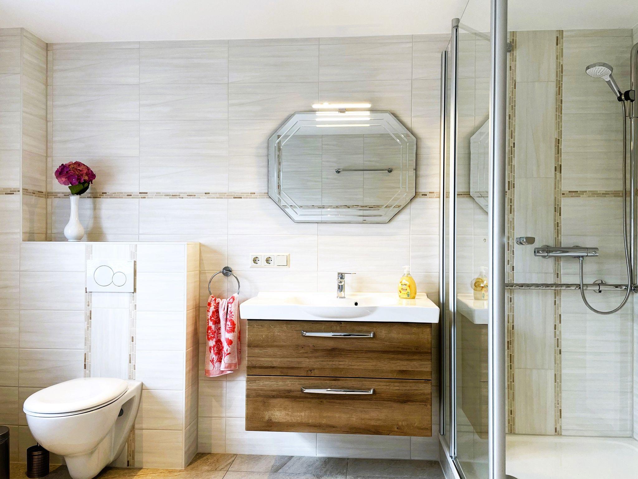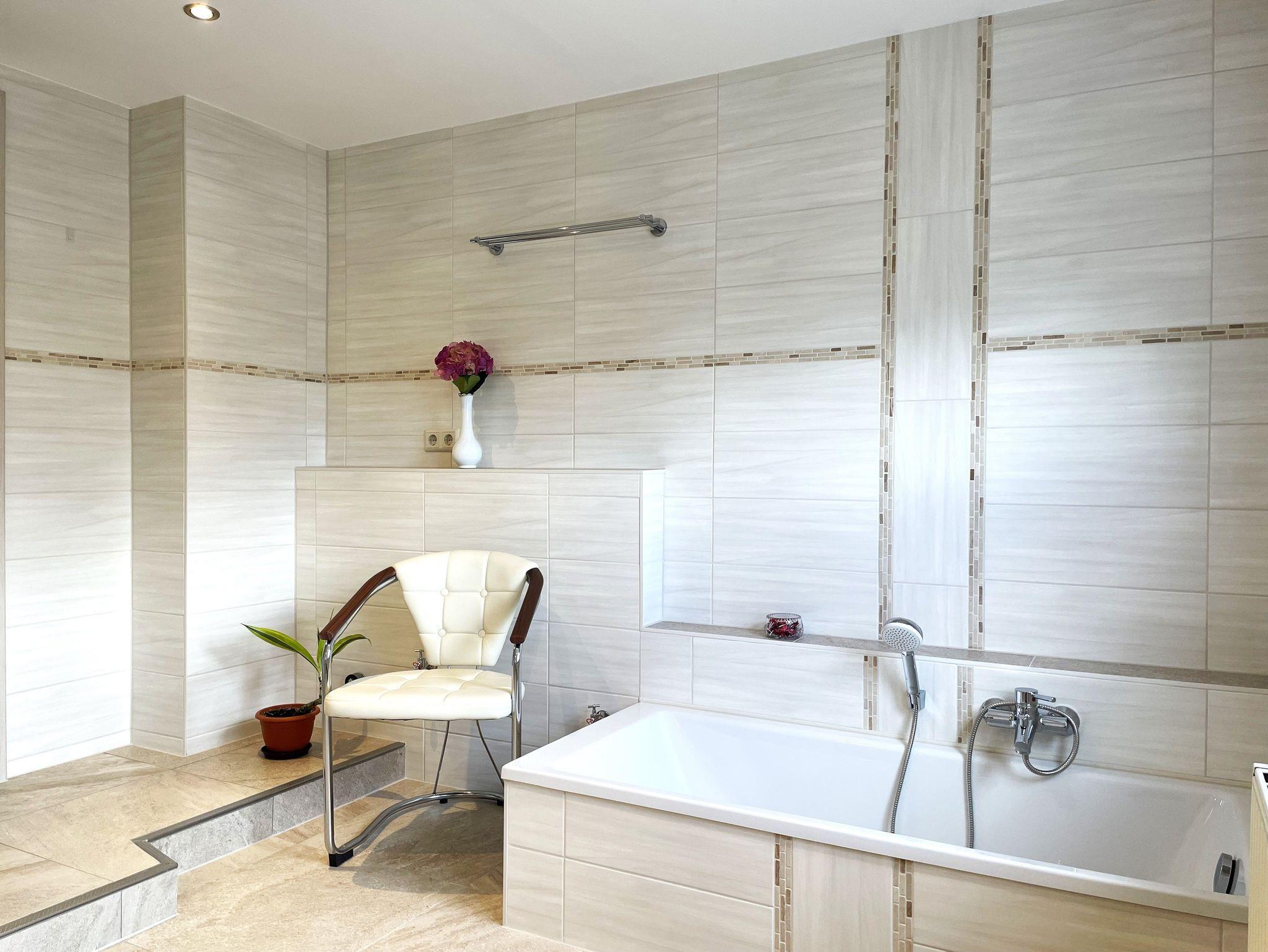 Im hellen, großzügigen Badezimmer überzeugt die ebenerdige Dusche, eine Badewanne mit tiefem Einstieg, einem zeitgenössischen Waschtisch sowie ein WC.
