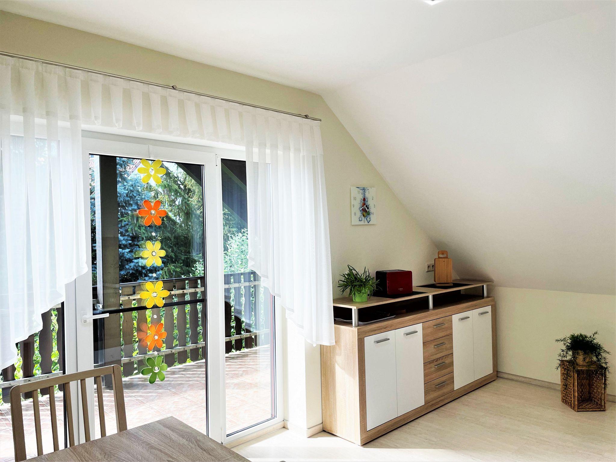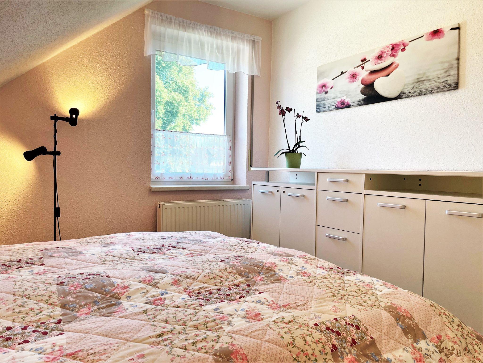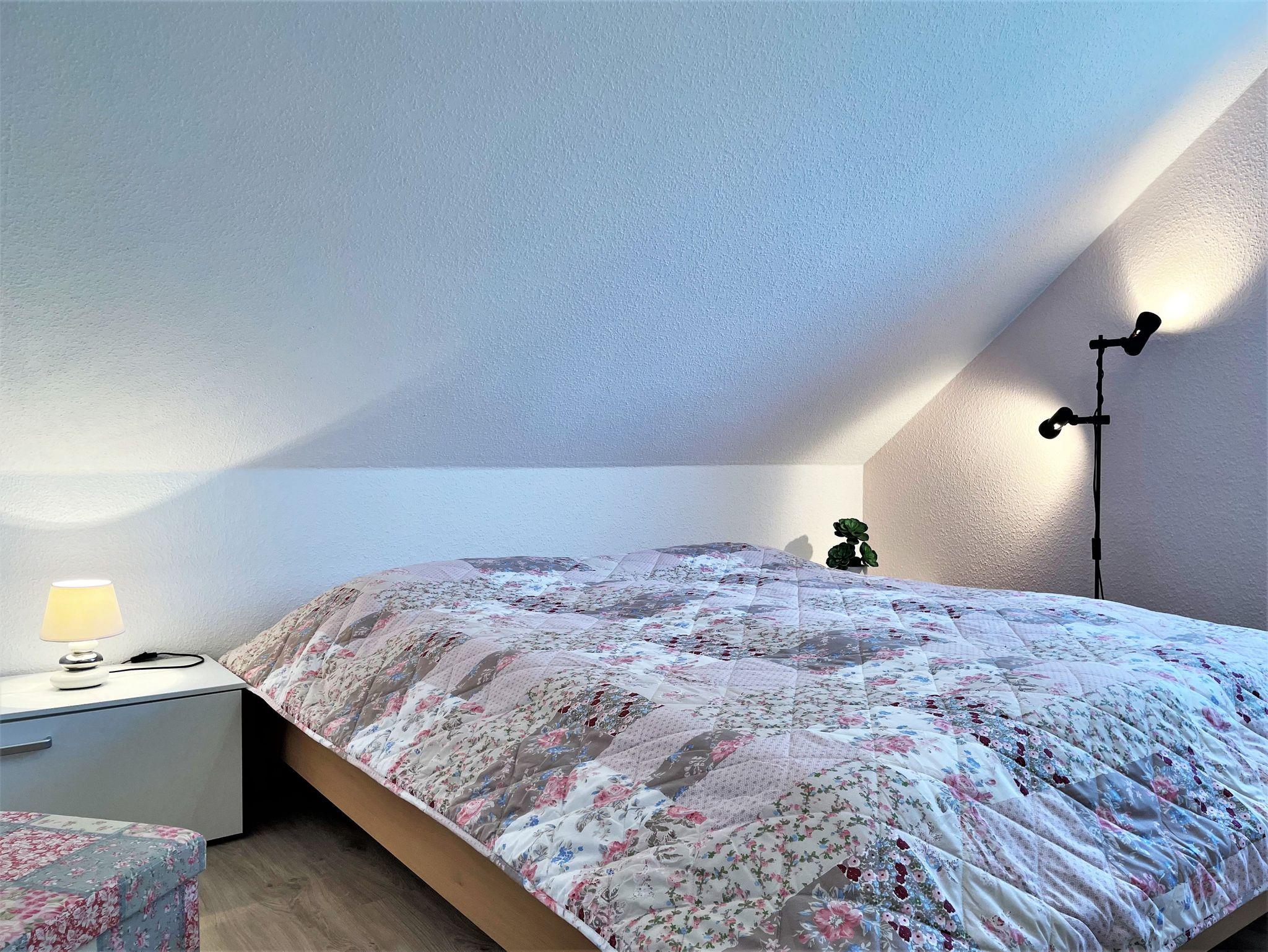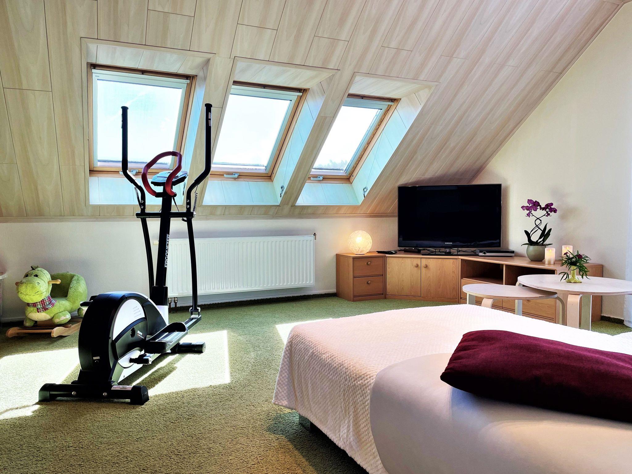 Die 60 m² große Ferienwohnung ist ideal für bis zu 5 Personen geeignet. Auf Anfrage kann ein Babybett und ein Hochstuhl zur Verfügung gestellt werden, so haben auch 6 Personen Platz. Das hell und freundlich eingerichtete Wohnzimmer verfügt über kleine Flachstrecken, Eckcouch und einen TV-Flachbildschirm. Ein im Wohnzimmer stehender Hometrainer darf gern genutzt werden. Auch für die Kleinsten in der Familie ist eine kleine Spielecke vorhanden.