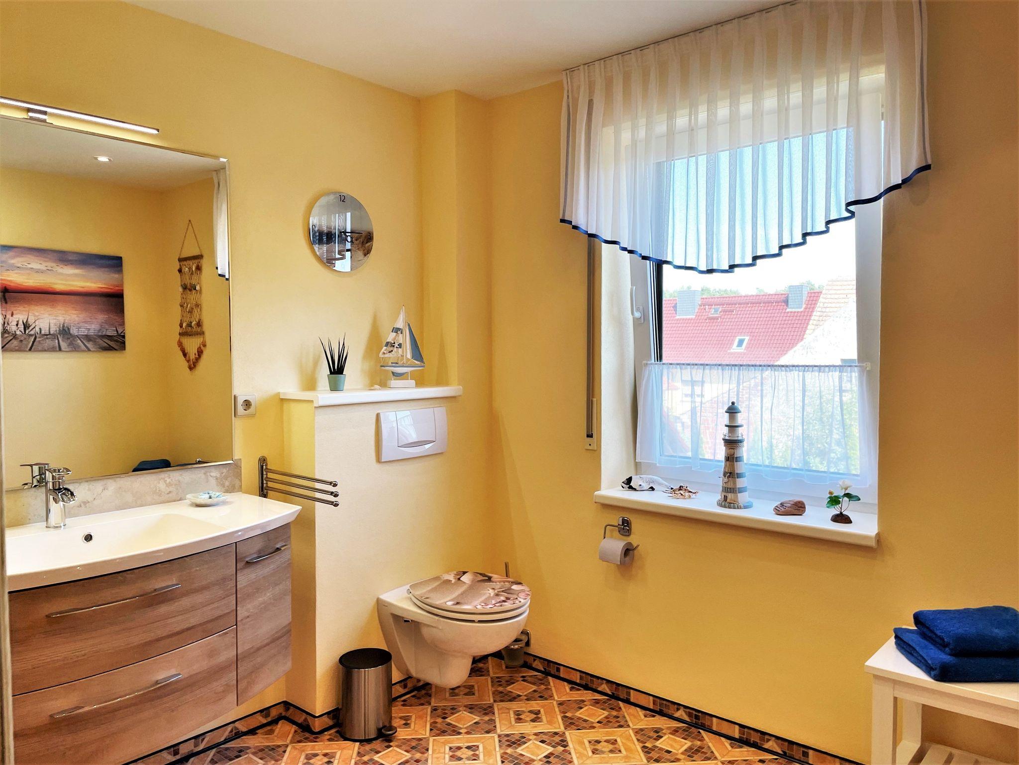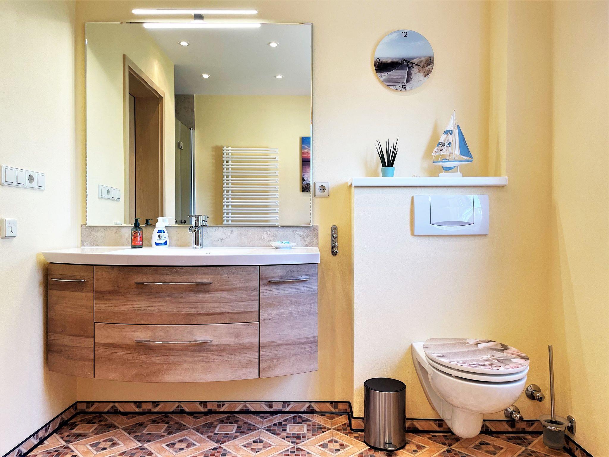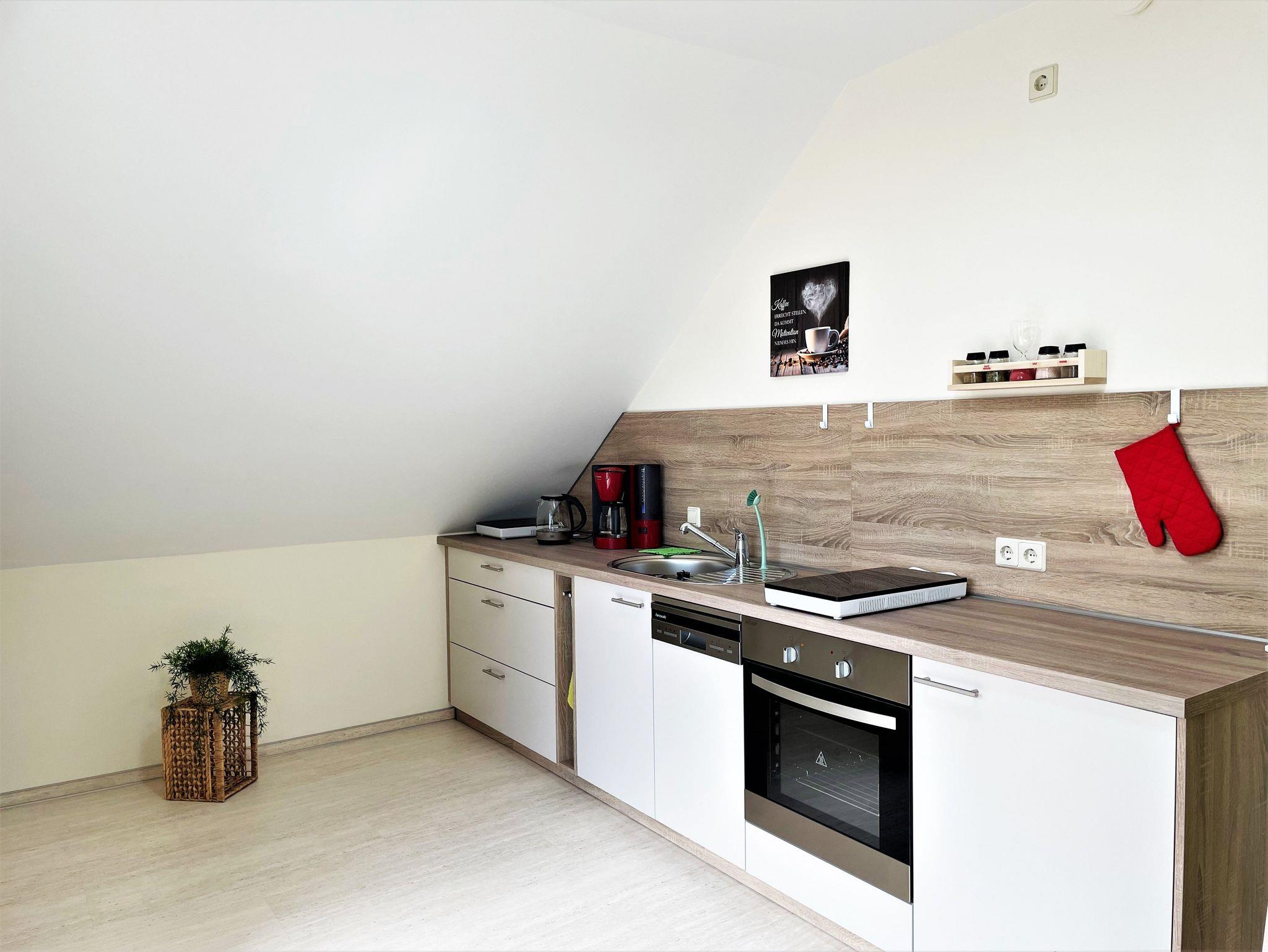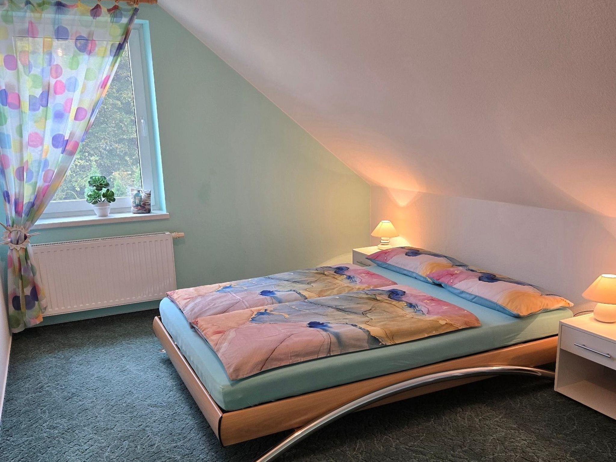 Die 60 m² große Ferienwohnung ist ideal für bis zu 5 Personen geeignet. Auf Anfrage kann ein Babybett und ein Hochstuhl zur Verfügung gestellt werden, so haben auch 6 Personen Platz. Das hell und freundlich eingerichtete Wohnzimmer verfügt über kleine Flachstrecken, Eckcouch und einen TV-Flachbildschirm. Ein im Wohnzimmer stehender Hometrainer darf gern genutzt werden. Auch für die Kleinsten in der Familie ist eine kleine Spielecke vorhanden.