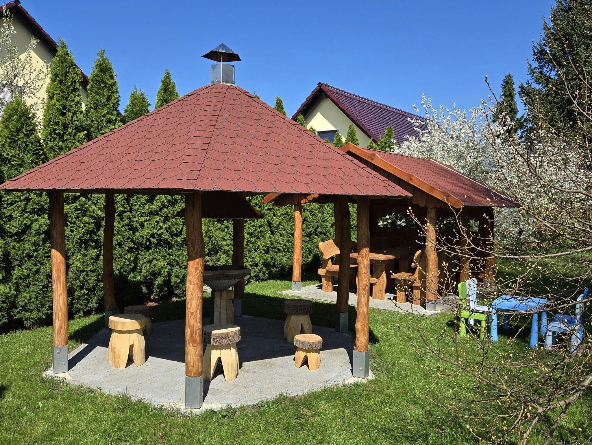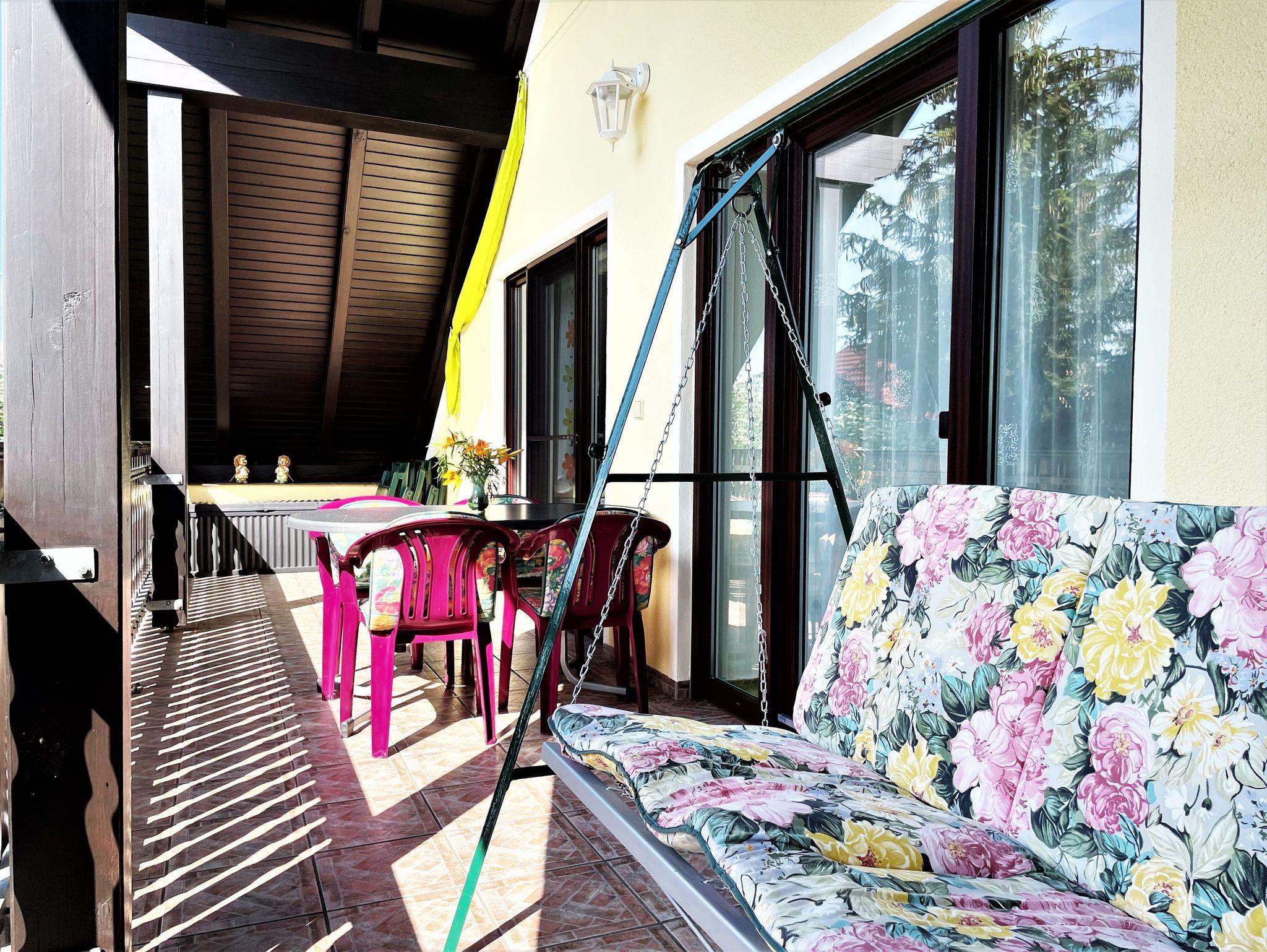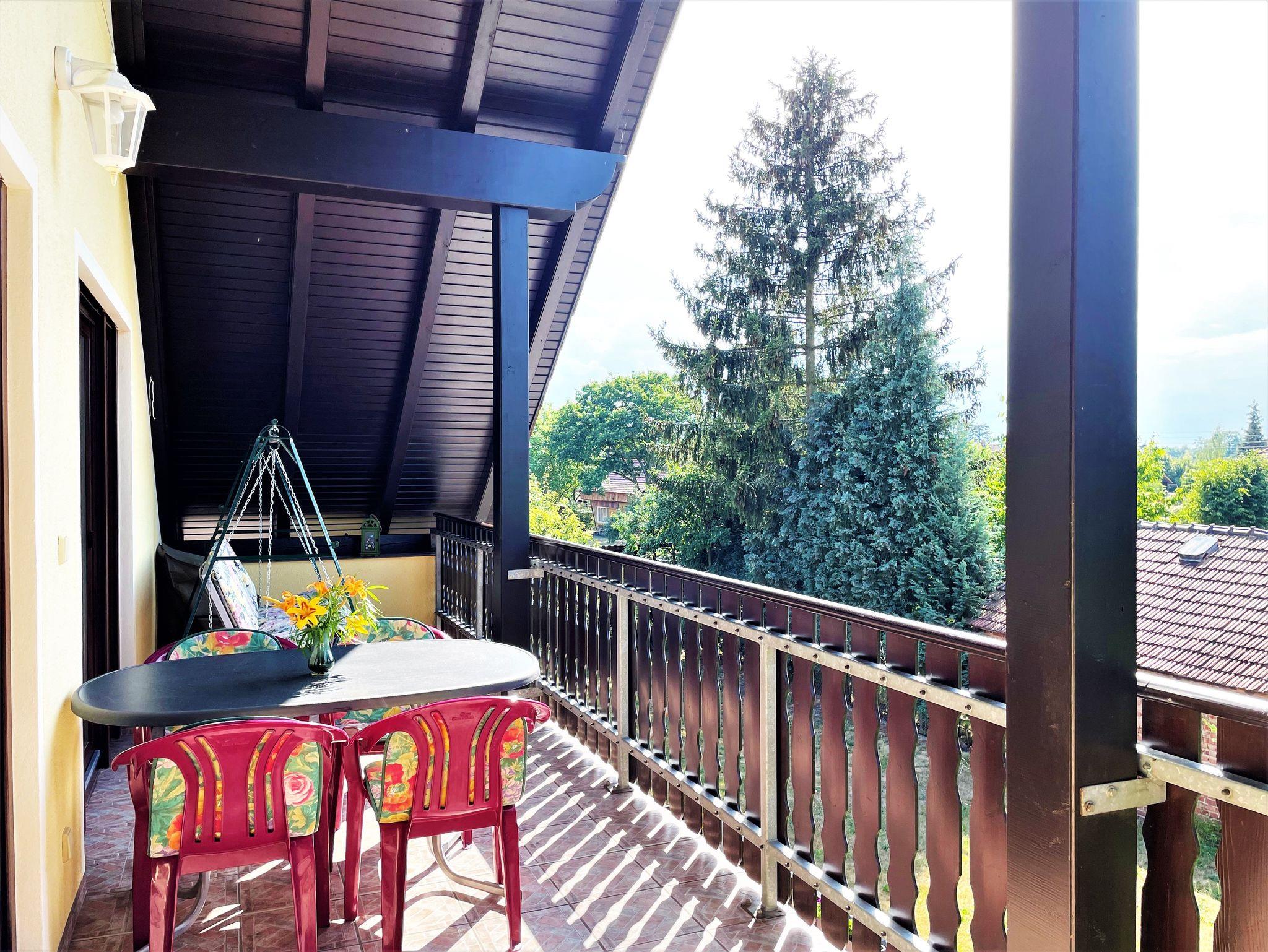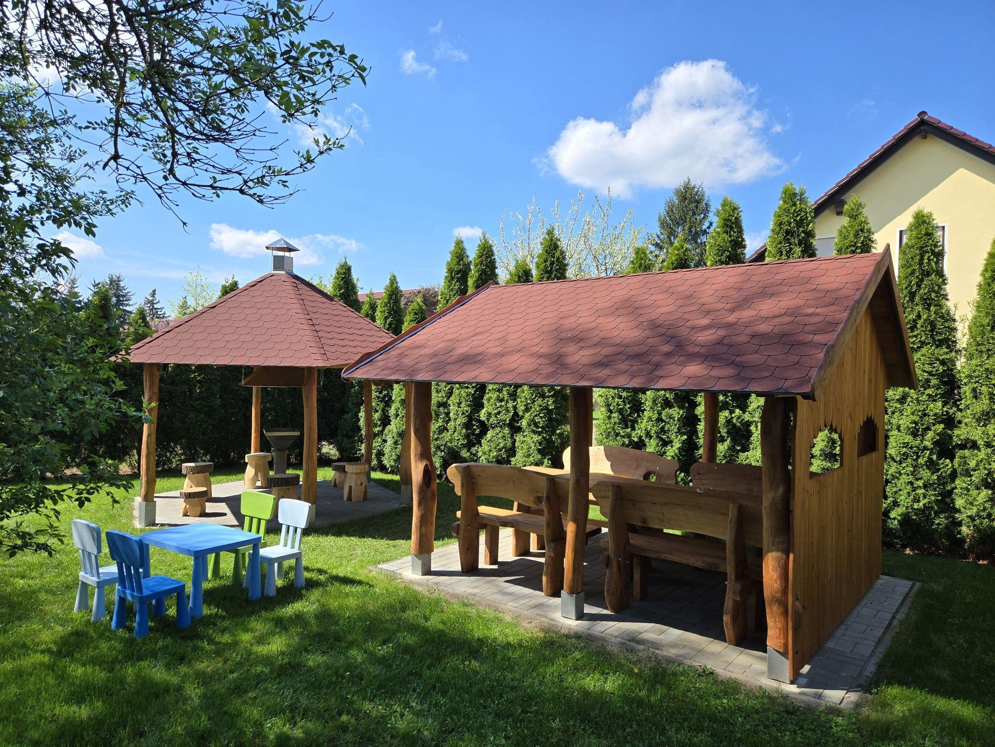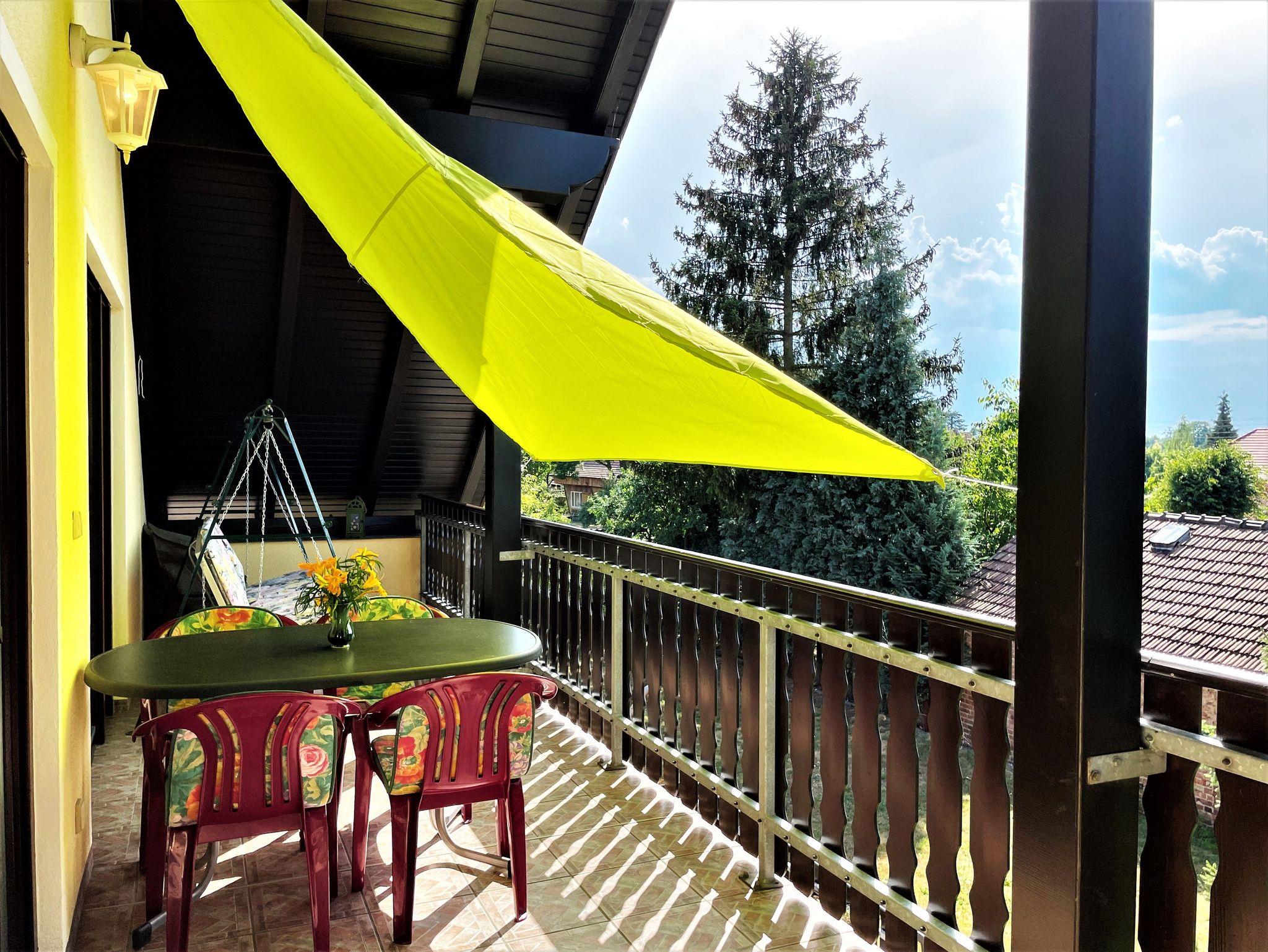 Ein 19 m² großer möblierter Balkon komplettiert die Ferienwohnung und lädt dazu ein, gemütliche Stunden morgens, mittags oder am Abend zu verbringen. An der großen Linde befindet sich der Grillplatz mit einer Grillhütte und einer gemütlichen Sitzhütte.