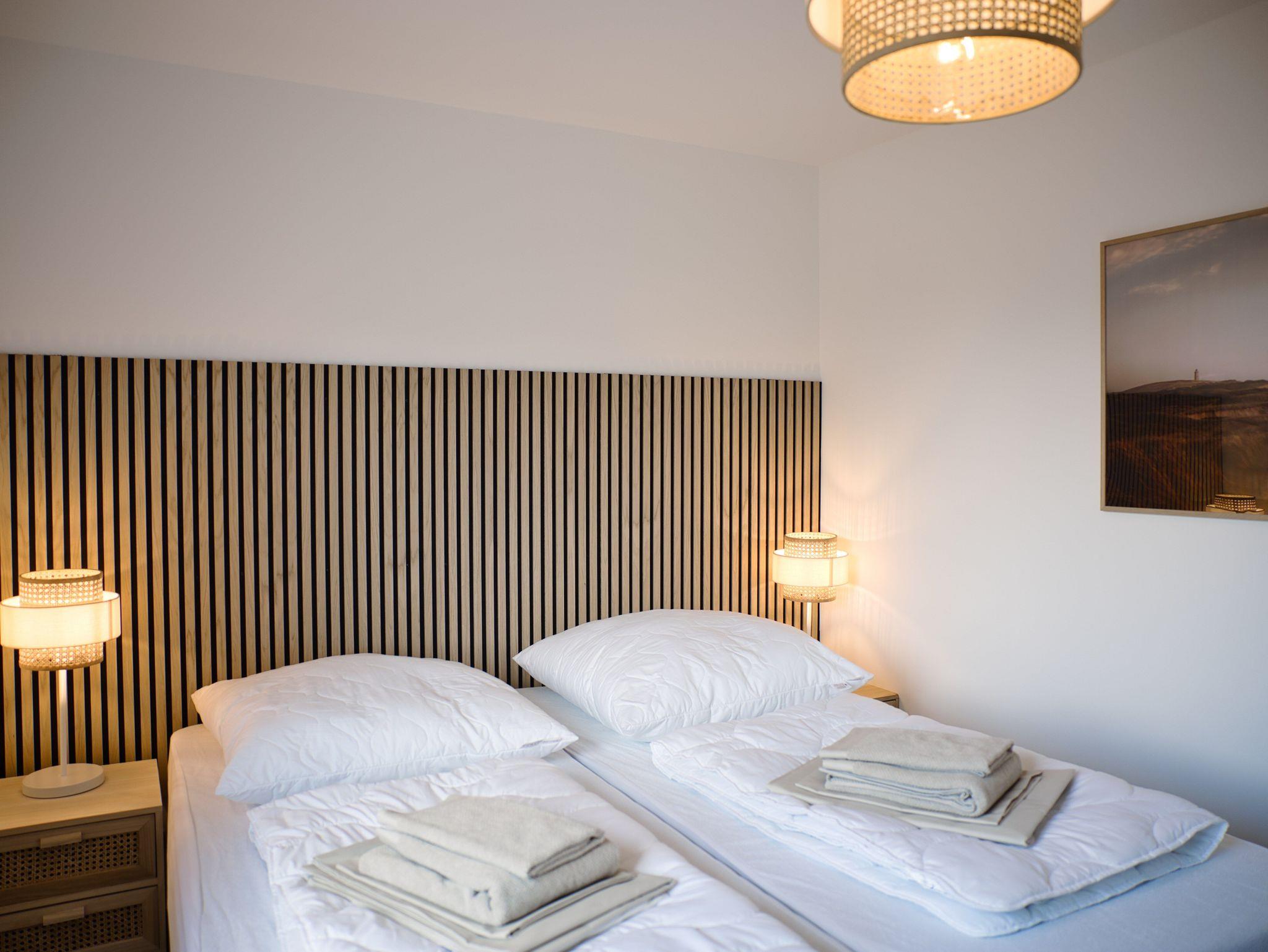 Drei skandinavisch eingerichtete Schlafzimmer bieten ausreichend Platz für sechs (max. sieben) Personen. Die bequemen Betten, mit Deutschlands beliebtester Matratze, kannst du je nach Bedarf als Doppel- oder Einzelbetten nutzen. Im dritten Schlafzimmer wartet ein gemütliches Doppelstockbett mit einer weiteren Aufbettung auf seine Gäste.