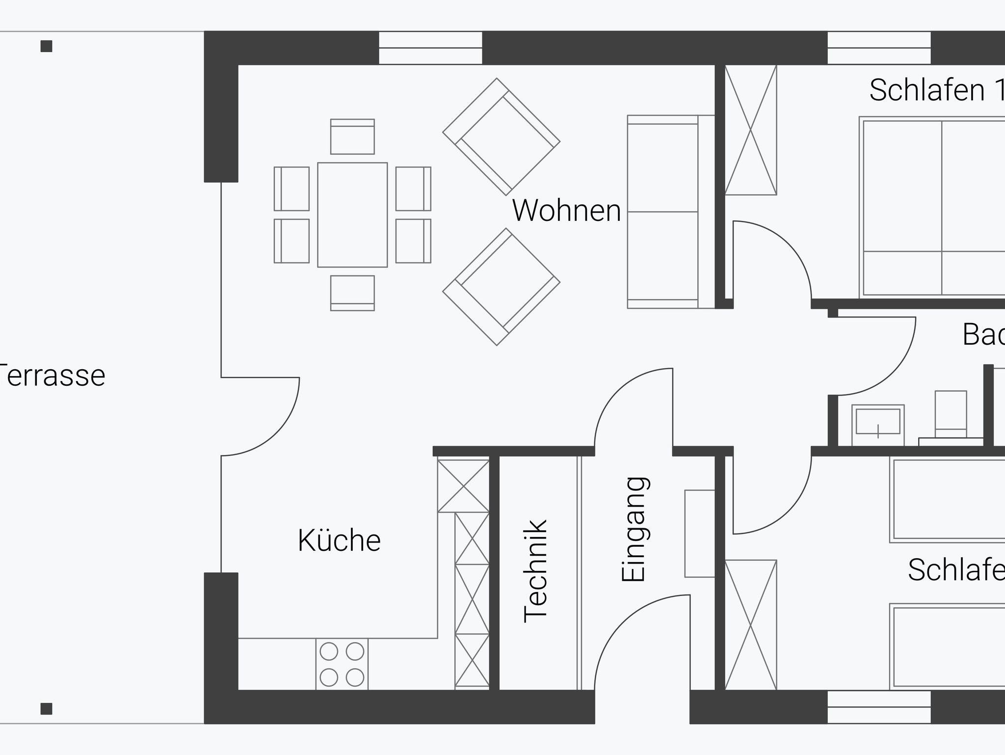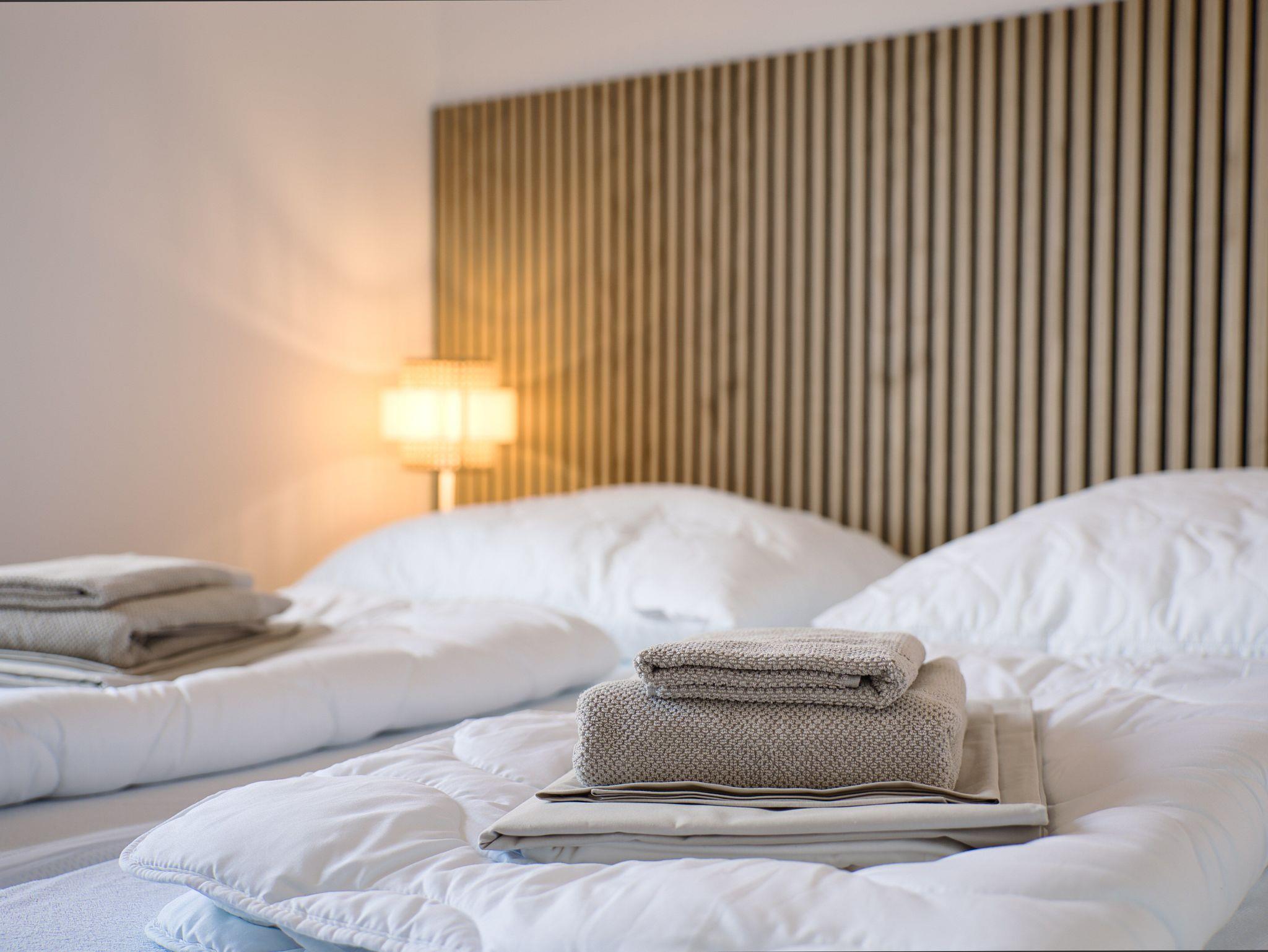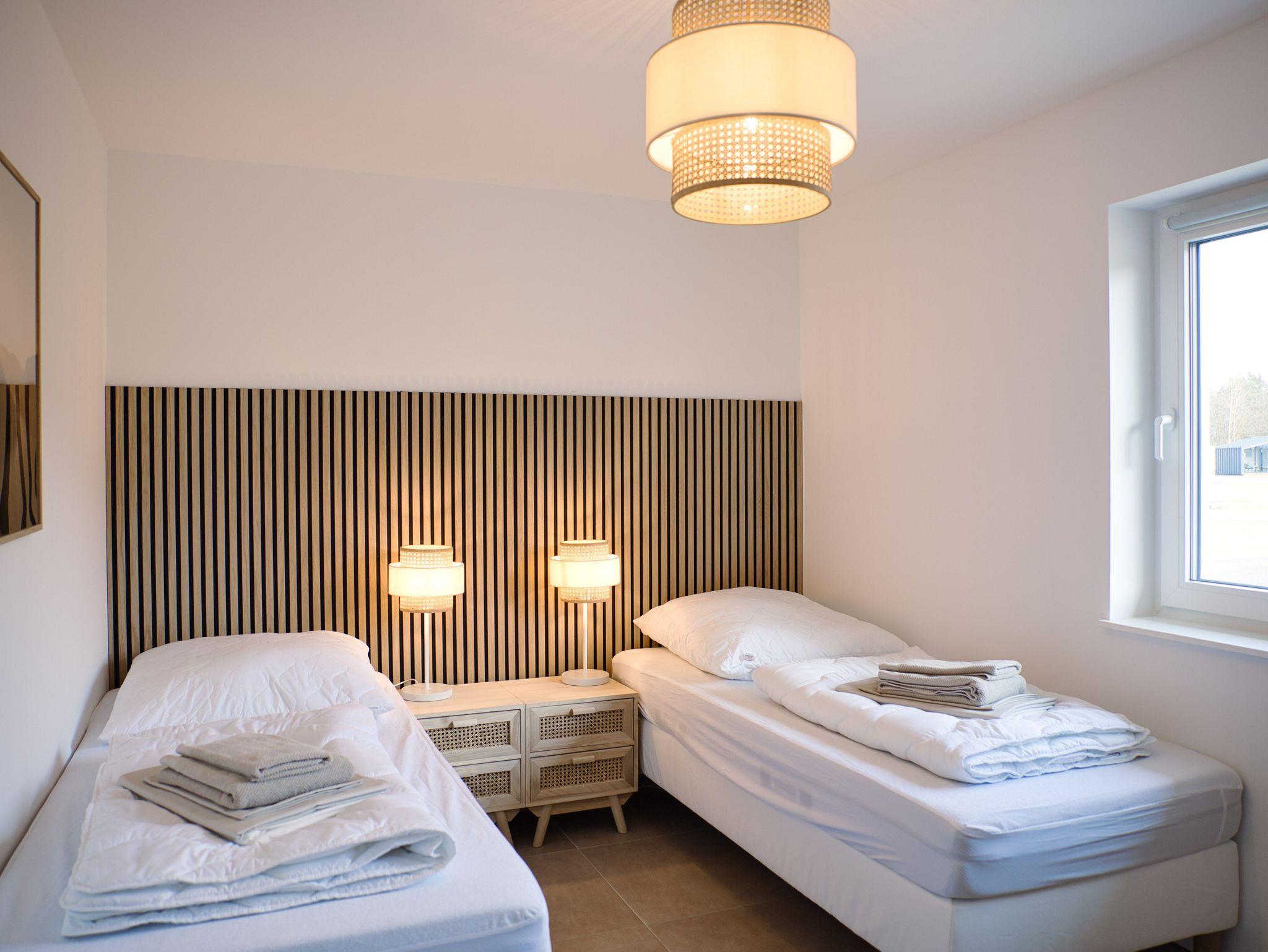 Zwei skandinavisch eingerichtete Schlafzimmer bieten ausreichend Platz für vier Personen. Die bequemen Betten, mit Deutschlands beliebtester Matratze, kannst du je nach Bedarf als Doppel- oder Einzelbetten nutzen.