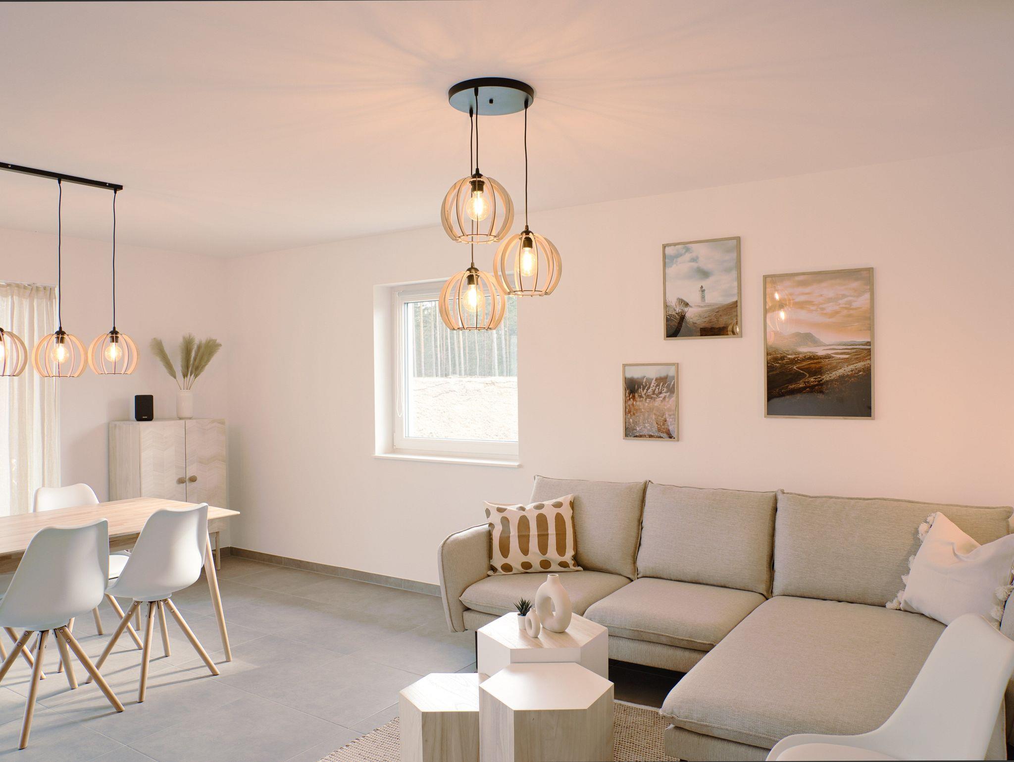 In der gut ausgestatteten Küche mit Induktionsherd und Backofen wird selbst das Zubereiten von leckeren Gerichten ein echtes Erlebnis für dich. Im angrenzenden Essbereich schafft die helle Fensterfront wahre Wohlfühl-Atmosphäre. Der Esstisch sowie die gemütliche Sofaecke finden hier ihren Platz, außerdem ein 55 Zoll Fernseher mit Smart-TV. Liebevolle Details fügen sich in die skandinavische Raumgestaltung ein. Im gesamten Ferienhaus kannst du kostenfreies WLAN (bis zu 250 MBit/s) nutzen.