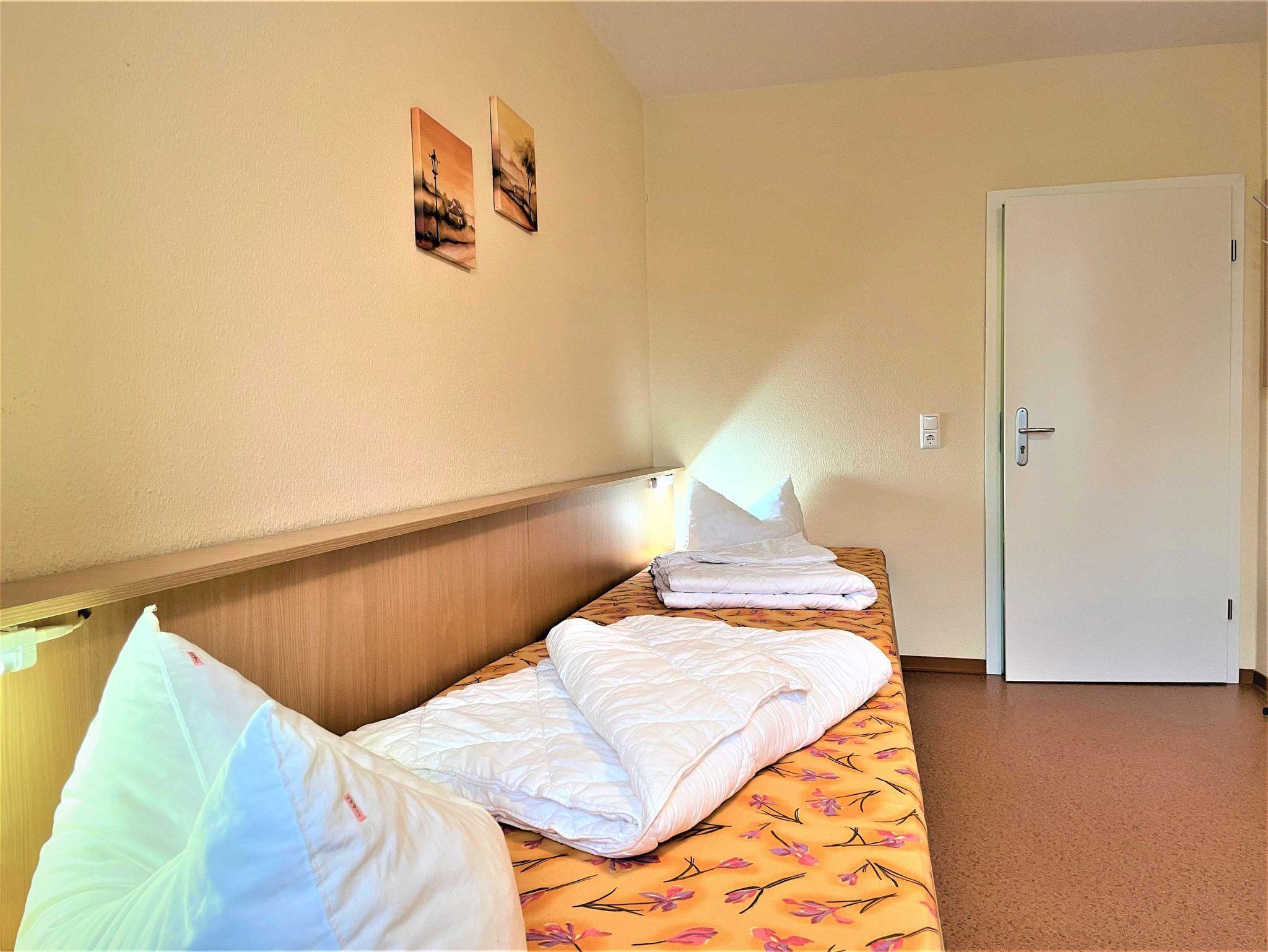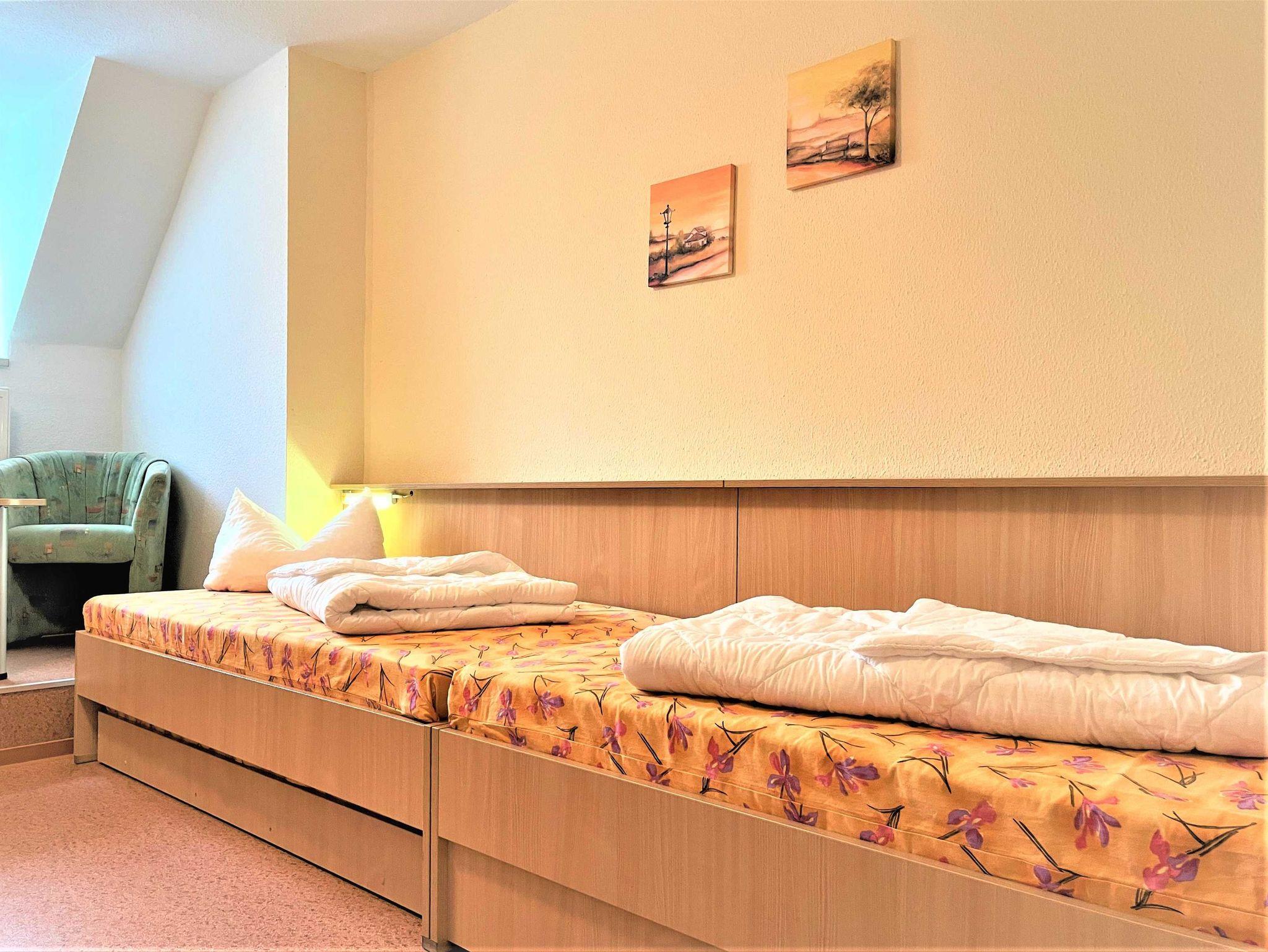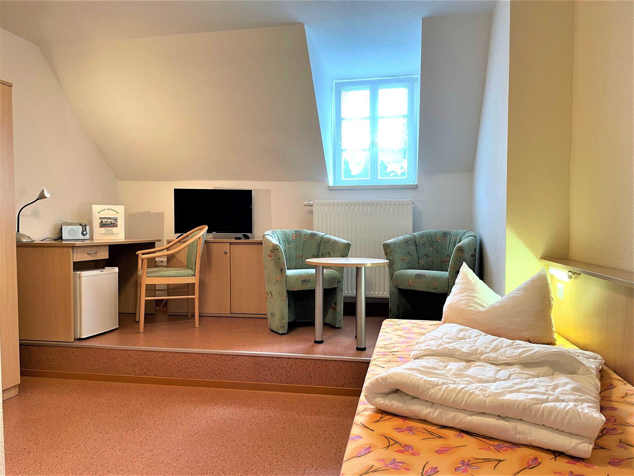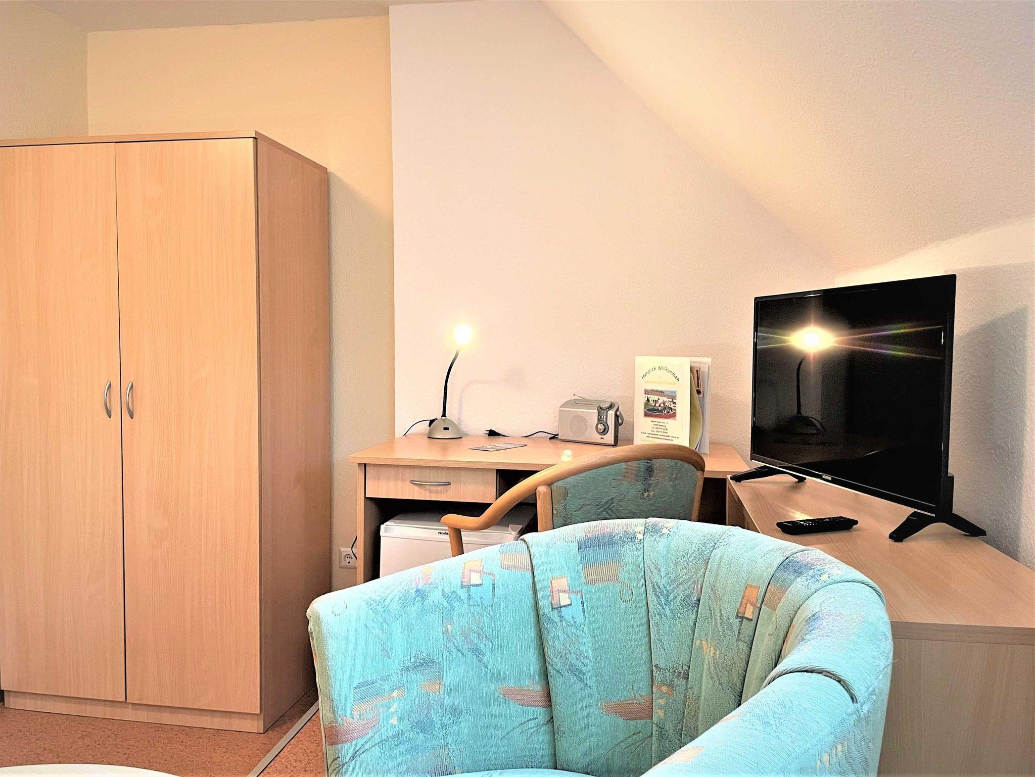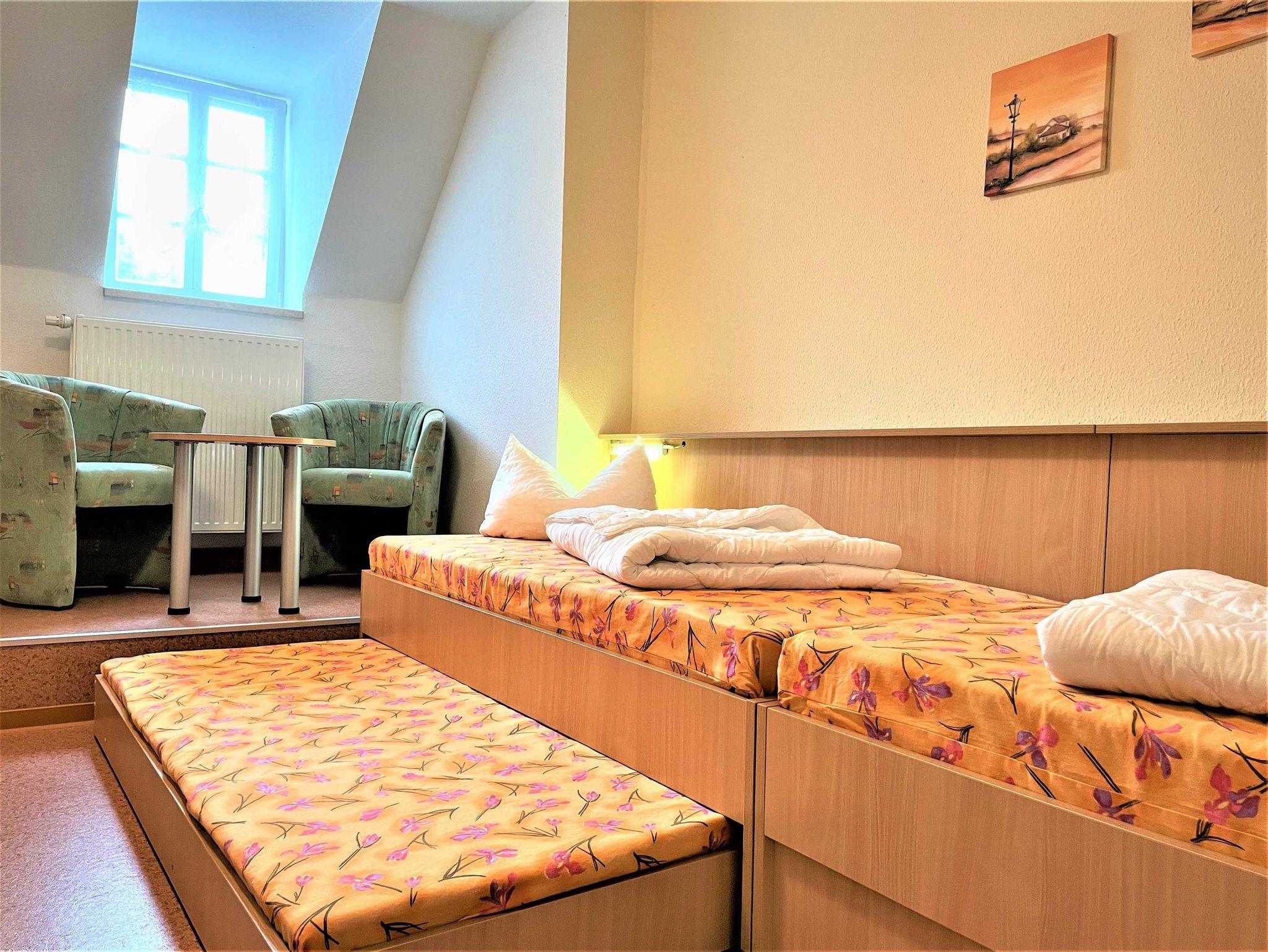 Das Ferienzimmer ist für bis zu 3 Personen geeignet. Er ist mit 2 hintereinander, getrennt stehenden Betten und einem integriertem Rollbett (für 1 Aufbettung) ausgestattet. Weiterhin gibt es eine Sitzecke, ausgerüstet mit einem Tisch und 2 Sessel. Zur Ausstattung gehört ein kleiner Kühlschrank im Zimmer. Für Unterhaltung sorgt ein TV-Flachbildschirm. Ein Bad mit Dusche und WC befindet sich im Zimmer.