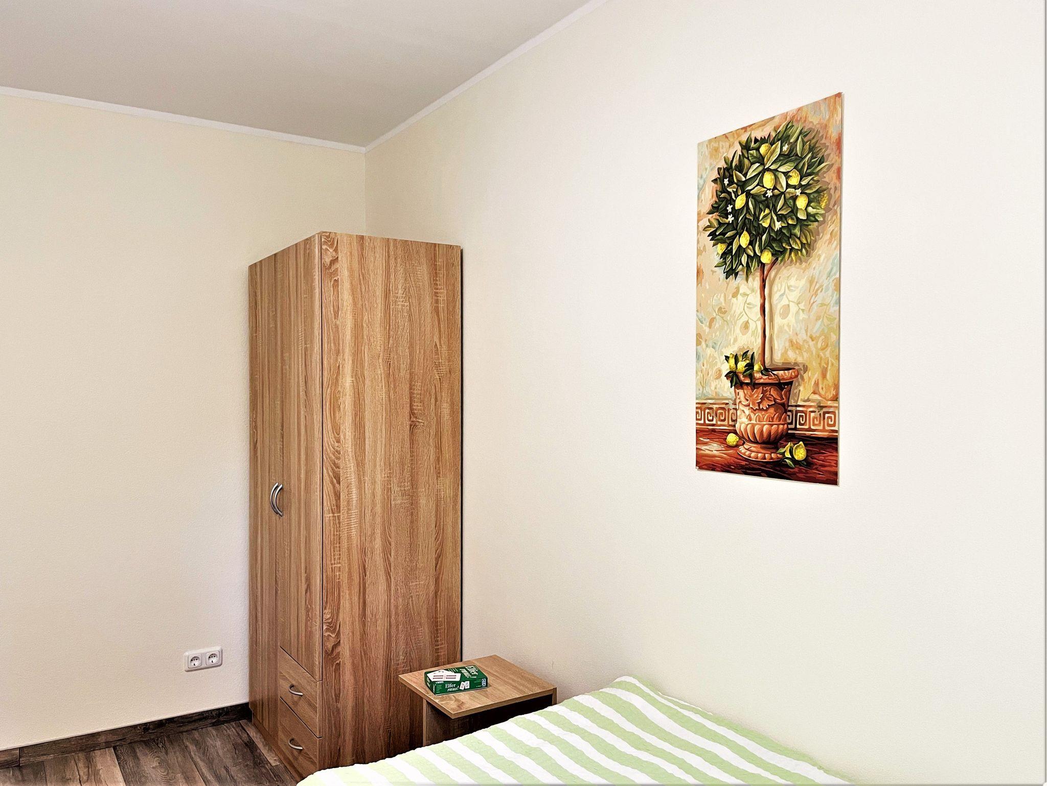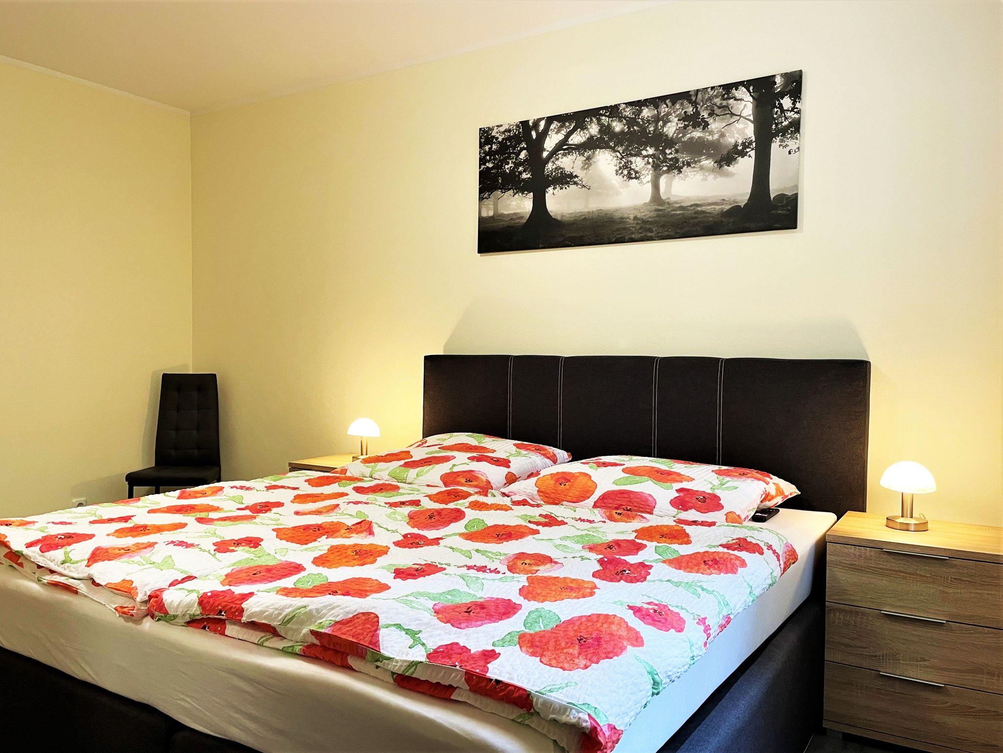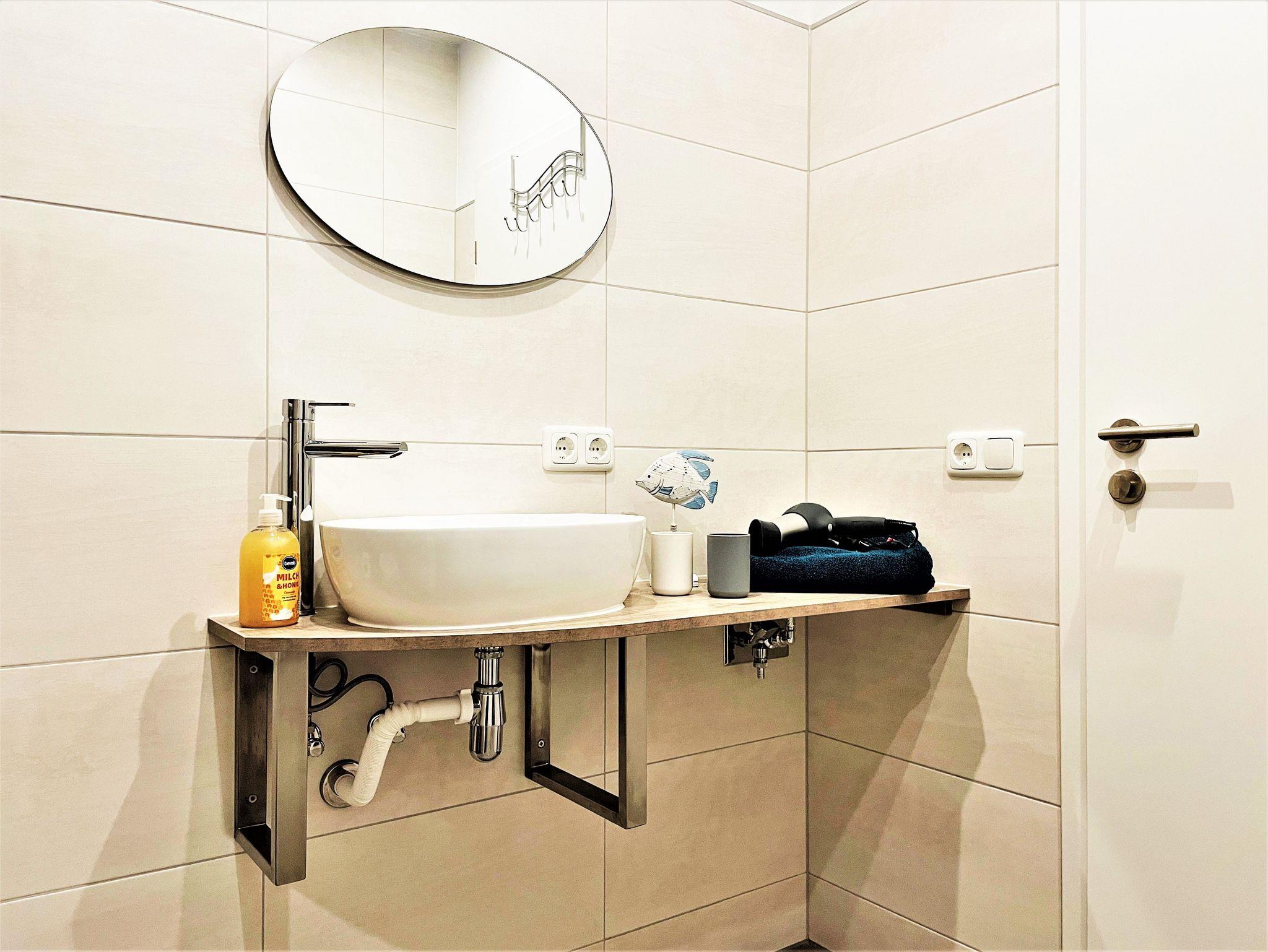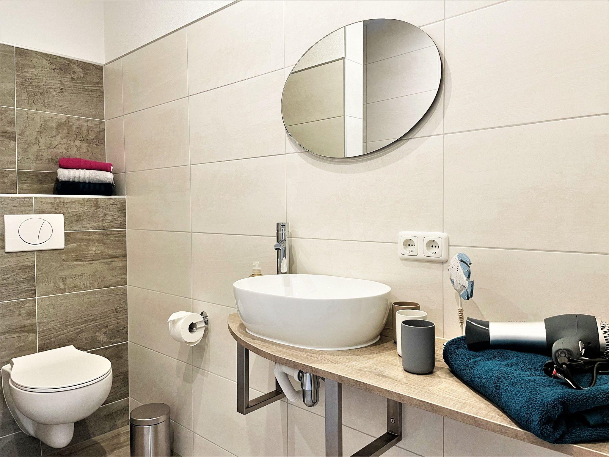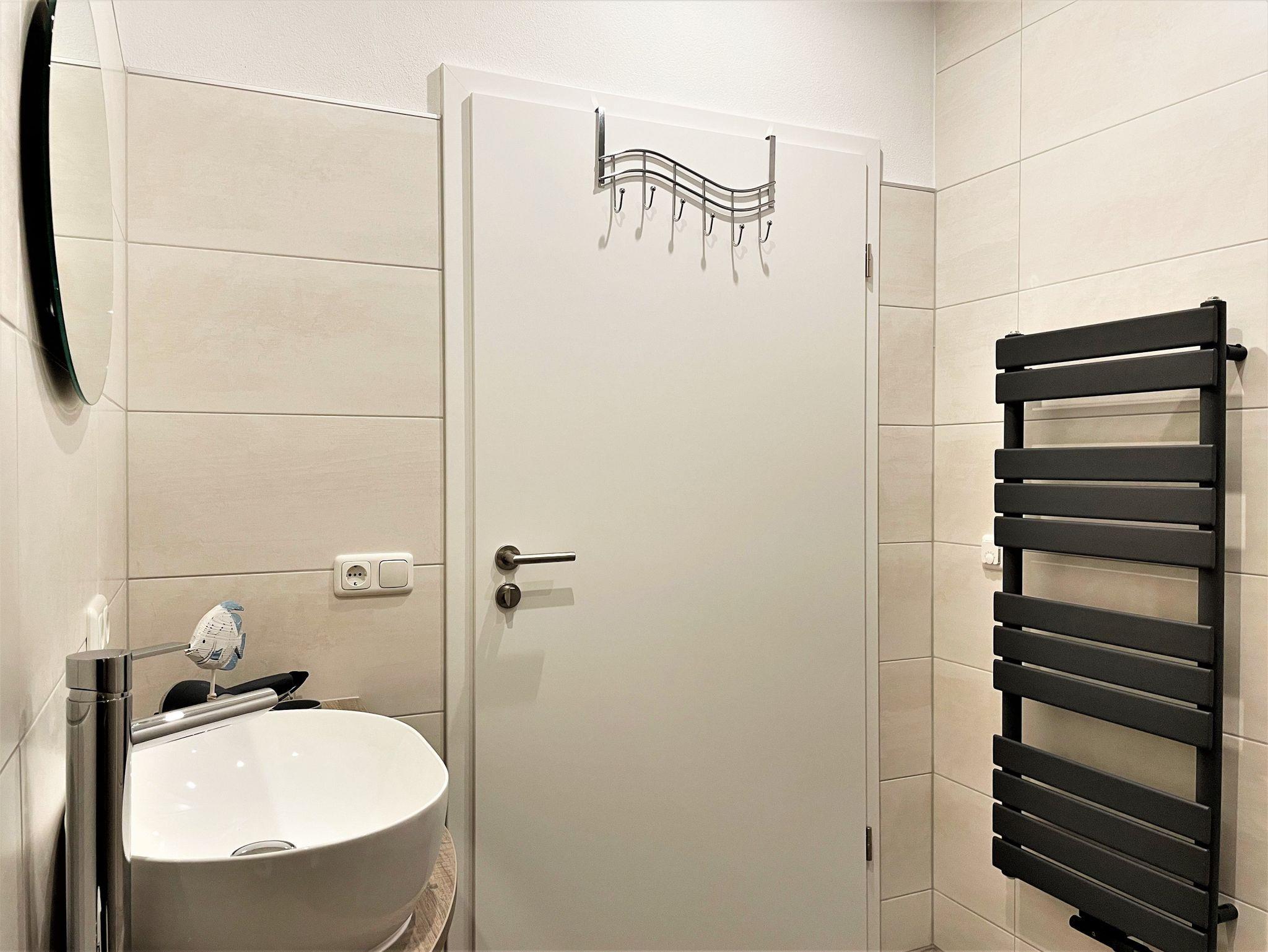 Die helle moderne eingerichtete 57 m² große 3 Raum Ferienwohnung ist für bis zu 6 Personen geeignet. Der große Wohnbereich verfügt über eine offene Küche, diese ist mit Kühlschrank und Gefriermöglichkeit, Geschirrspüler, Mikrowelle und weiteren Annehmlichkeiten ausgerüstet. Weiterhin befinden sich darin ein Esstisch und ein Sofa, welches für eine Aufbettung dient. Ein Schlafzimmer ist mit einem Boxspringbett (1,80 m x 2,00 m) und einem Kleiderschrank möbliert. Im 2. Schlafzimmer stehen 2 getrennt stehende Betten sowie ein Kleiderschrank zur Verfügung. Das stilvolle und moderne Bad ist mit einer ebenerdigen Dusche, WC und einem Waschtisch mit Spiegel ausgestattet. Alle Zimmer verfügen über Fußbodenheizung und großen TV-Flachbildschirm.