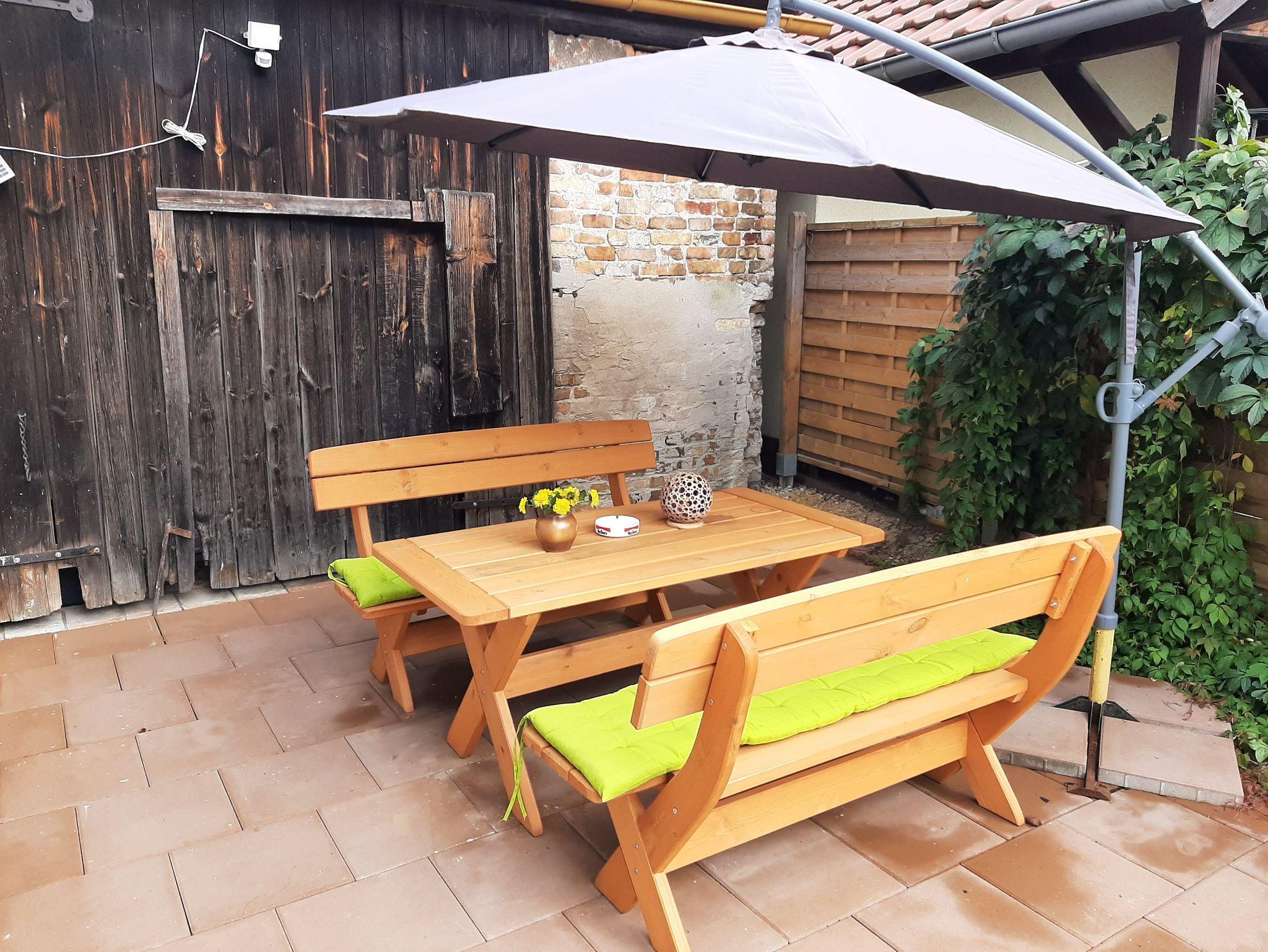 Zur Ferienwohnung gehört ein möblierter Außenbereich. Hier können Urlauber einen erlebnisreichen Urlaubstag bei einem schönen Essen und einem Gläschen Wein ausklingen lassen.