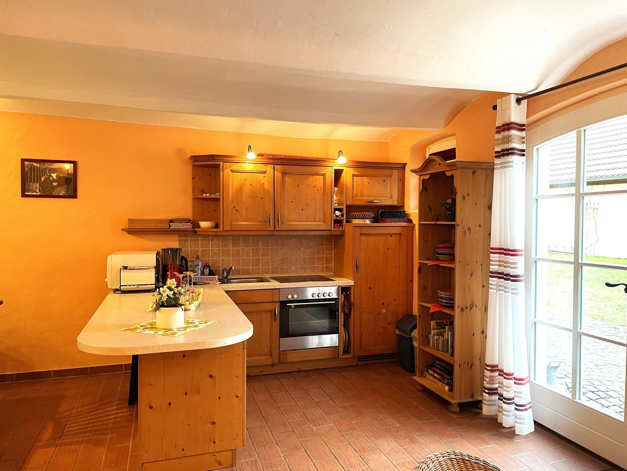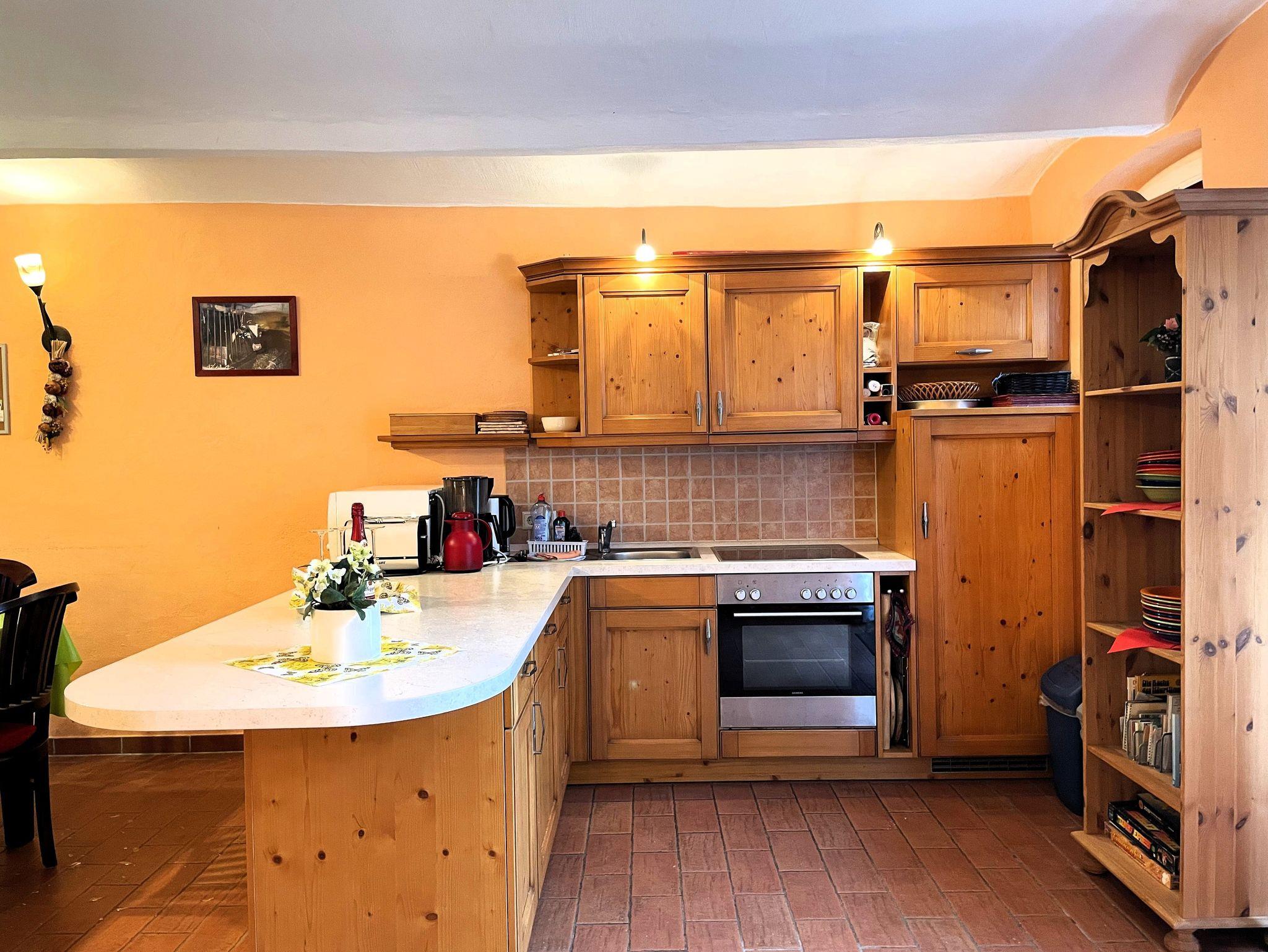 Die offene Küche ist komplett ausgestattet mit Kühlschrank mit Gefrierfach, Backofen, Geschirrspüler, Kaffeemaschine, Wasserkocher und weiteren nützlichen Küchenutensilien.