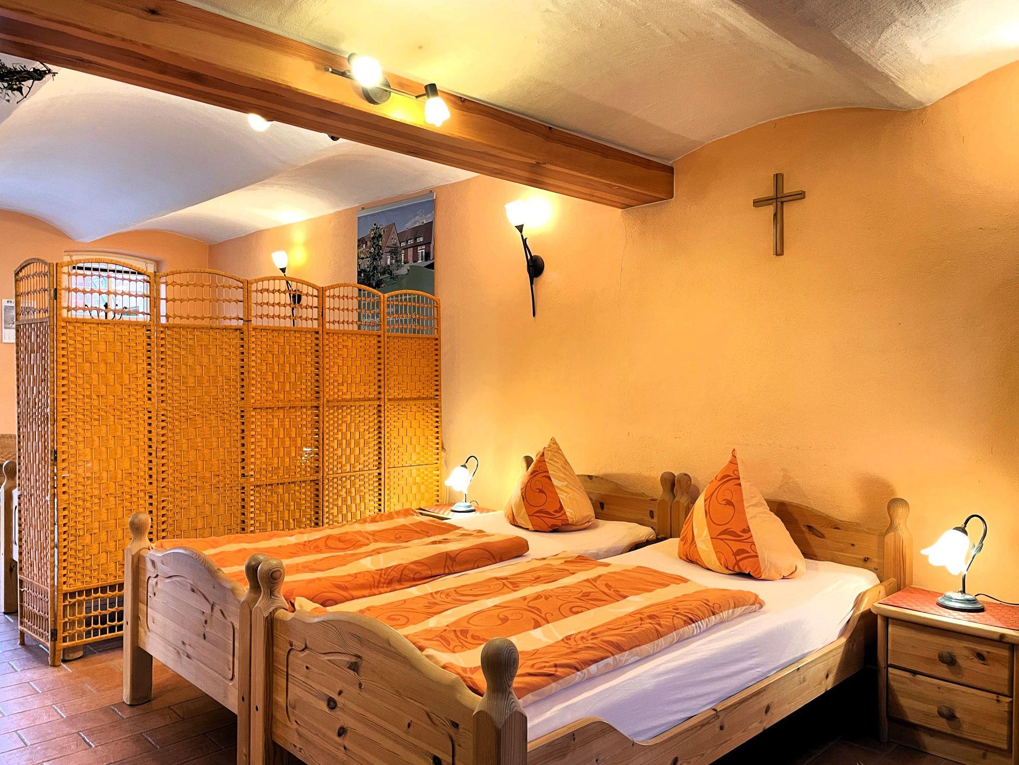 Die Ferienwohnung bietet eine besondere Übernachtungsmöglichkeit für 2 Personen. Auf Anfrage kann ein Kind bis 14 Jahre in einem transportablen Gästebett (0,80 x 1,90 m) übernachten. Für ein Kleinkind bis 3 Jahre steht ein Babybett zur Verfügung.