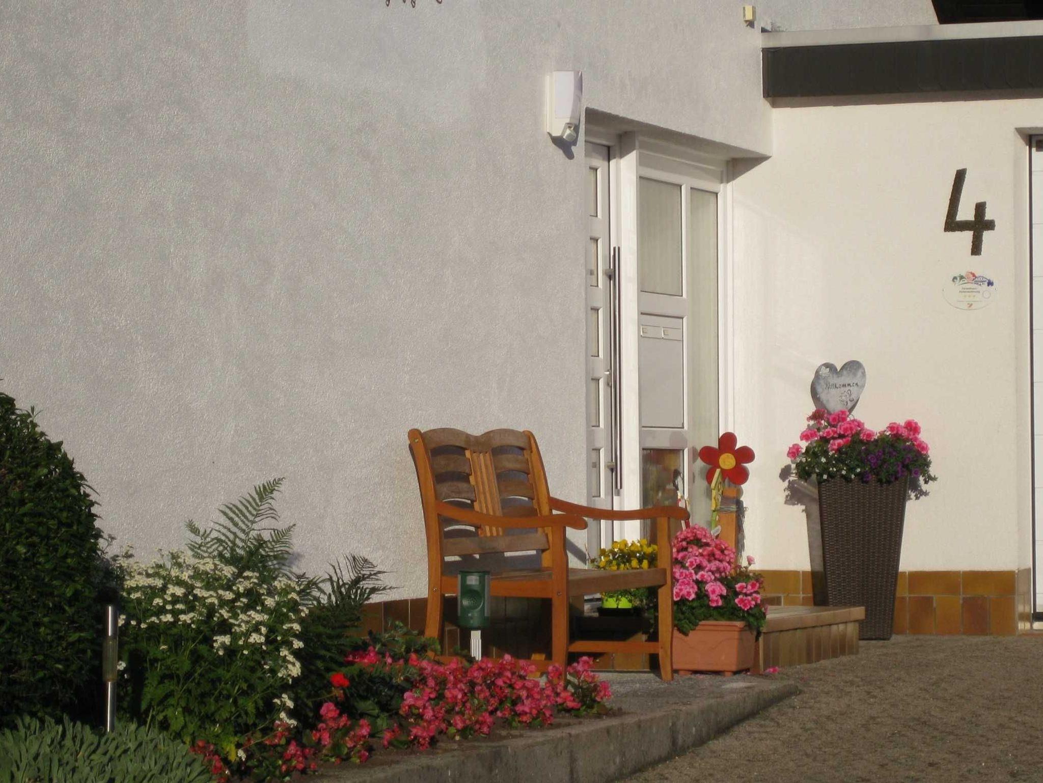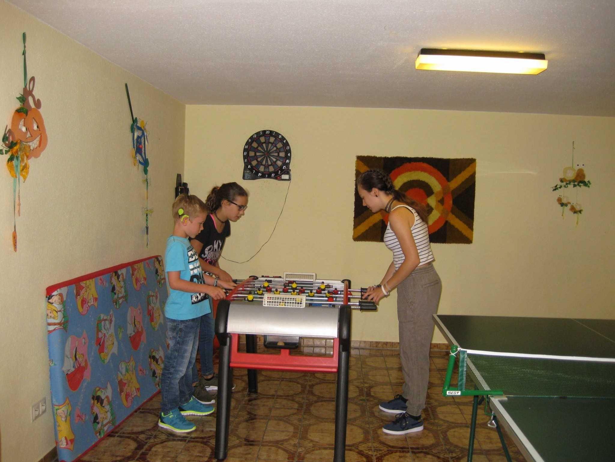 3 Raum Ferienwohnung (77qm), ein Doppelzimmer, ein Dreibettzimmer, eine komplett eingerichtete Wohnküche, Bad/Dusche, zusätzliches WC, Waschmaschine, Farb-Sat-TV, Balkon, Kinderbett, Liegewiese, Grill, Parkplatz am Haus. Grosses Spielzimmer mit Tischtennis, Tischfussball, elektronische Dartscheibe, Kindertrampolin. Sauna, Rotlichtkabine