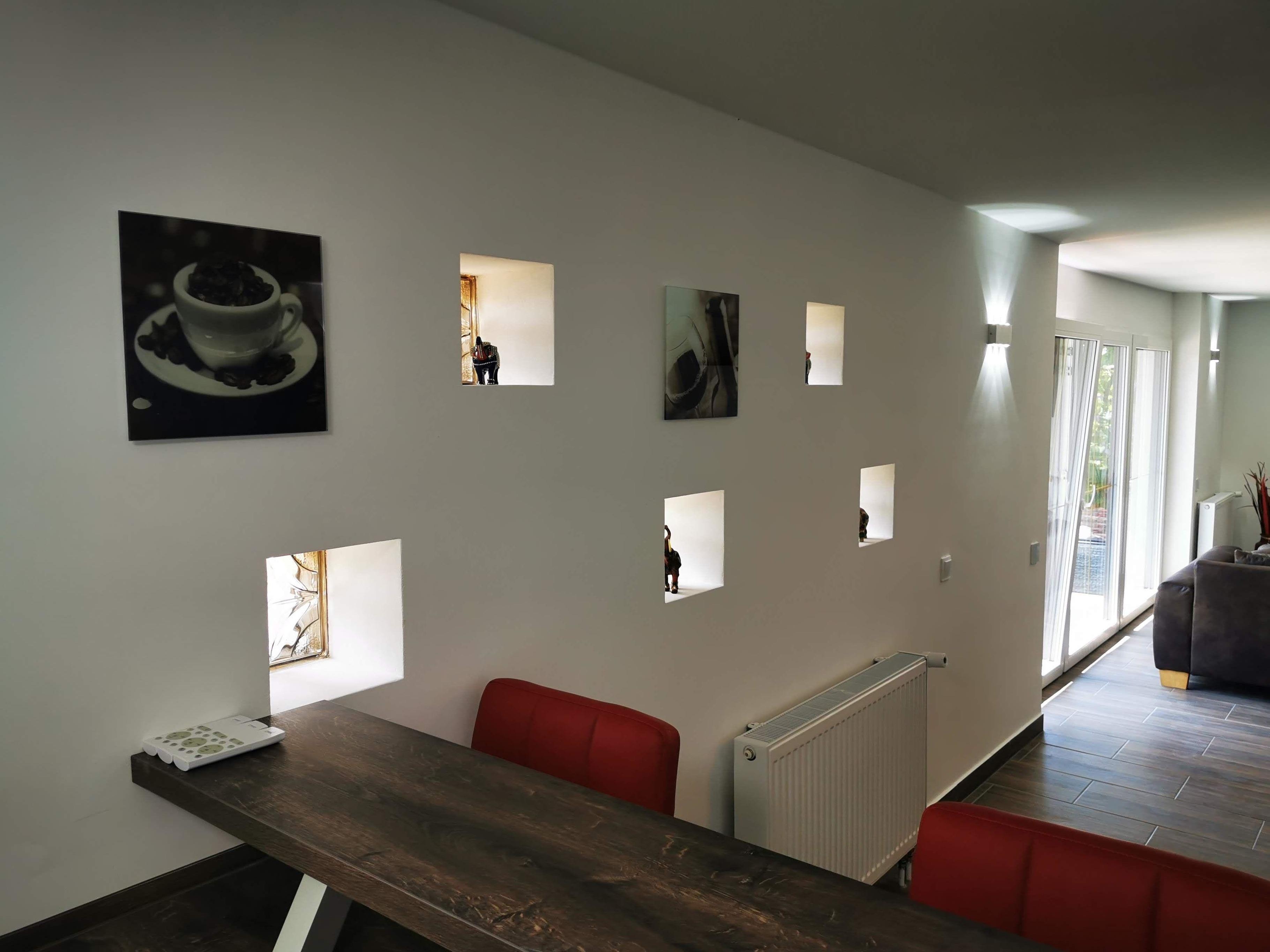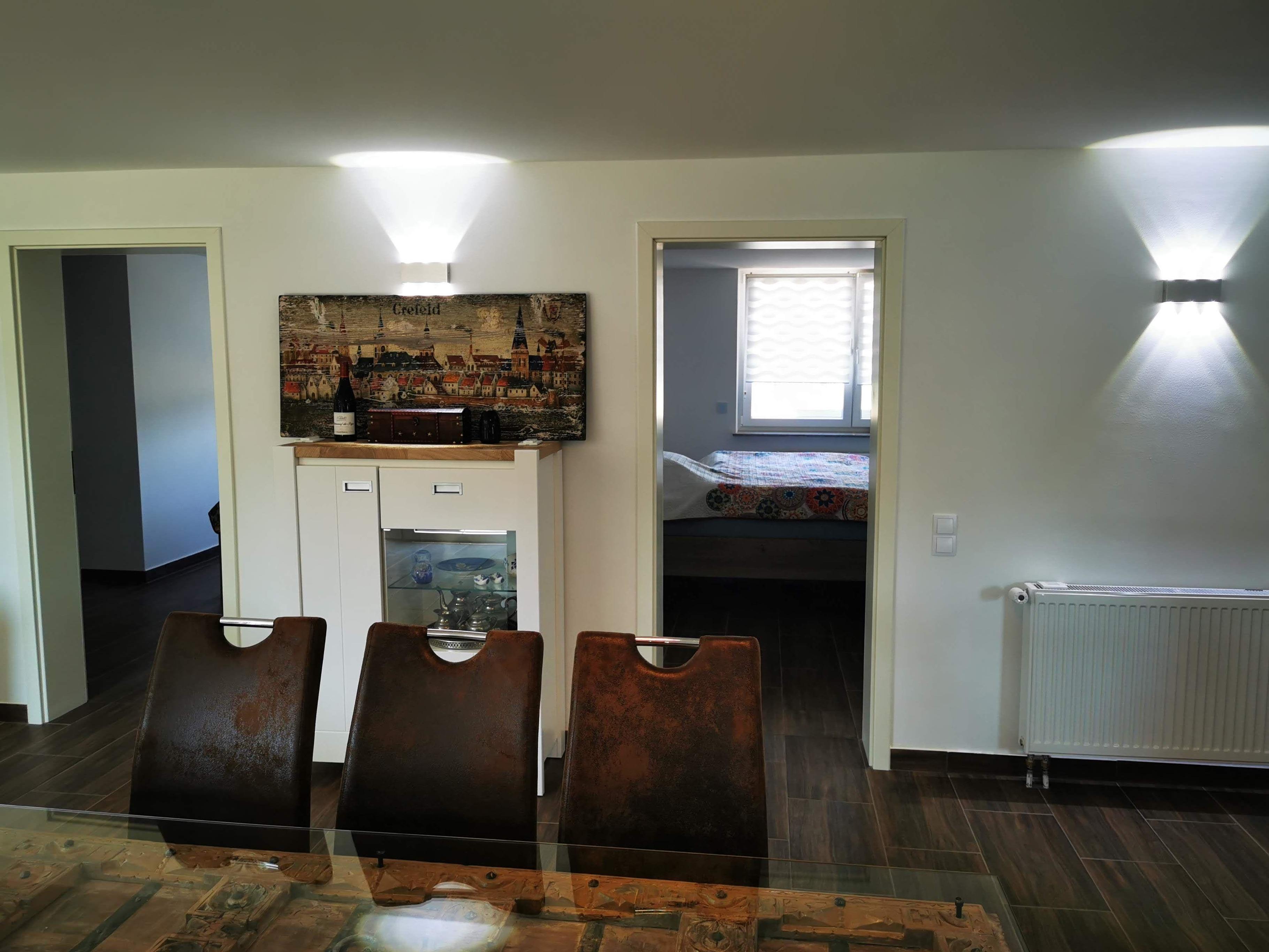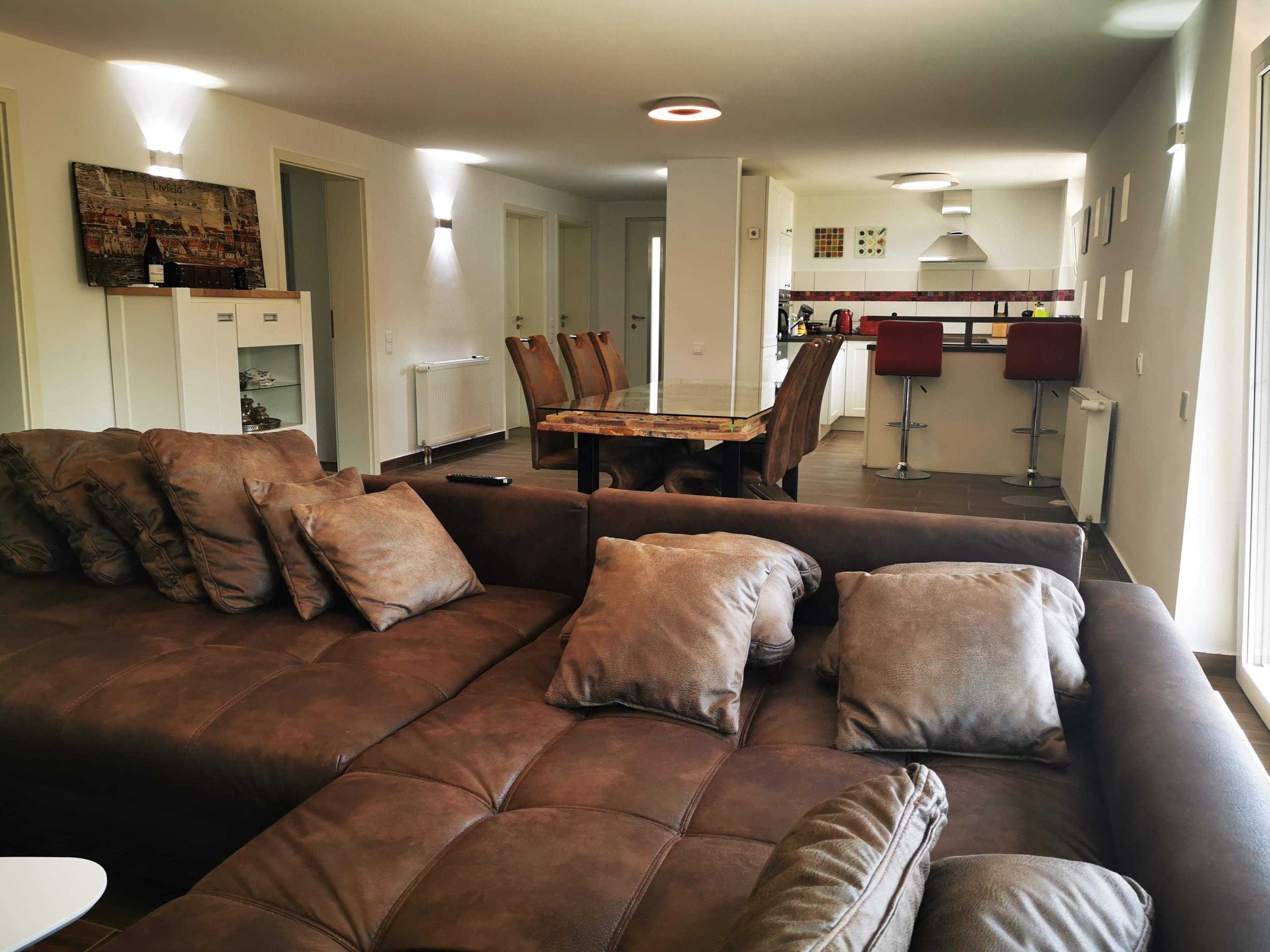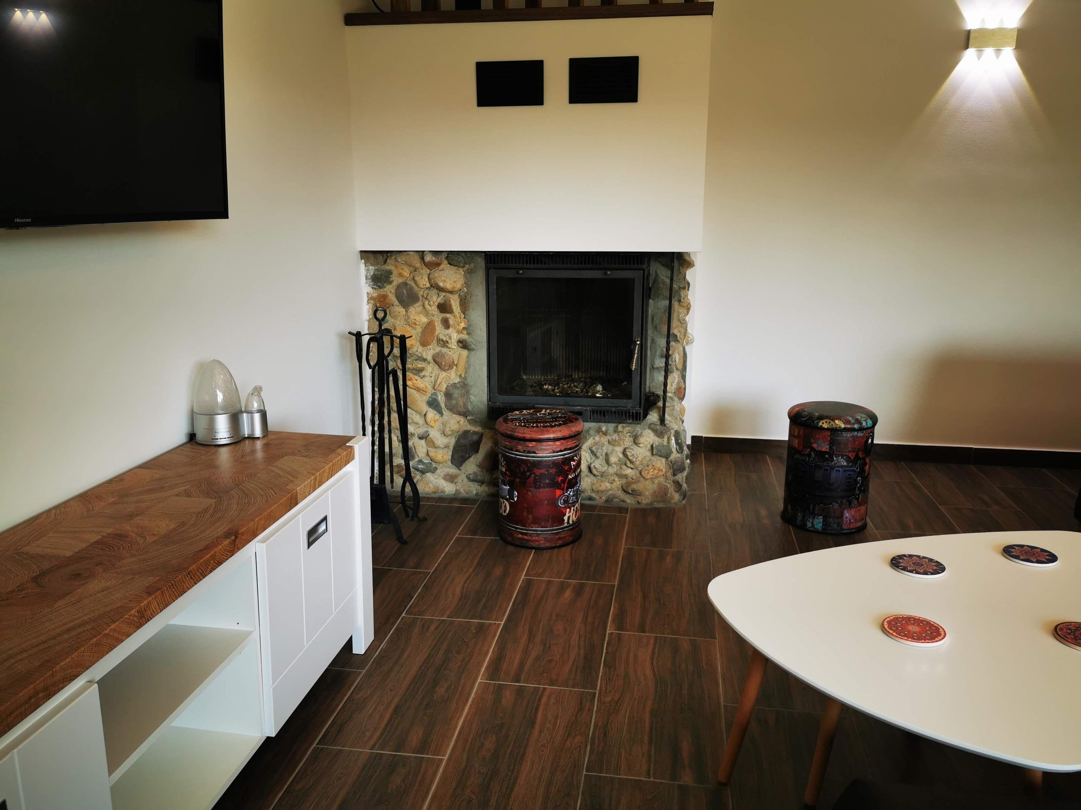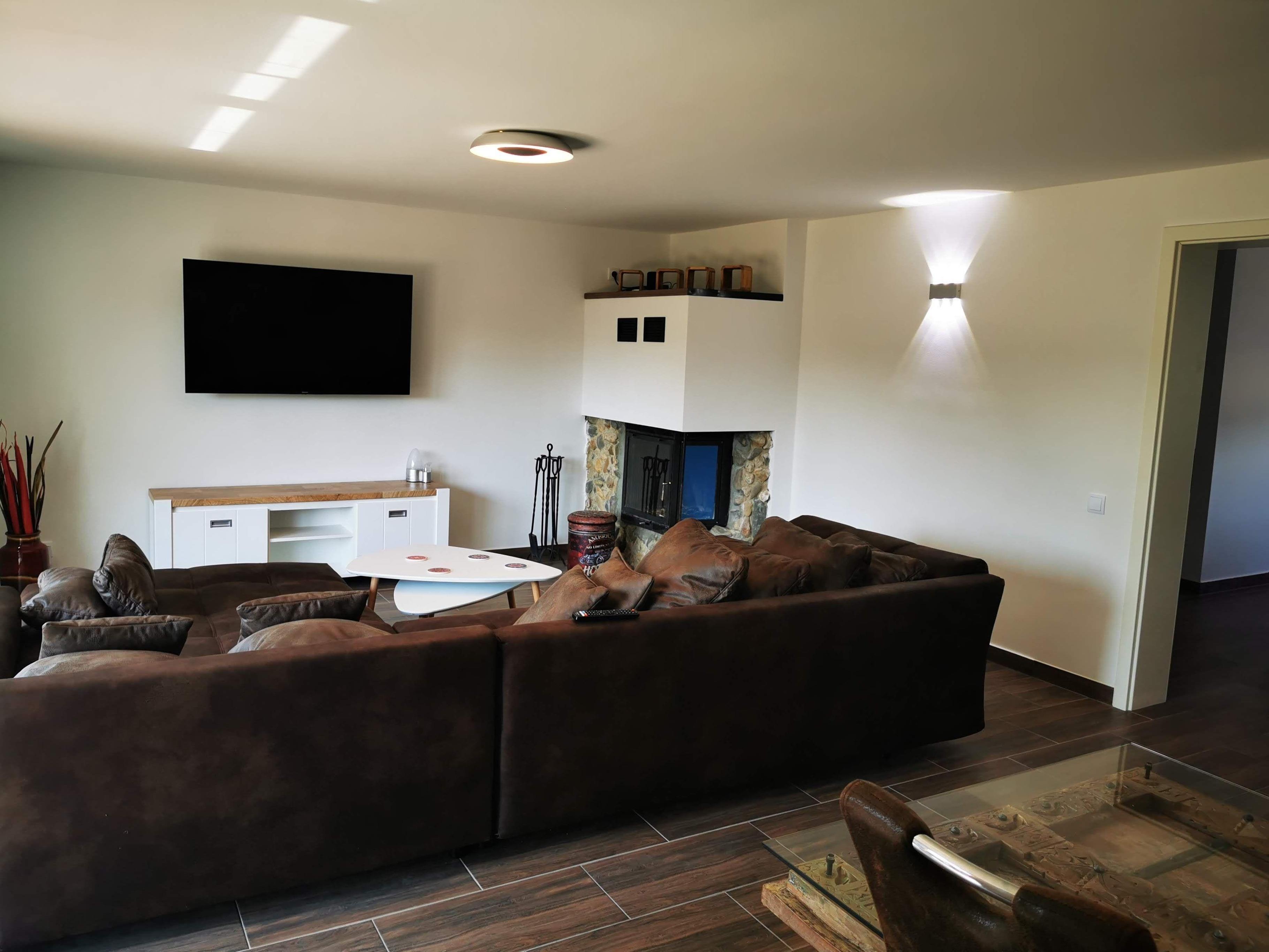 Das Wohnzimmer bietet ein großes, gemütliches Sofa mit Sitzmöglichkeiten für bis zu 6 Personen, einen Kaminofen (Kaminholz wird im Winter kostenlos zur Verfügung gestellt) sowie ein 55 Zoll UHD Smart-TV. Gemeinsam kann man dort mit der Familie oder mit Freunden vor dem Kamin ein Glas Wein trinken oder auch den Abend mit einem Film ausklingen lassen. Auf Anfrage wird Ihnen ein Netflix-Konto für die Zeit Ihres Aufenthalts zur Verfügung gestellt.
