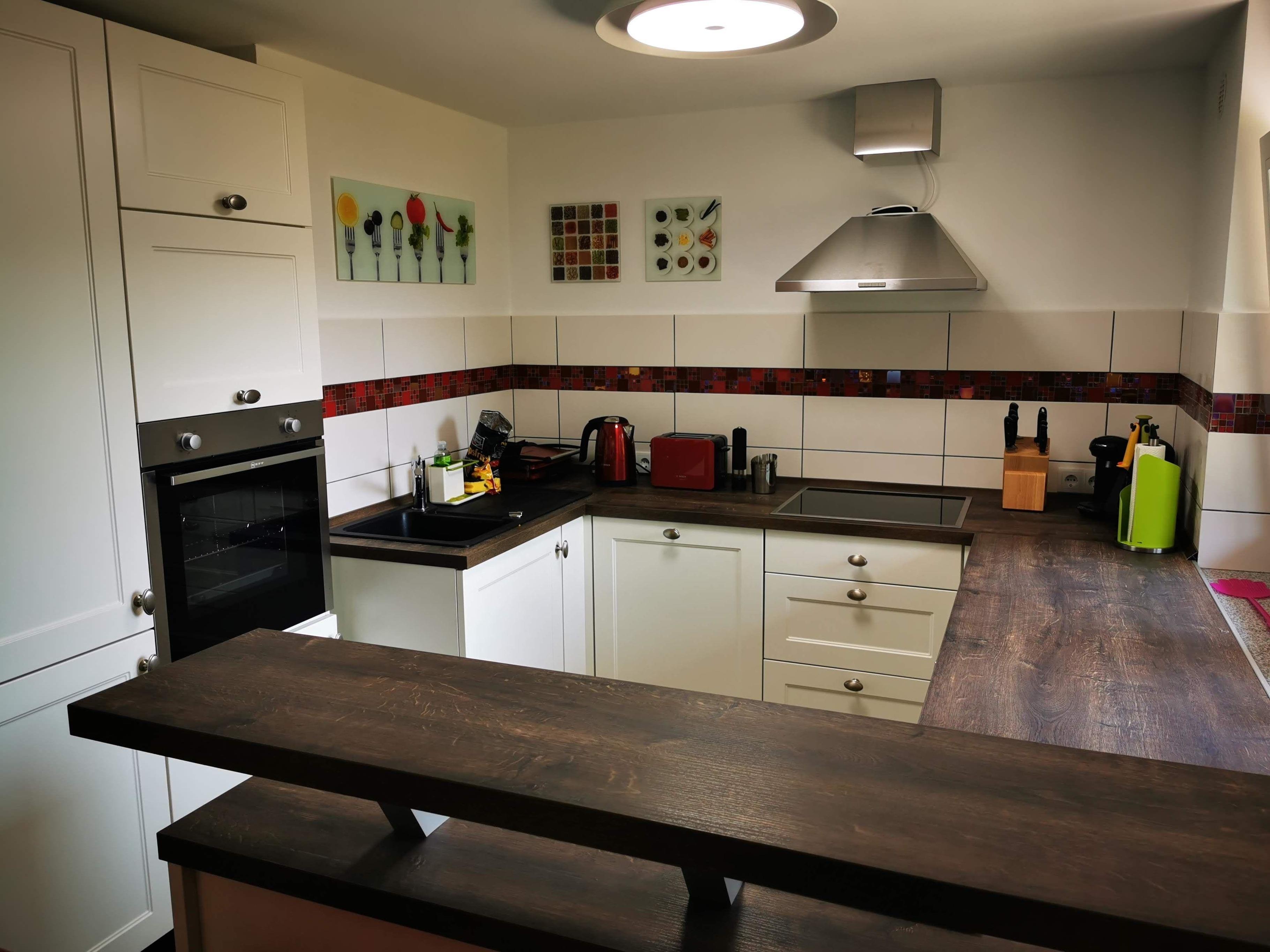 Unsere offene, modern und großzügig ausgestattete Küche bietet Geschirr, Töpfe und alles andere, was Sie zum Kochen brauchen. Der Elektroherd mit Ceran Kochfeld und Backofen, der Kühlschrank mit Gefrierfach, die Geschirrspülmaschine, die Mikrowelle, die Kaffeemaschine, der Toaster, etc… sind allesamt qualitativ hochwertige Geräte namhafter Hersteller. Kochutensilien, Gewürze, Kaffeekapseln, Reinigungsmittel, etc… sind immer vorhanden. Als kleines Extra befinden sich in der Küche zwei Barhocker, wo Sie morgens einen Kaffee trinken können oder abends Ihren Geliebten beim Kochen zuschauen können.