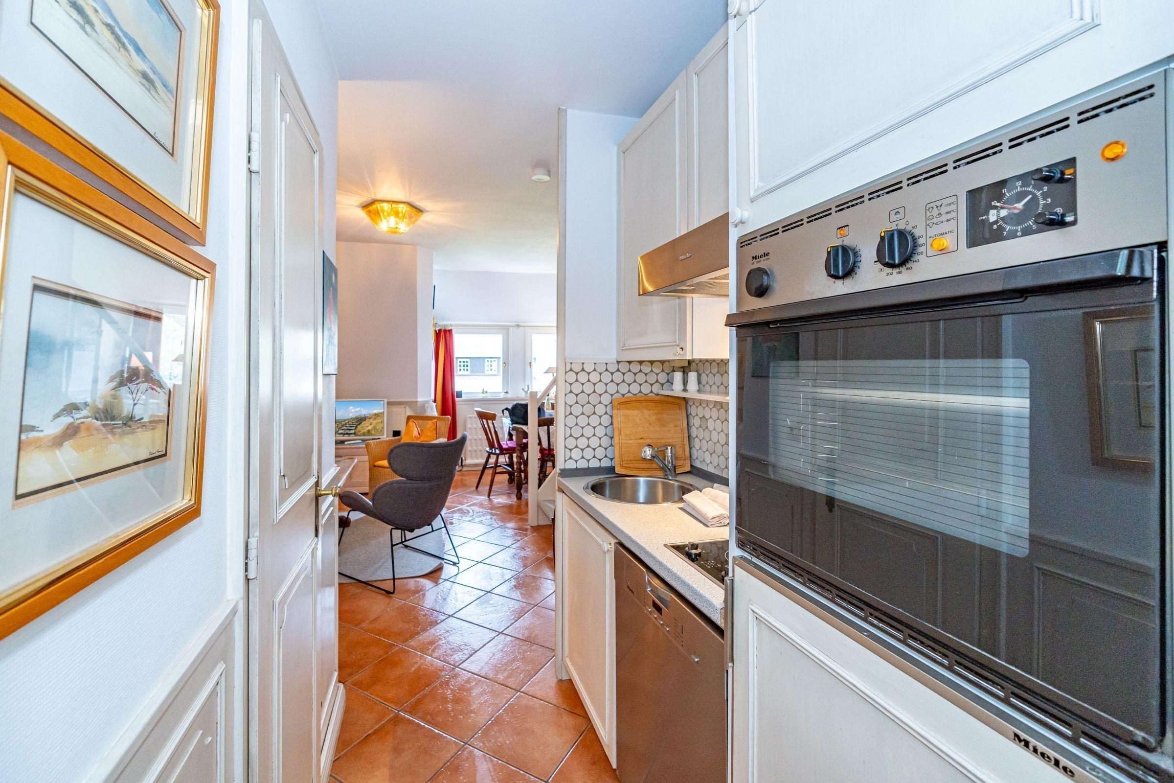 Die Wohnung befindet sich im ersten Stock umfaßt drei Zimmer: Wohnzimmer und Schlafzimmer. Ein Einbauschrank und ein großer Kleiderschrank bieten großzügigen Stauraum. Wohnzimmer und Schlafraum sind mit je 1 Farbfernseher ausgestattet. Im Wohnzimmer zusätzlich eine DVD-CD-Anlage mit Radio. Die Küche hat einen 2-Plattenherd, einen Backofen, einen Kühlschrank, einen Geschirrspüler, alle möglichen Kochutensilien. Vom Essbereich genießen Sie einen herrlichen Blick über das Wattenmeer. Ein Kinderbett und ein Hochstuhl stehen für unsere kleinen Gäste bereit (ohne Berechnung).