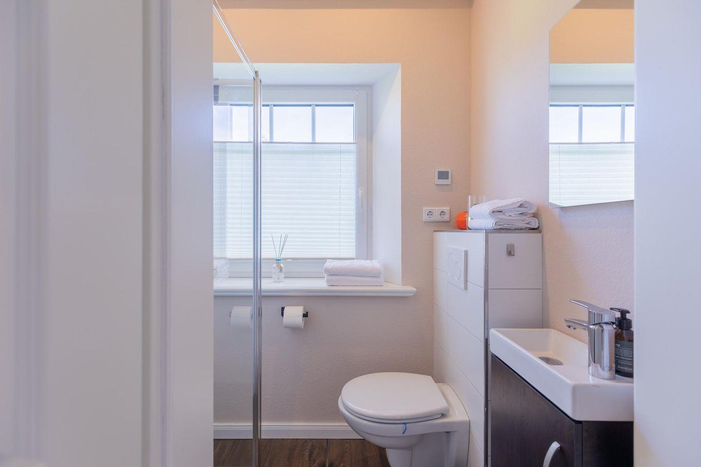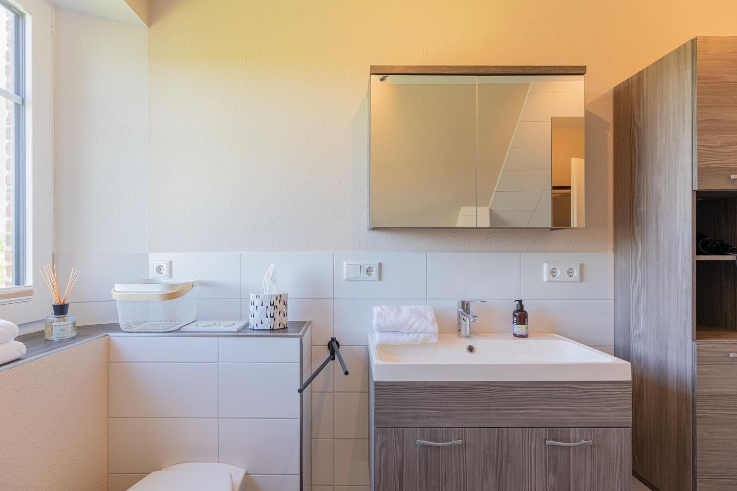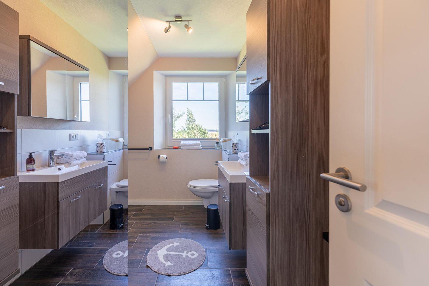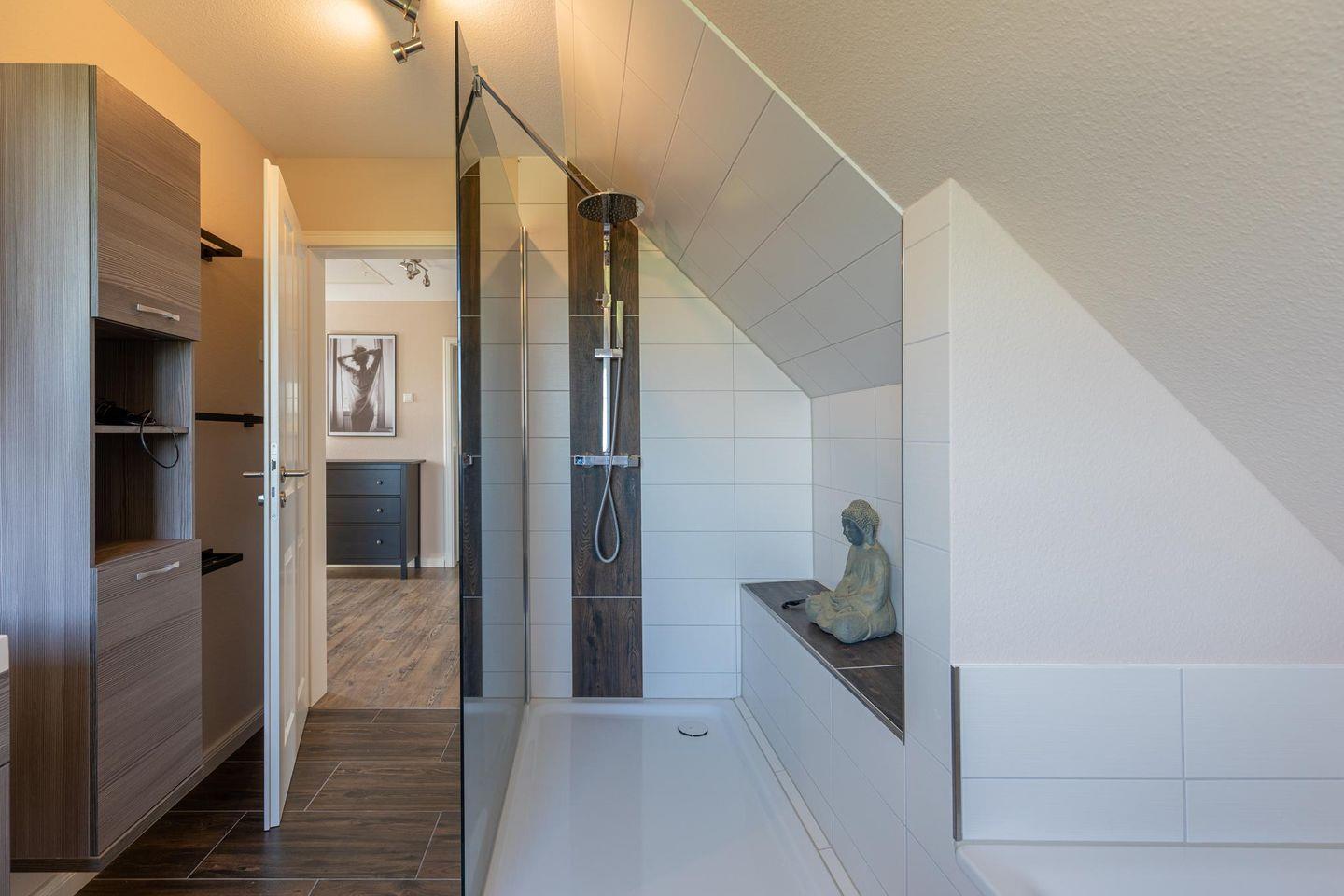 Im Erdgeschoss rundet das Duschbad mit WC das Bild ab. Im Obergeschoss steht Ihnen ein großes Bad mit walk-in Dusche und Badewanne zur Verfügung.