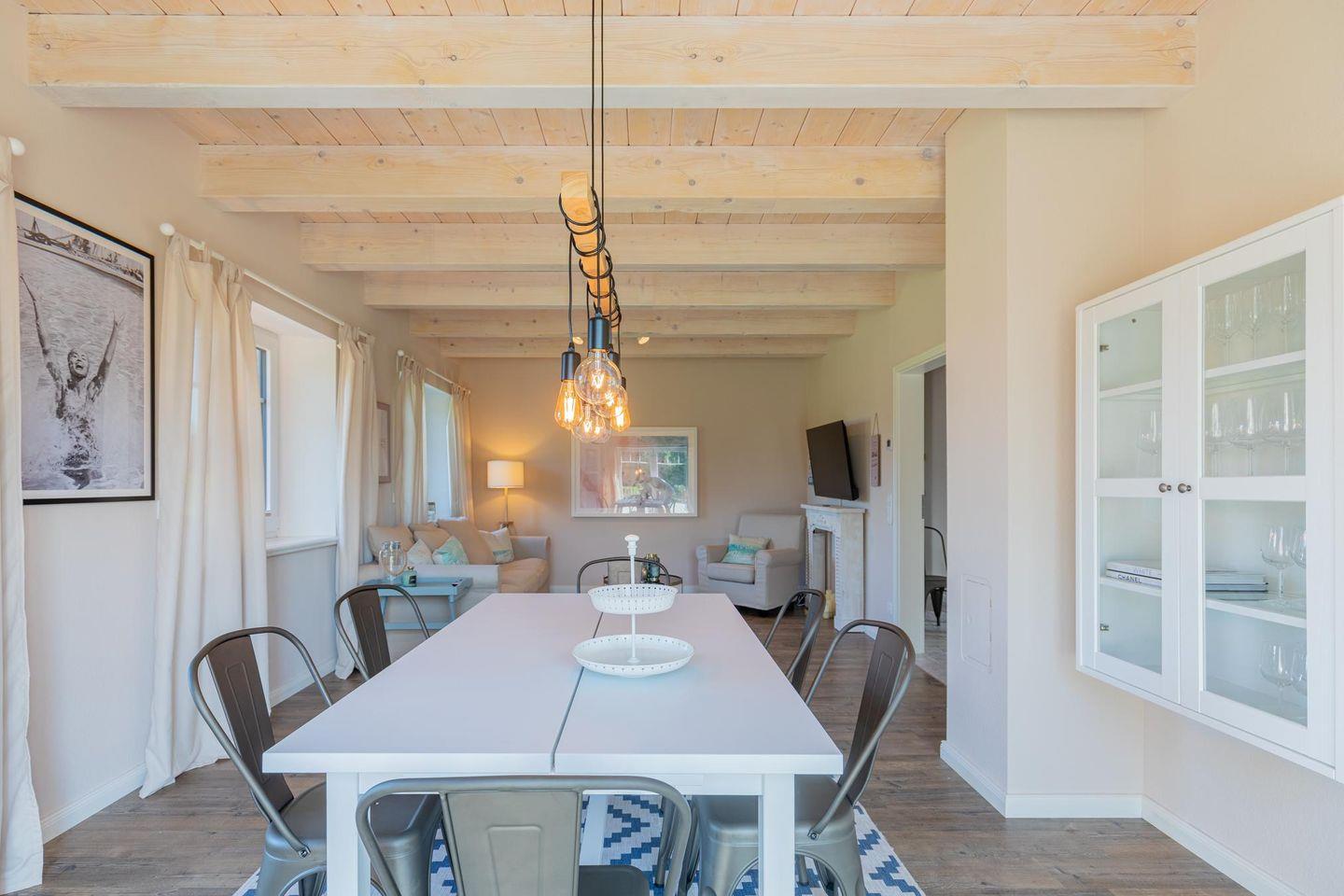 Der helle, geschmackvolle Wohnraum bietet Ihnen eine gemütliche Sofaecke mit großem TV und einen Essbereich.