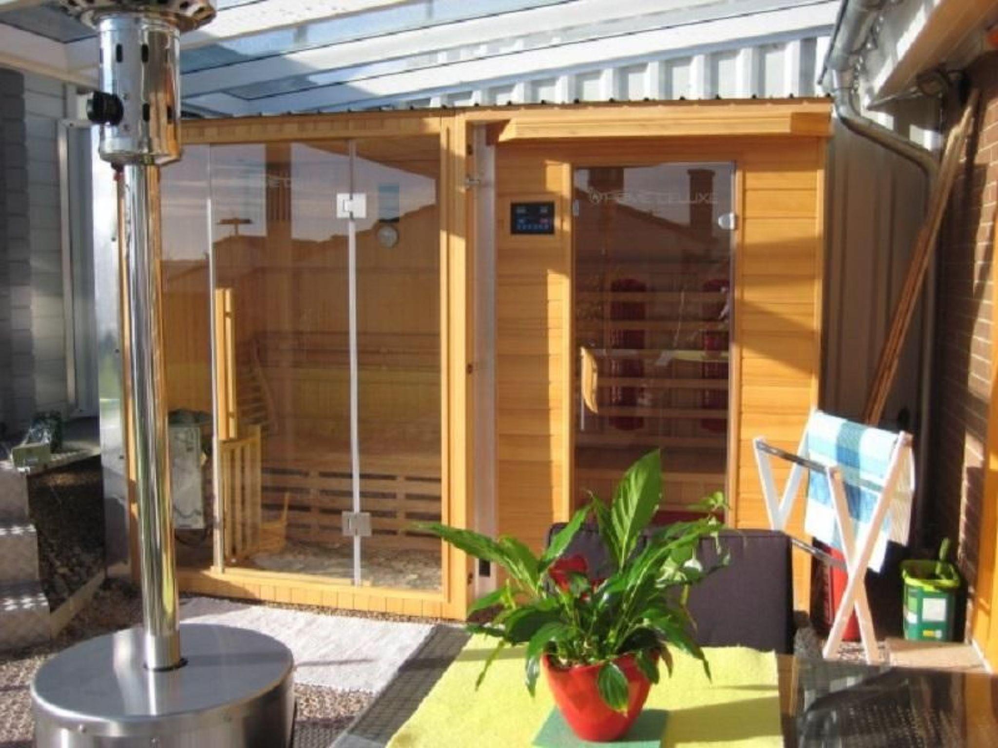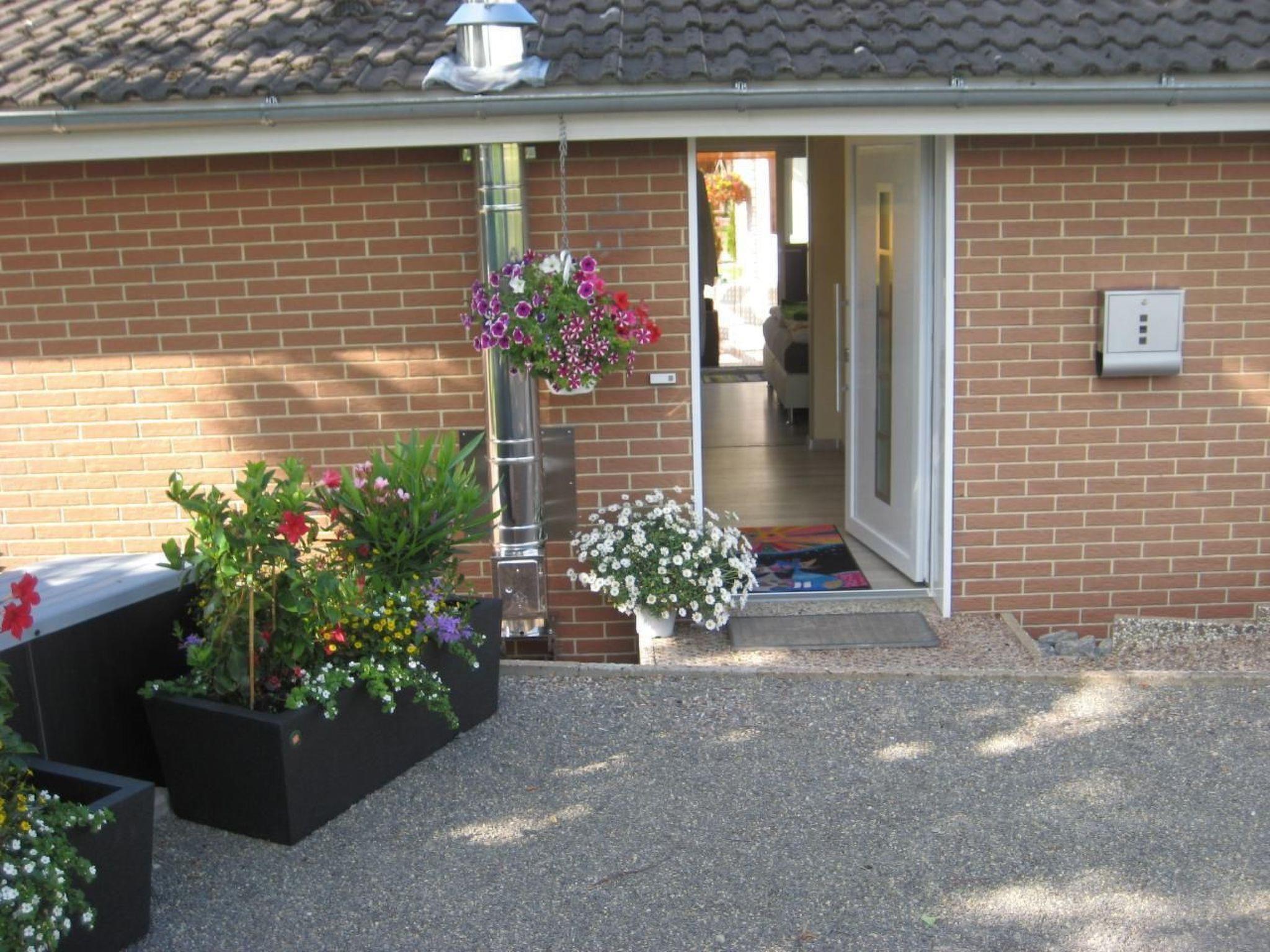 Glass-covered, heated terrace with rattan furniture, parasols, outdoor socket for barbecue, light with motion detector and parking light. Fold-down tumble dryer under the glass roof, trim wheel, chess set etc. under the glass roof, additional side bench and table, garden shower, garden washbasin etc.