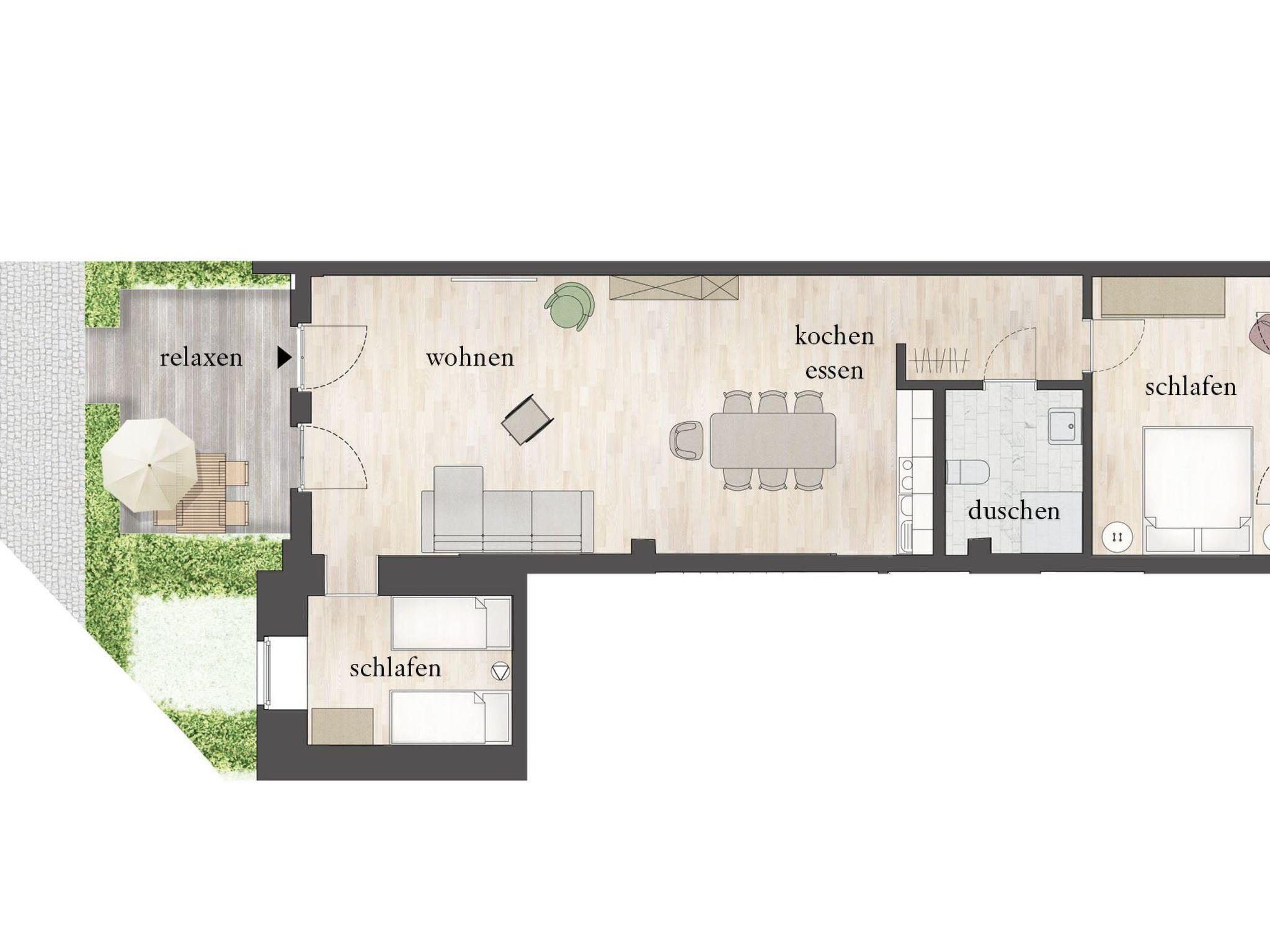 This apartment has an individual terrace area planted with hedges all around. The Bavarian rustic beer garden tables and chairs invite you to enjoy cosy hours in the fresh Havel air. This area is adjoined by a large lawn by the banks of the Havel with direct access to the house’s own swimming jetty with a ladder to facilitate getting in and out of the canoe or rowing boat. There is also a grill area there with a very large natural stone table (ca. 5 x 1.20m).