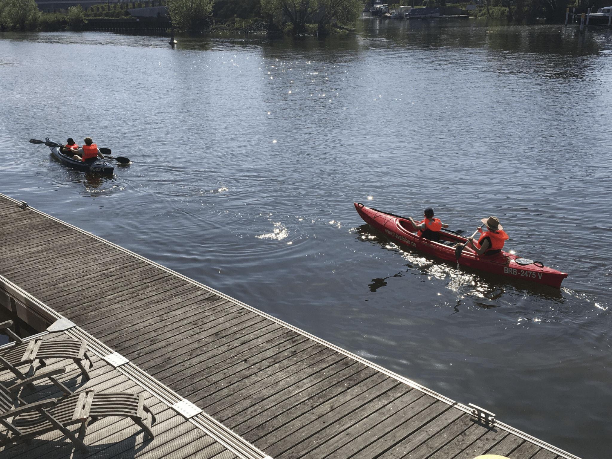 This apartment has an individual terrace area planted with hedges all around. The Bavarian rustic beer garden tables and chairs invite you to enjoy cosy hours in the fresh Havel air. This area is adjoined by a large lawn by the banks of the Havel with direct access to the house’s own swimming jetty with a ladder to facilitate getting in and out of the canoe or rowing boat. There is also a grill area there with a very large natural stone table (ca. 5 x 1.20m). There is also a balcony.