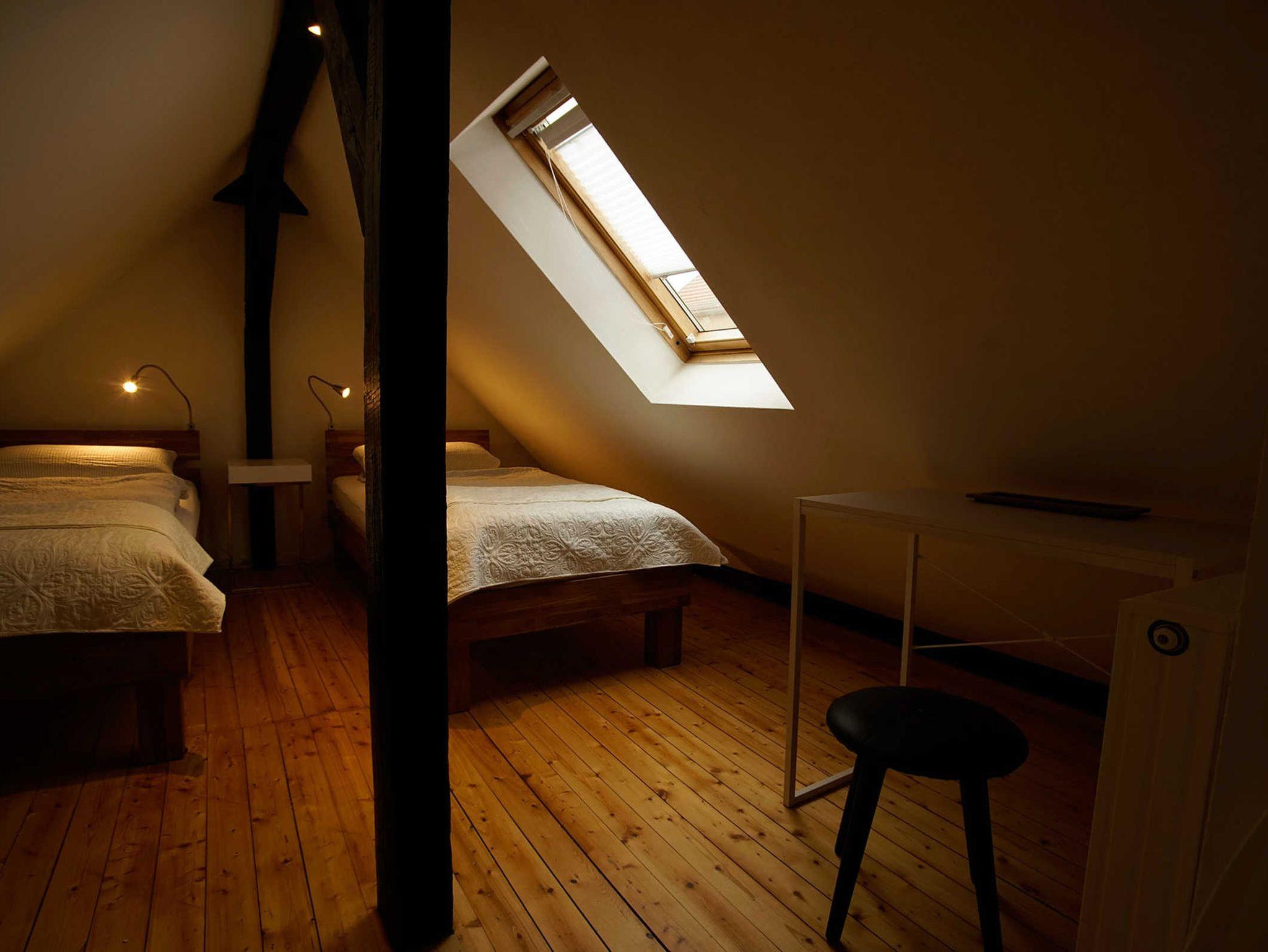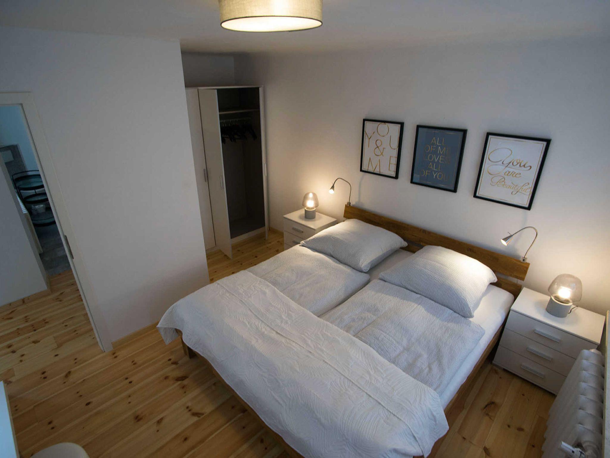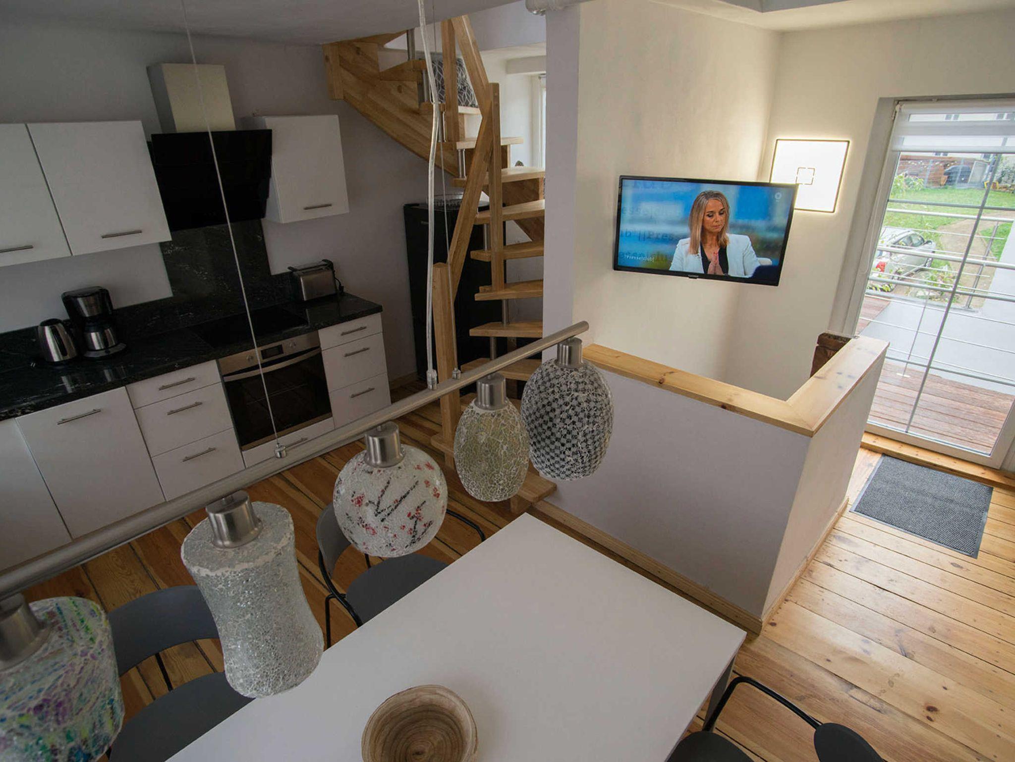 Für 4 Personen stehen Ihnen zwei Schlafzimmer zur Verfügung. Ein Schlafzimmer ist mit einem Doppelbett ausgestattet, ein weiteres Schlafzimmer über eine großzügige Treppe im ausgebauten Dachgeschoss mit zwei Einzelbetten, welches in einen getrennten Schlafbereich und einen zusätzlichen Wohnbereich mit Fernseher aufgeteilt ist.