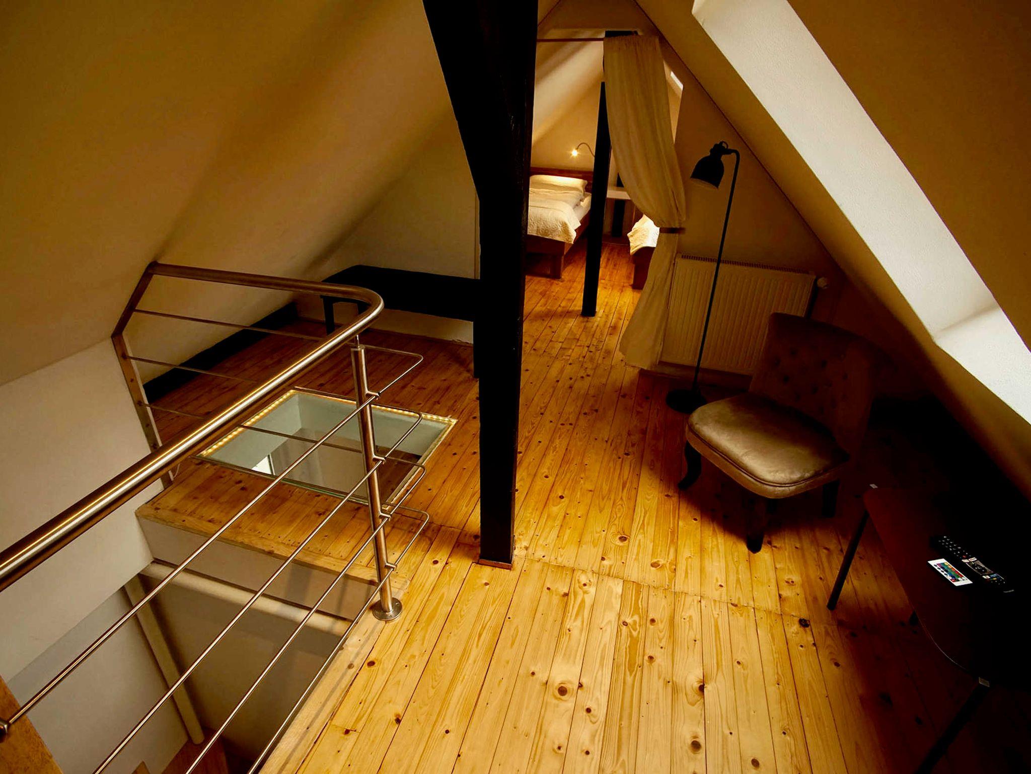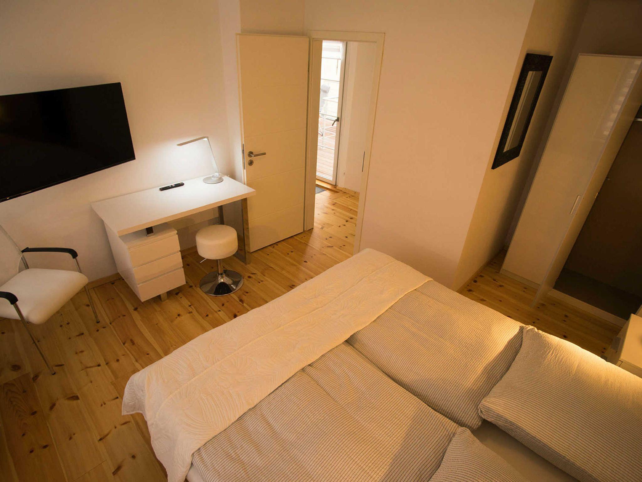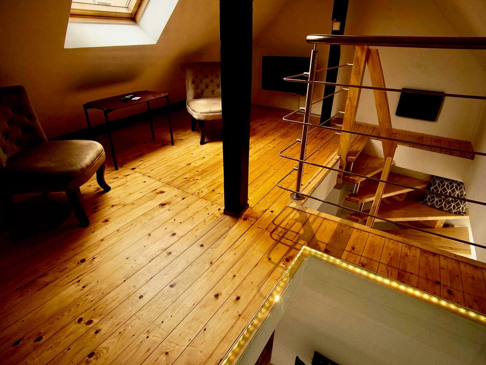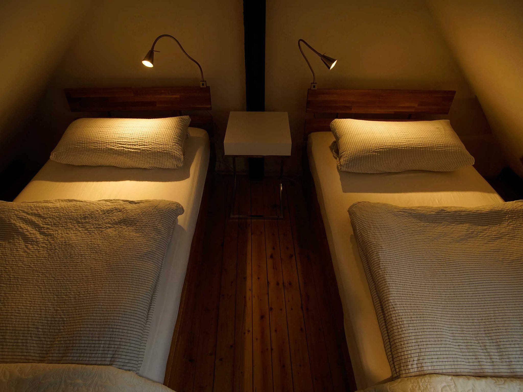 Für 4 Personen stehen Ihnen zwei Schlafzimmer zur Verfügung. Ein Schlafzimmer ist mit einem Doppelbett ausgestattet, ein weiteres Schlafzimmer über eine großzügige Treppe im ausgebauten Dachgeschoss mit zwei Einzelbetten, welches in einen getrennten Schlafbereich und einen zusätzlichen Wohnbereich mit Fernseher aufgeteilt ist.