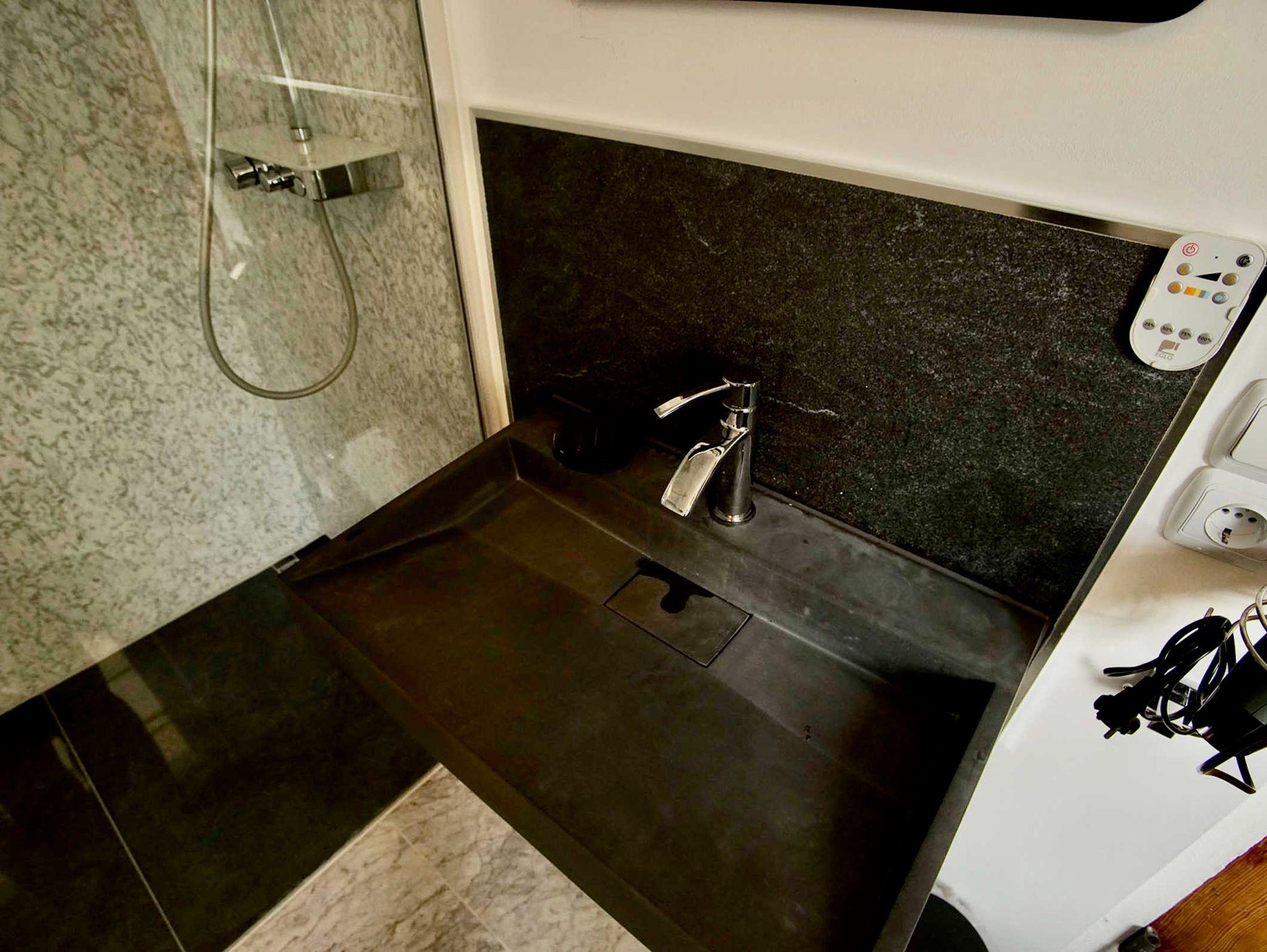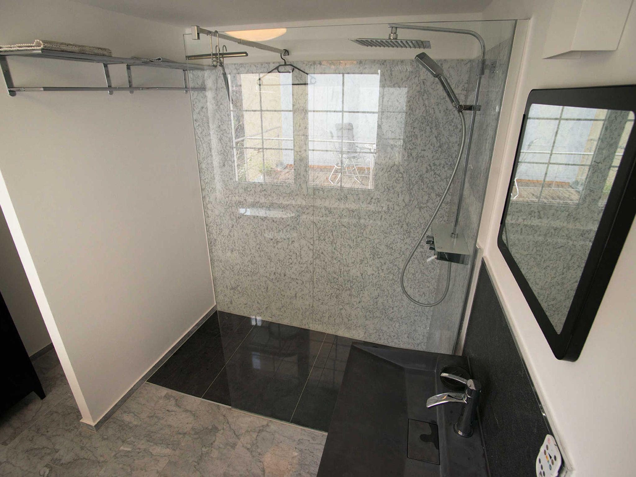 Ein modernes Bad mit Dusche mit Fenster steht in der ersten Etage zu Verfügung.