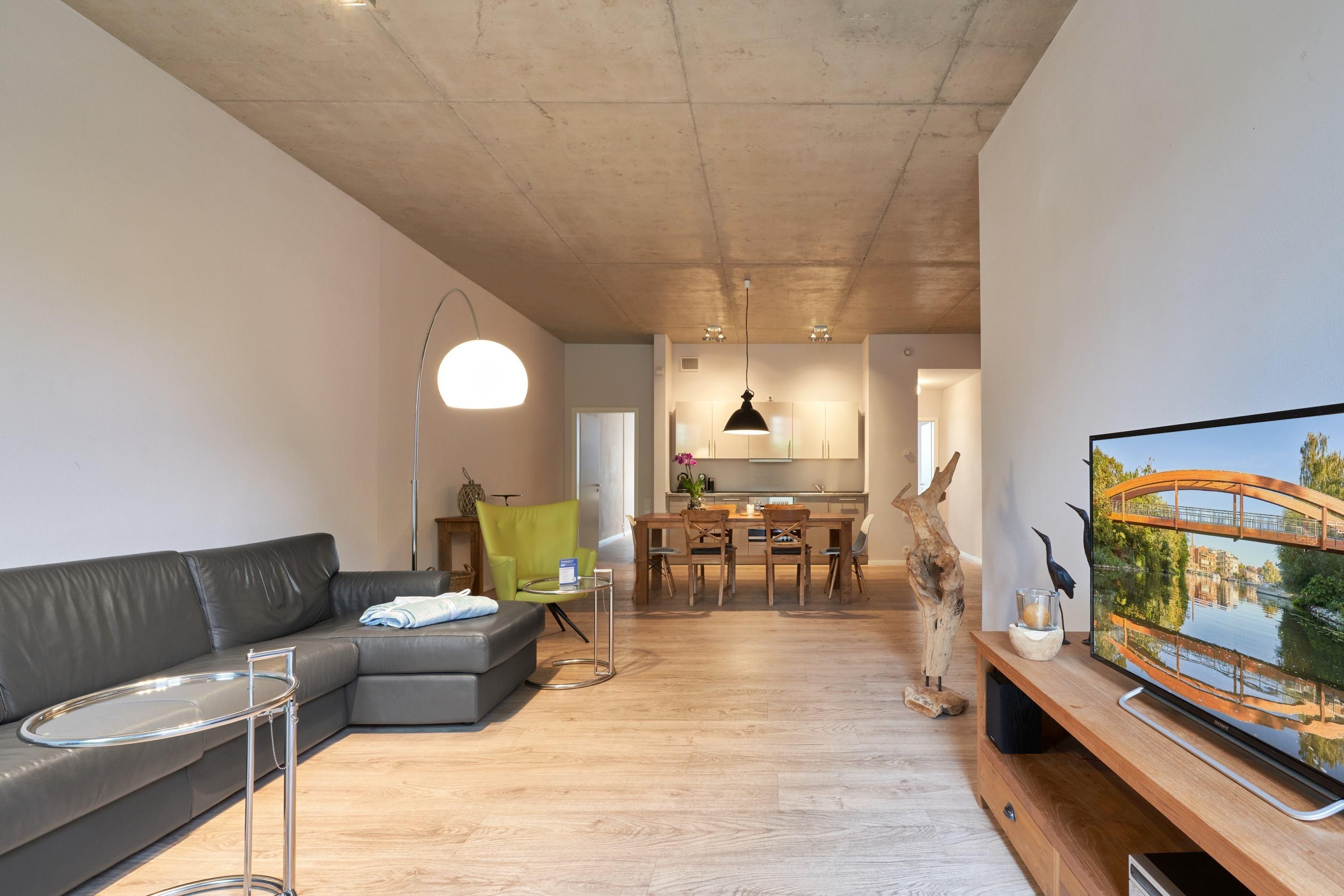 Im Wohnbereich laden die italienischen Sofas und Sessel zum Relaxen ein. Der große Flachbildschirm mit Kabelanschluss und angeschlossenem Blue-Ray-Player sorgen für vielfältige Unterhaltung. Die Stereoanlage bietet über den Bluetooth-Zugang auch die Möglichkeit Ihre eigene Musik zu genießen. In der Wohnung ist selbstverständlich auch WLAN vorhanden.