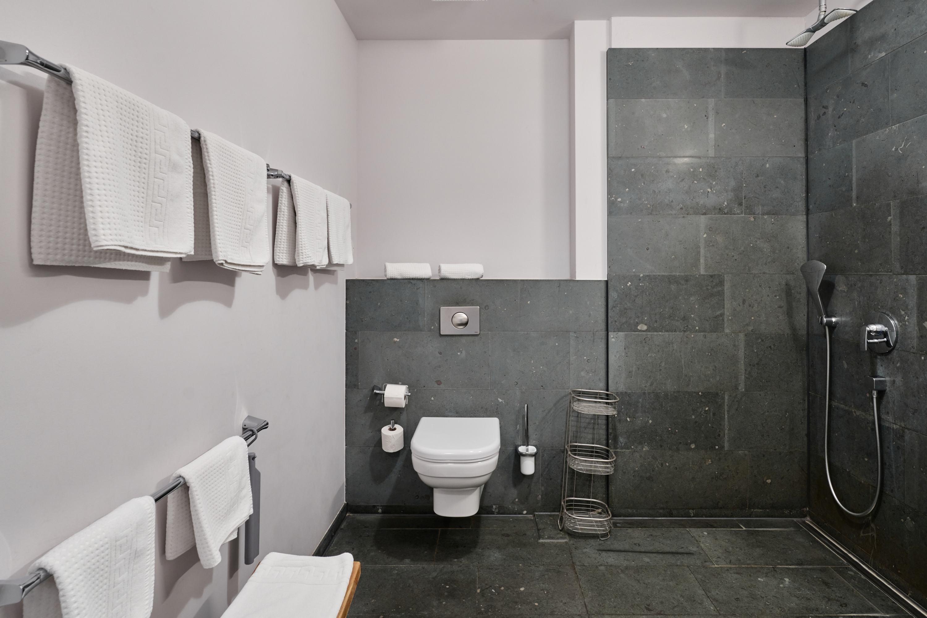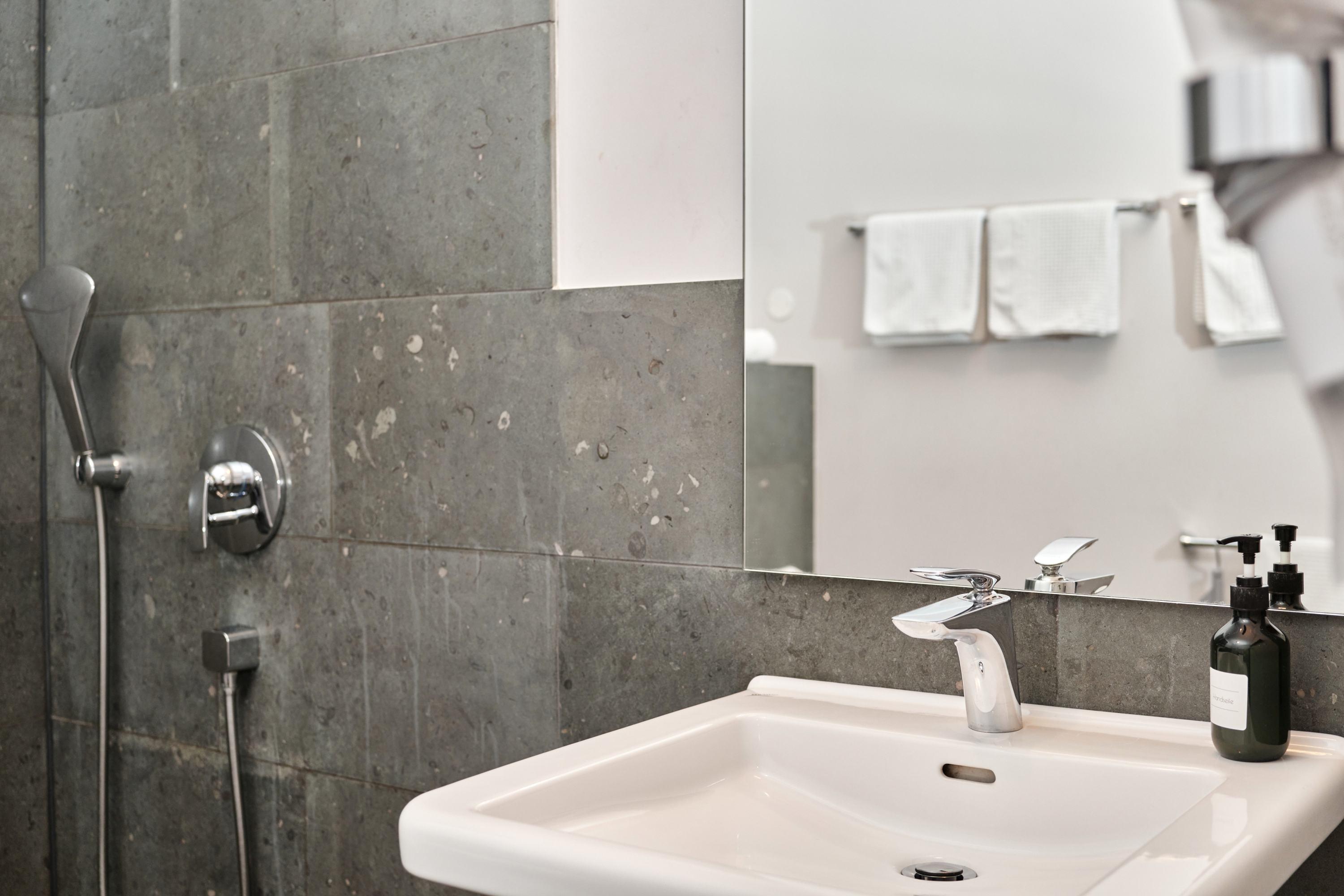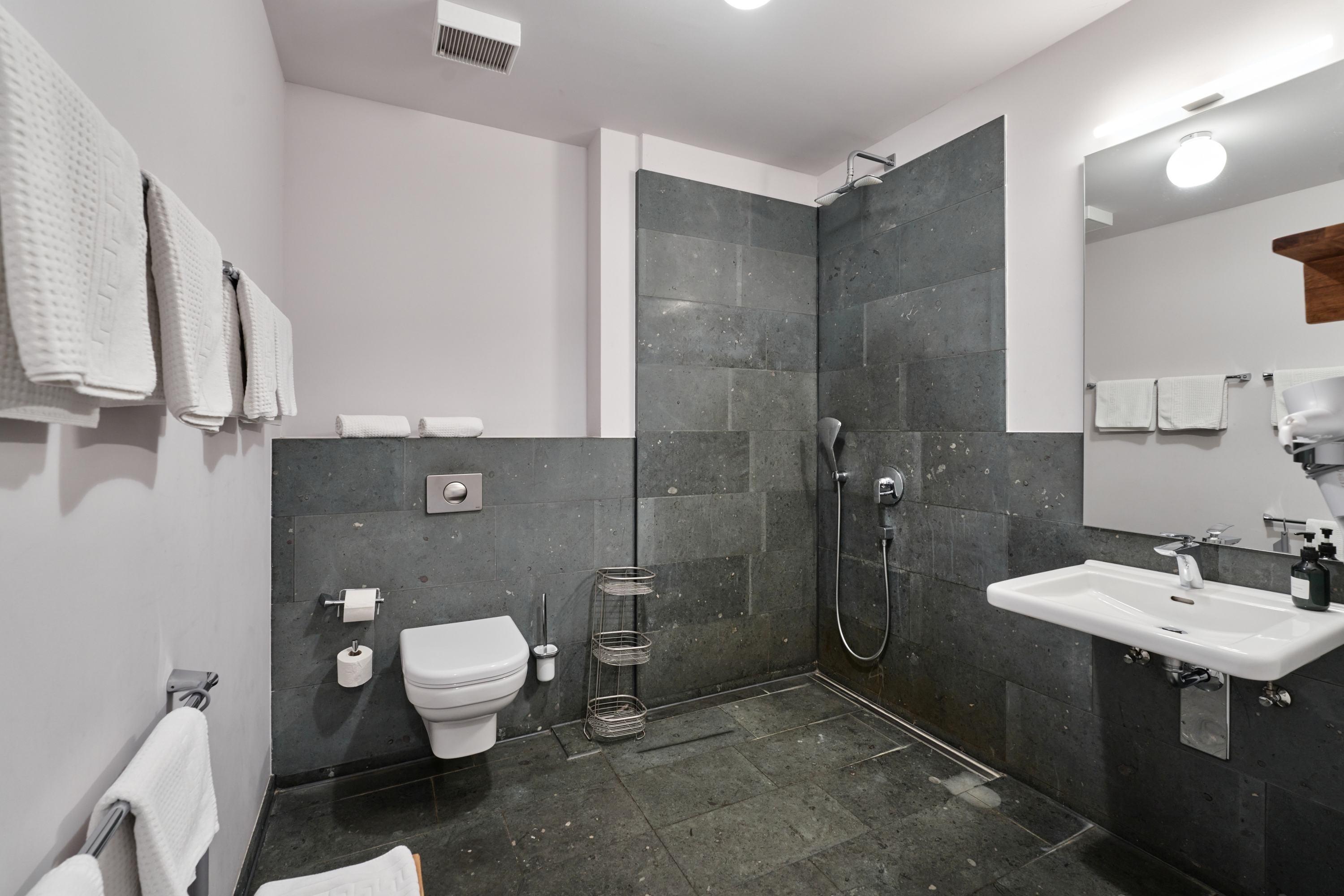 Die bodengleiche Dusche verfügt neben der Schlauchbrause auch über eine „Regenkopfdusche“. Das Waschbecken ist mit einem gut ausgeleuchteten, großformatigen Spiegel versehen. Das es für Rollstuhlfahrer unterfahrbar ist, ist für uns selbstverständlich. Zur Ausstattung des Bades gehört auch ein Fön. Hand- und Duschtücher liegen für Sie bereit.