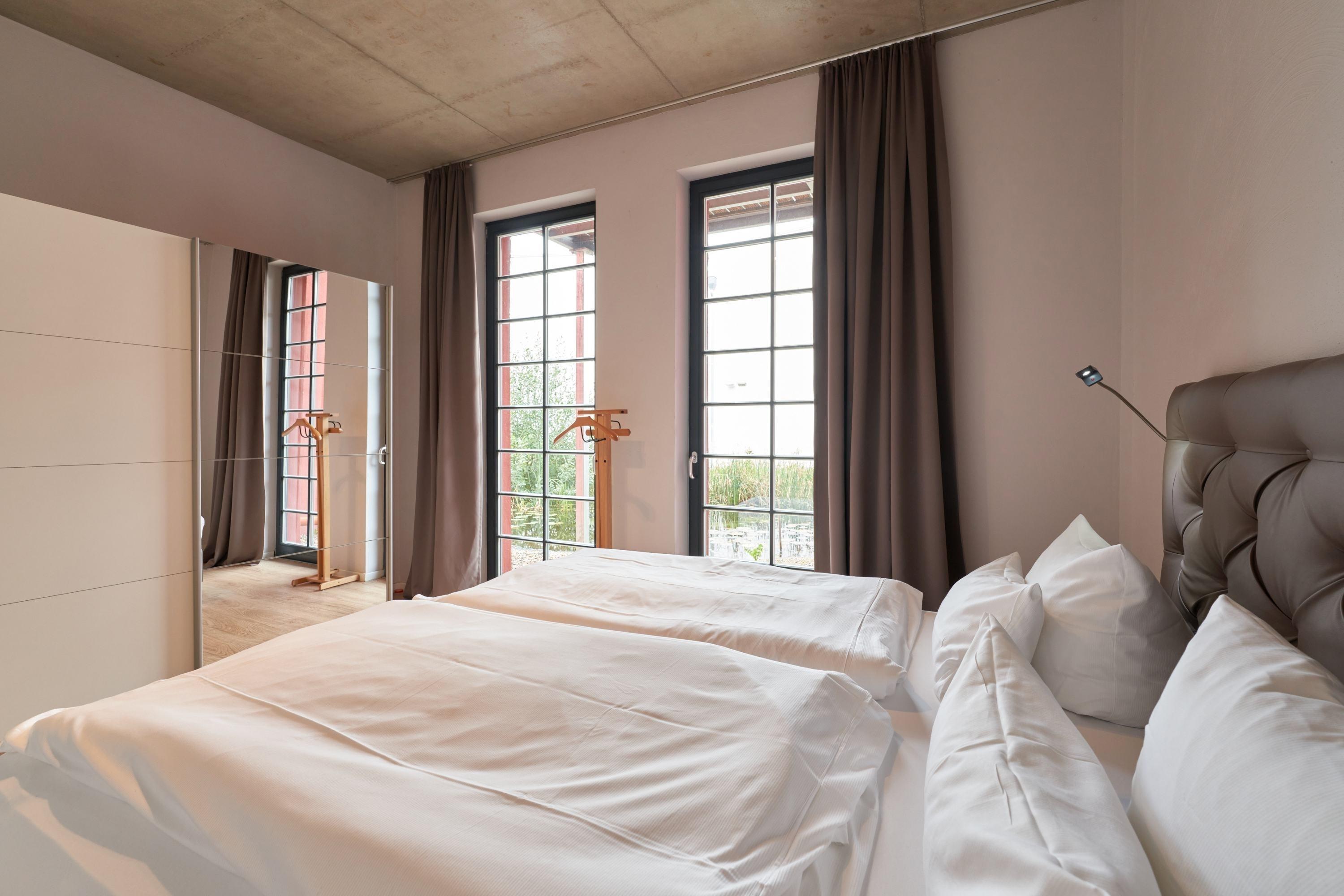 Ein Schlafzimmer ist mit einem überlangen (2,10 m), komfortablen Boxspringbett versehen, das andere verfügt über 2 Einzelbetten. Ein Schlafräume verfügt über einen Schwebetürenschrank, eine der Türen ist jeweils mit einem Ganzkörperspiegel versehen. Ein Schlafzimmer befindet sich an der Westseite und das andere an der Ostseite der Wohnung.