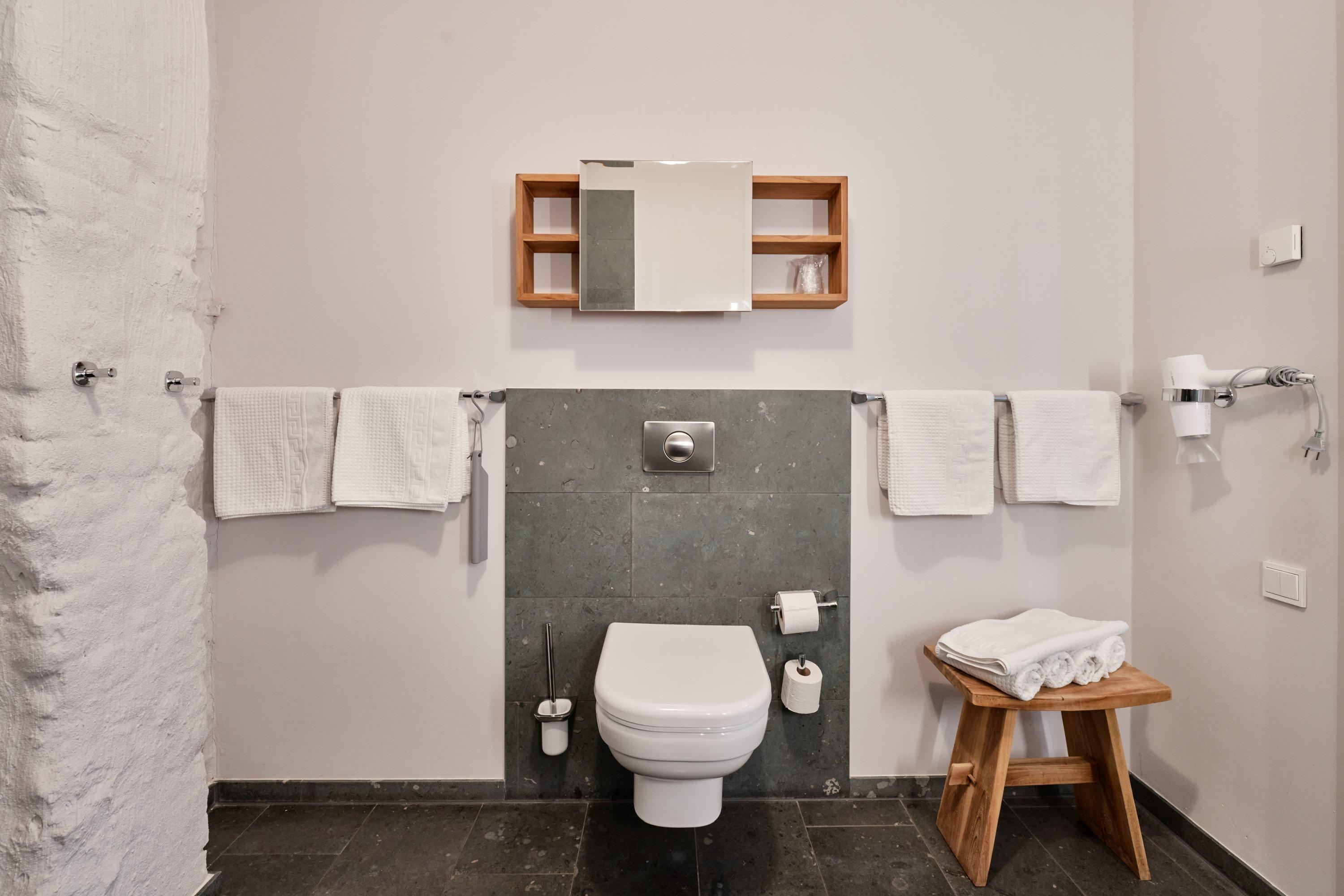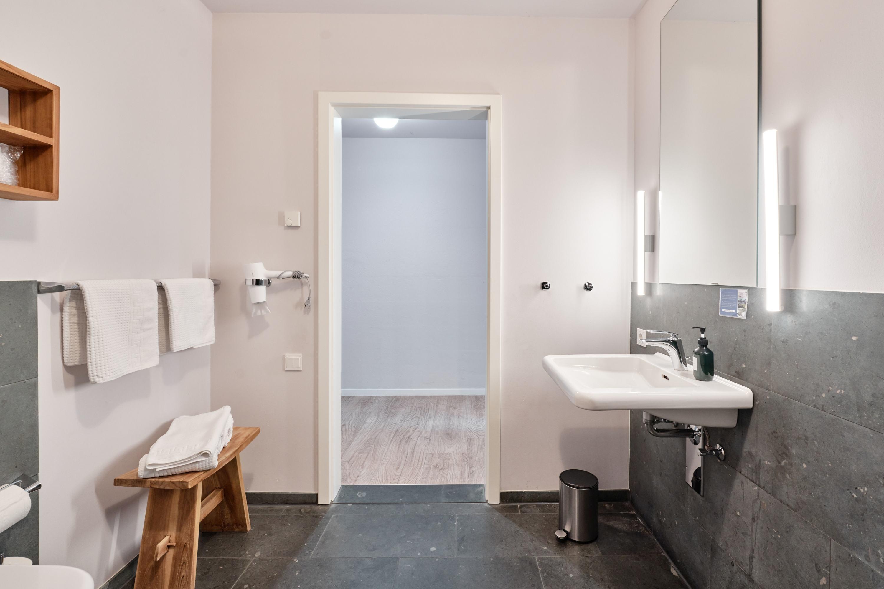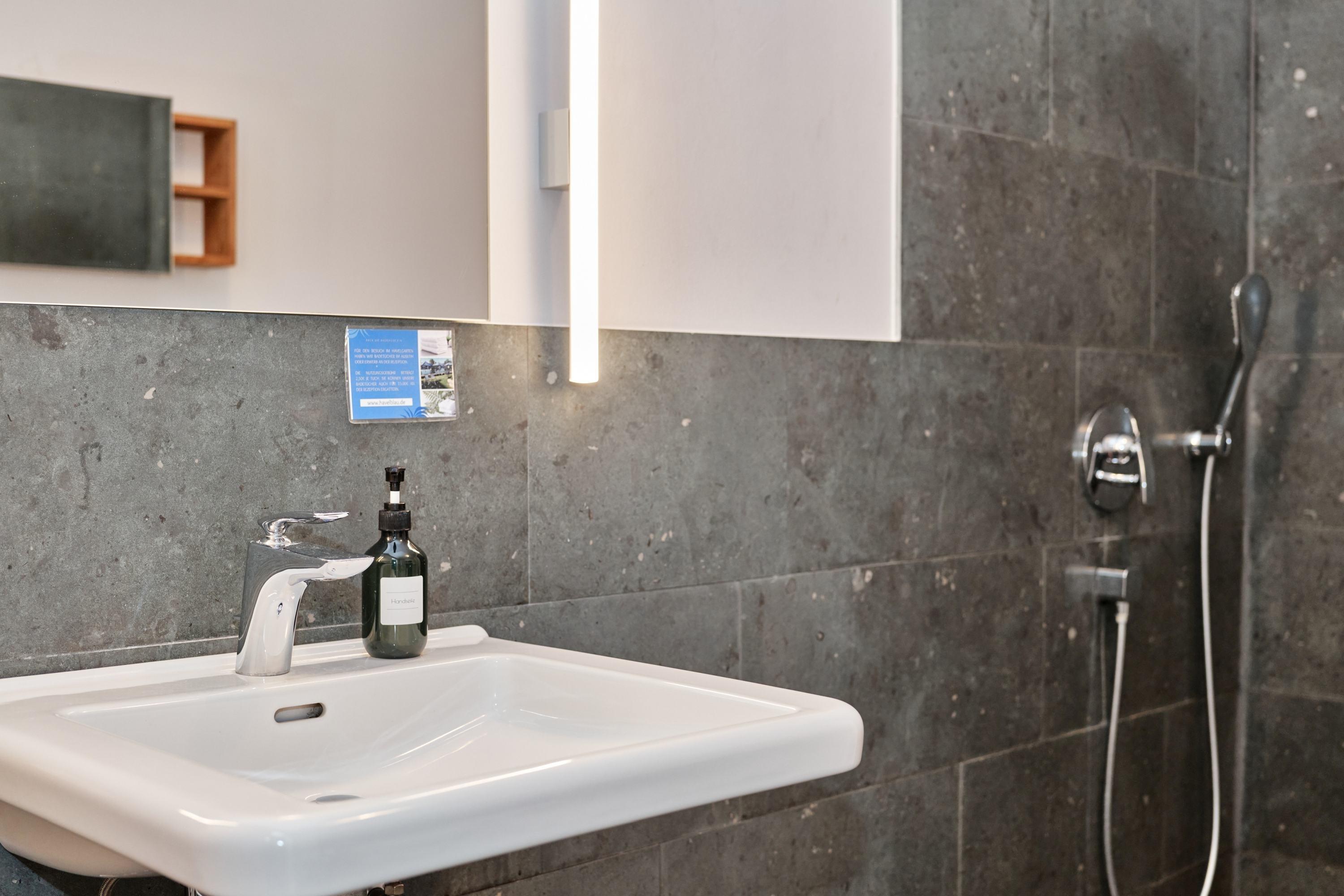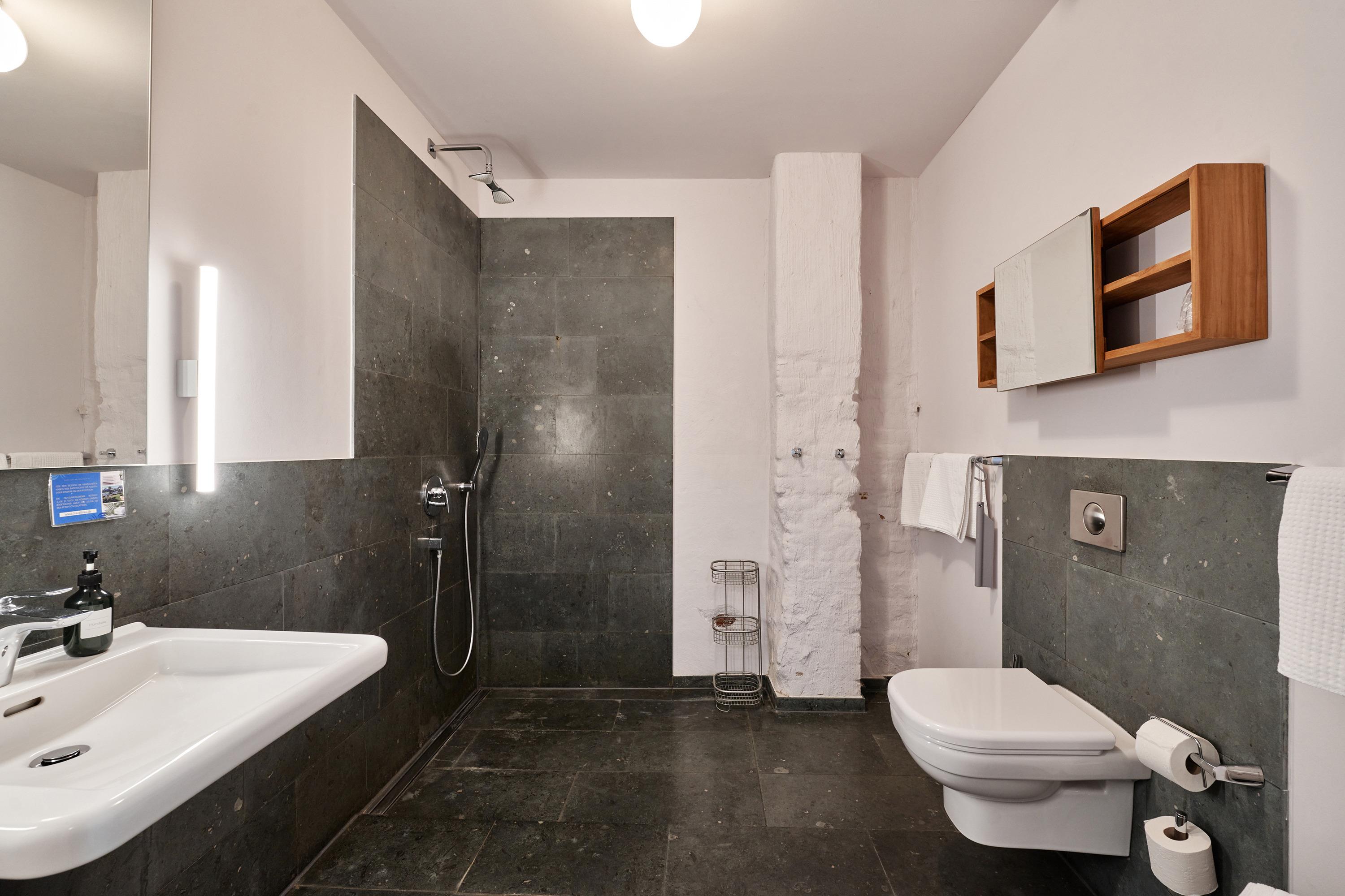 Die bodengleiche Dusche verfügt neben der Schlauchbrause auch über eine „Regenkopfdusche“. Das Waschbecken ist mit einem gut ausgeleuchteten, großformatigen Spiegel versehen. Das es für Rollstuhlfahrer unterfahrbar ist, ist für uns selbstverständlich. Zur Ausstattung des Bades gehört auch ein Fön. Hand- und Duschtücher liegen für Sie bereit.