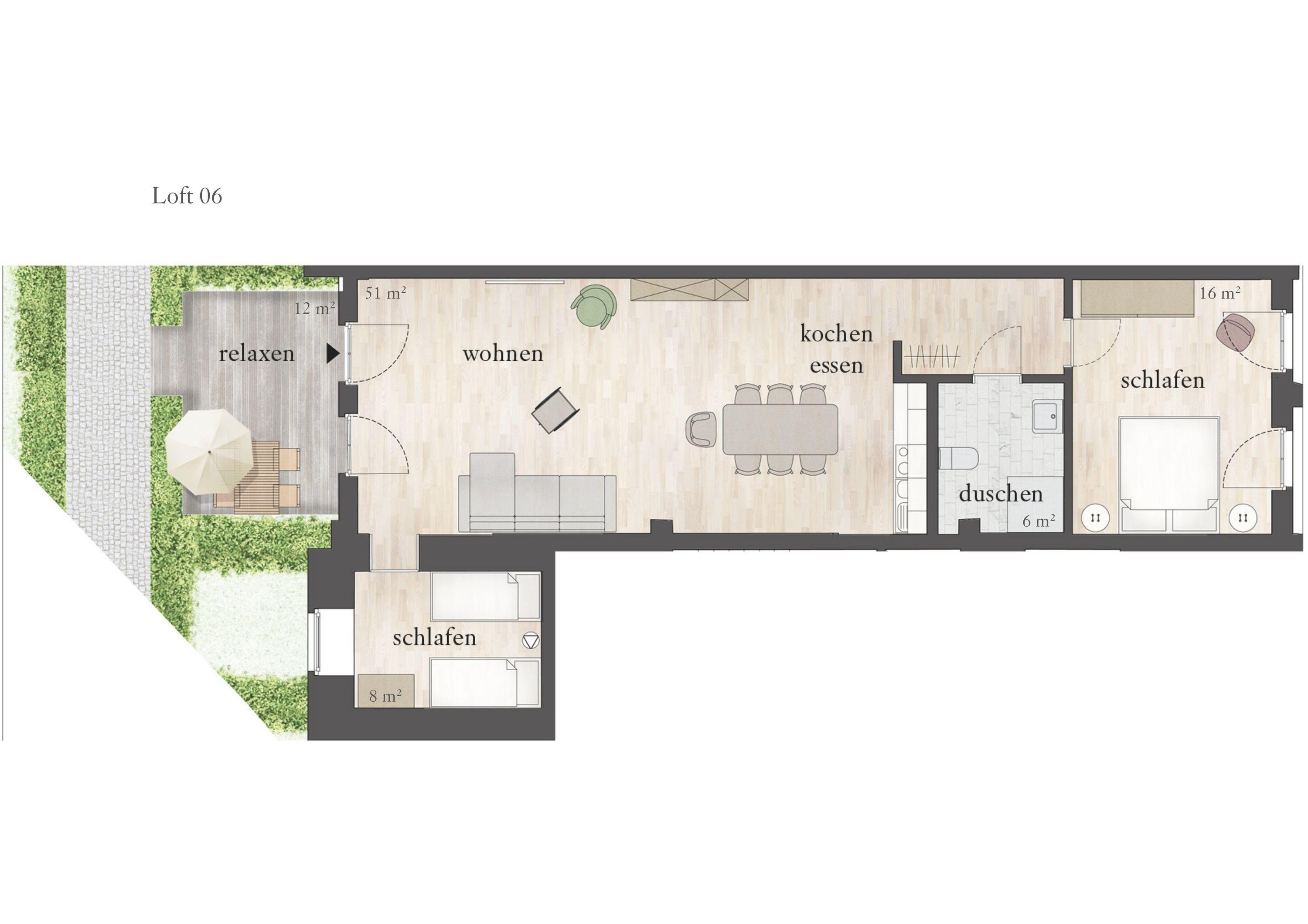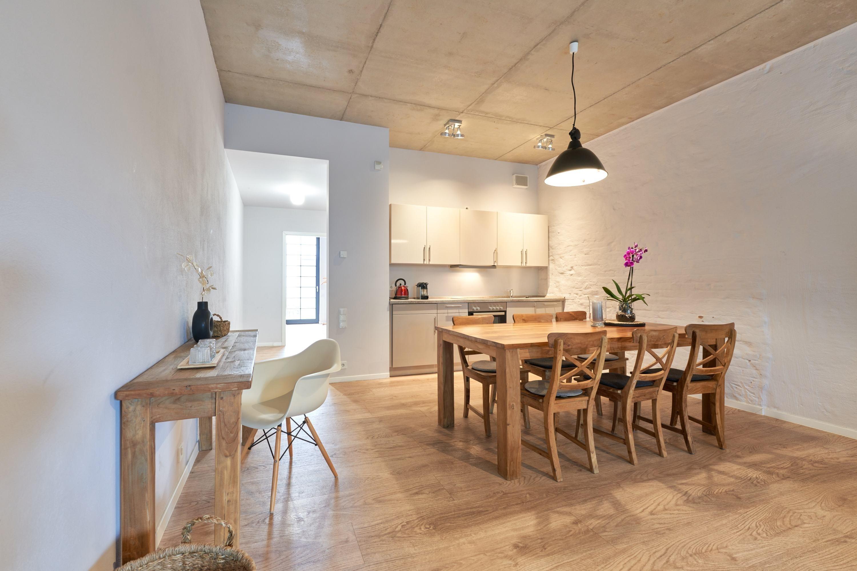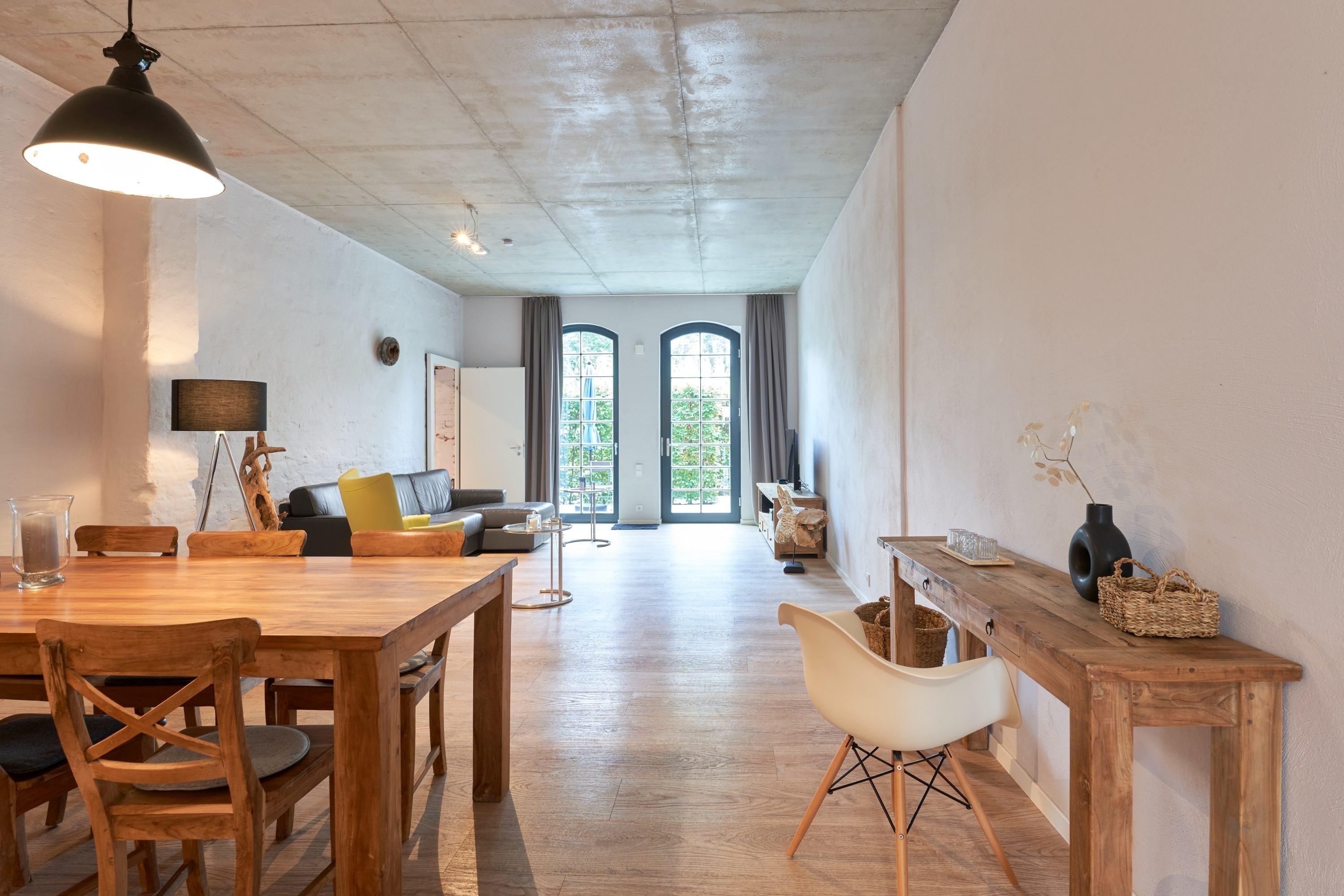 Die Ferienwohnung liegt im Erdgeschoss der ehemaligen Färberei der Kammgarnspinnerei und zeichnet sich durch ihre geräumige und großzügige Raumaufteilung (81m²) aus. Sie ist in Gänze barrierefrei und somit auch uneingeschränkt rollstuhlgeeignet. Die gut geschnittene, viel Platz bietende und komfortabel ausgestattete Loft-Ferienwohnung ist durch Aufbettung nicht nur für 4 sondern auch für 6 Personen geeignet. Die Bereitstellung von Kinderreisebetten und Hochstühlen ist nach Vorbestellung jederzeit möglich.