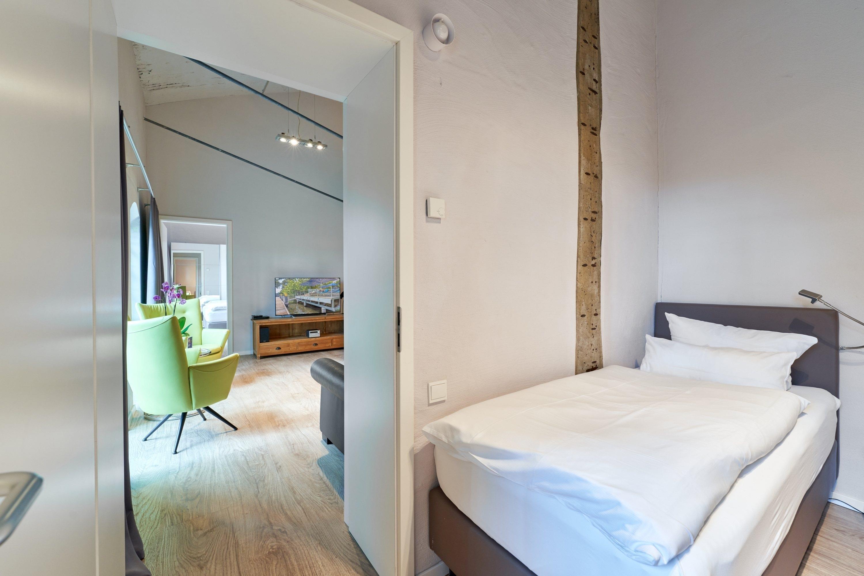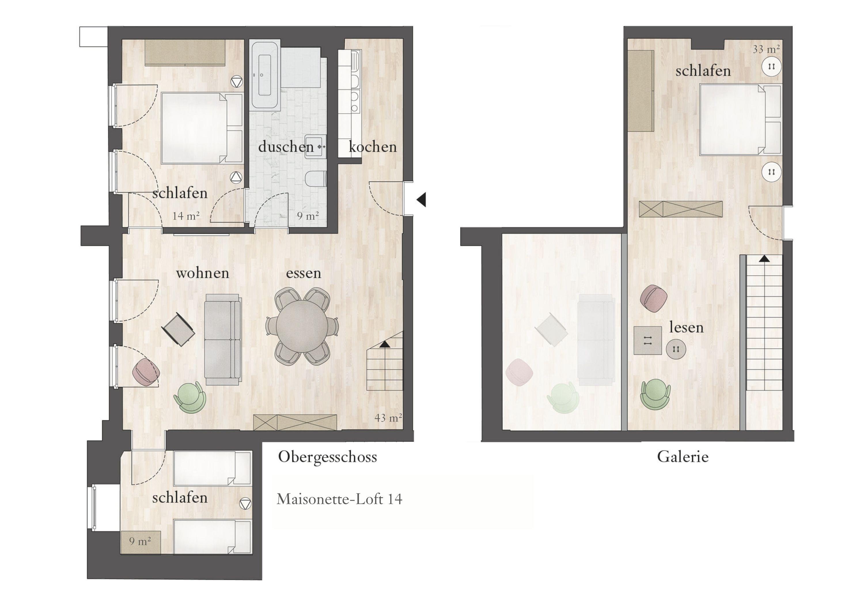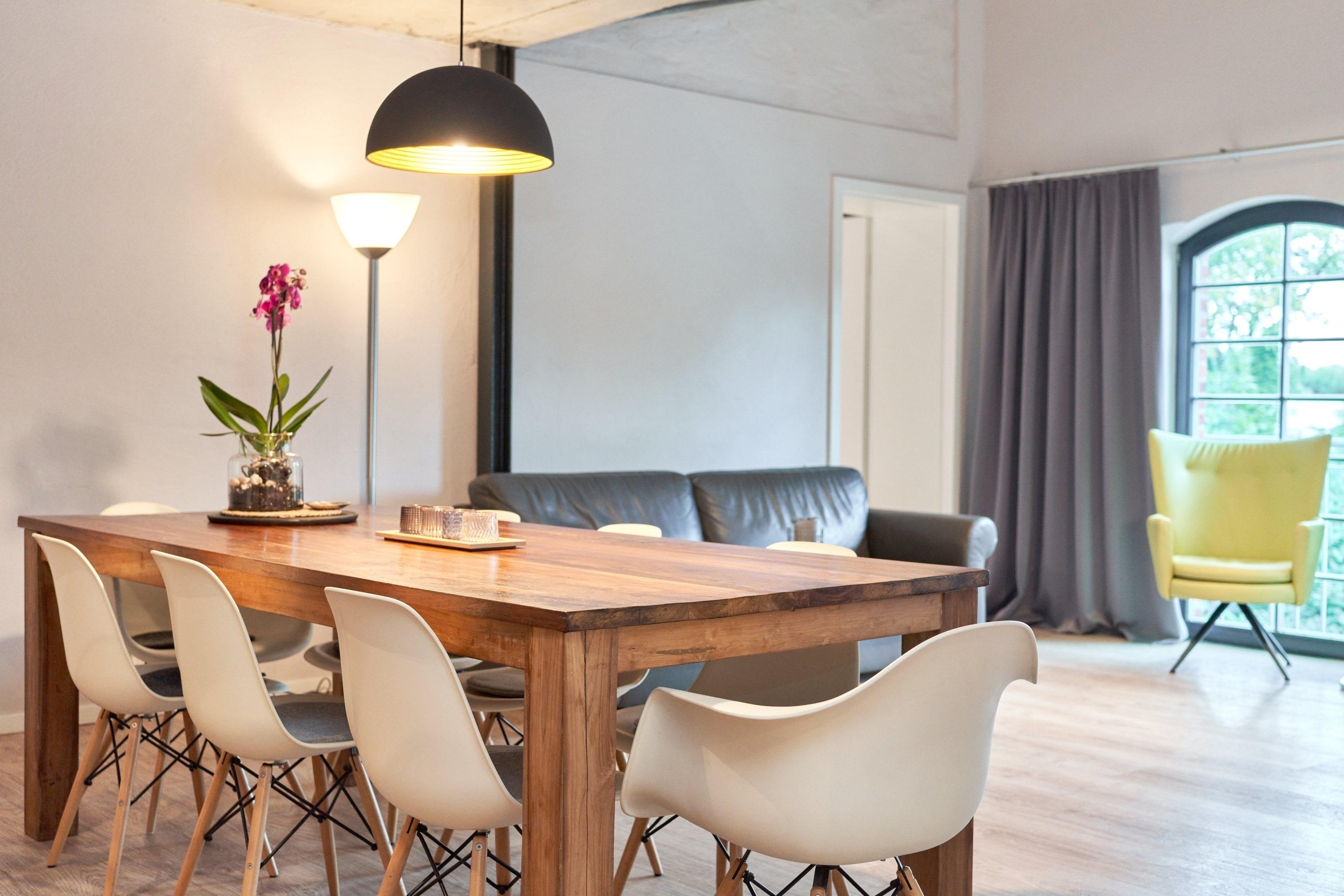 Die Maisonette-Ferienwohnung liegt im Obergeschoss der ehemaligen Färberei der Kammgarnspinnerei und zeichnet sich durch ihre geräumige und großzügige Raumaufteilung (108m²) aus. Die gut geschnittene, viel Platz bietende und komfortabel ausgestattete Loft-Ferienwohnung ist durch Aufbettung nicht nur für 6 sondern auch für 8 Personen geeignet. Die Bereitstellung von Kinderreisebetten und Hochstühlen ist nach Vorbestellung jederzeit möglich.
