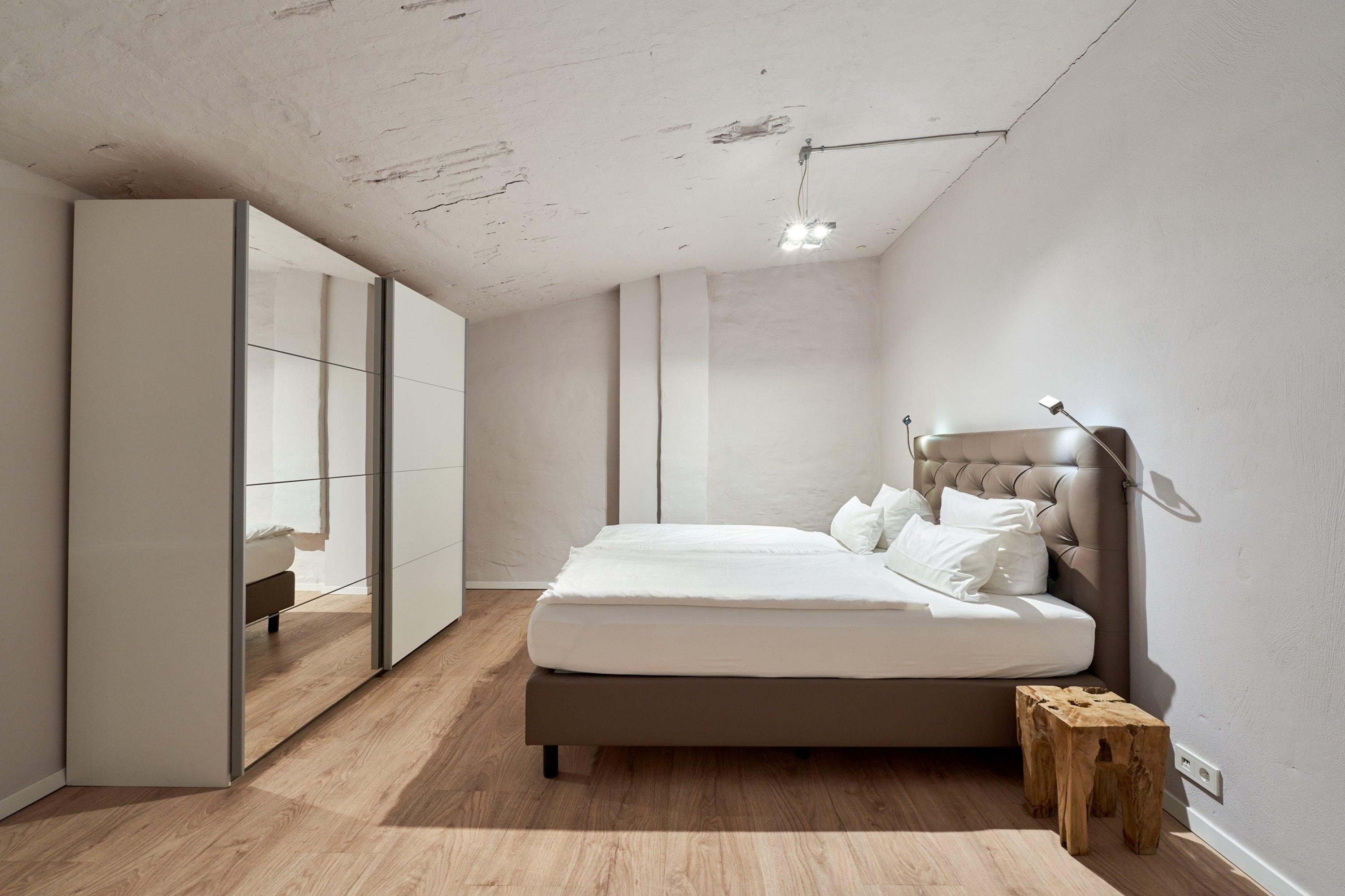 Diese Wohnung verfügt über 3 Schlafzimmer. In der unteren Ebene befindet sich ein Schlafzimmer mit einem Doppelbett und ein weiteres mit zwei Einzelbetten. Der dritte Schlafraum befindet sich in der Empore und ist mit einem Doppelbett ausgestattet. Alle Schlafzimmer sind jeweils mit überlangen (2,10 m) hochwertigen, komfortablen Boxspringbett versehen. Für die Unterbringung Ihrer persönlichen Dinge stehen Ihnen ein Teakholzschrank und zwei große Schwebetürenschränke zur Verfügung. Diese bieten Ihnen sehr viel Platz. Eine der Schwebetüren ist mit einem Ganzkörperspiegel versehen. Ein Safe für Ihre Wertsachen befindet sich in einem der Schwebetürschrank der unteren Ebene.