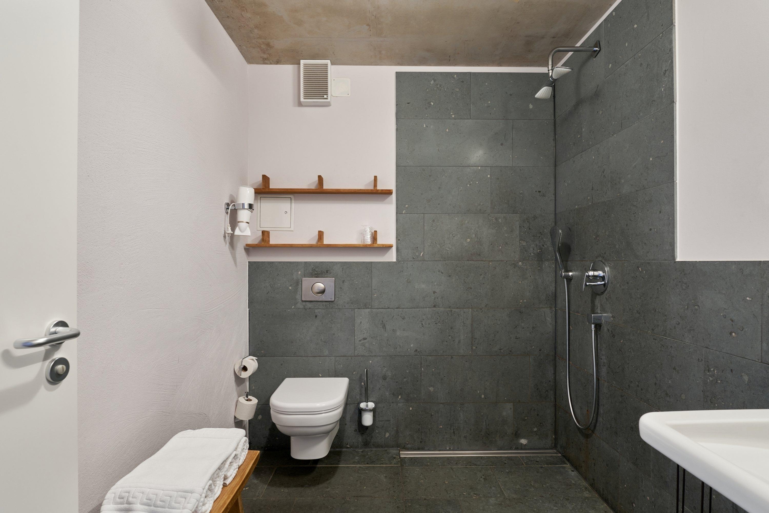 Die bodengleiche Dusche verfügt neben der Schlauchbrause auch über eine „Regenkopfdusche“. Das Waschbecken ist mit einem gut ausgeleuchteten, großformatigen Spiegel versehen. Das es für Rollstuhlfahrer unterfahrbar ist, ist für uns selbstverständlich. Zur Ausstattung des Bades gehört auch ein Fön. Hand- und Duschtücher liegen für Sie bereit.