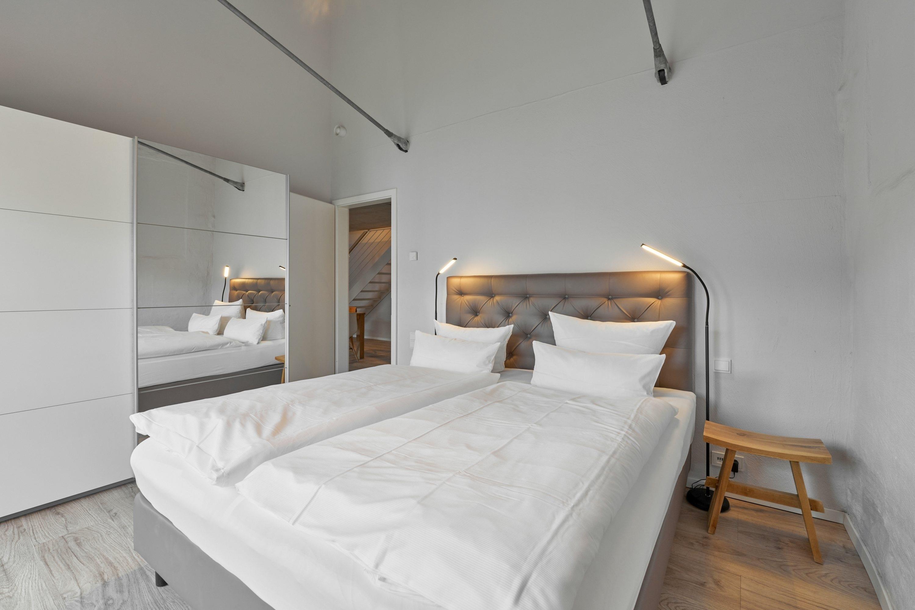 Die beiden sehr großen Schlafzimmer sind jeweils mit einem überlangen (2,10 m) hochwertigen, komfortablen Boxspringbett versehen. Ebenfalls haben beide Schlafräume einen Schwebetürenschrank und bieten sehr viel Platz für Ihre persönlichen Dinge. Eine der Türen ist jeweils mit einem Ganzkörperspiegel versehen.