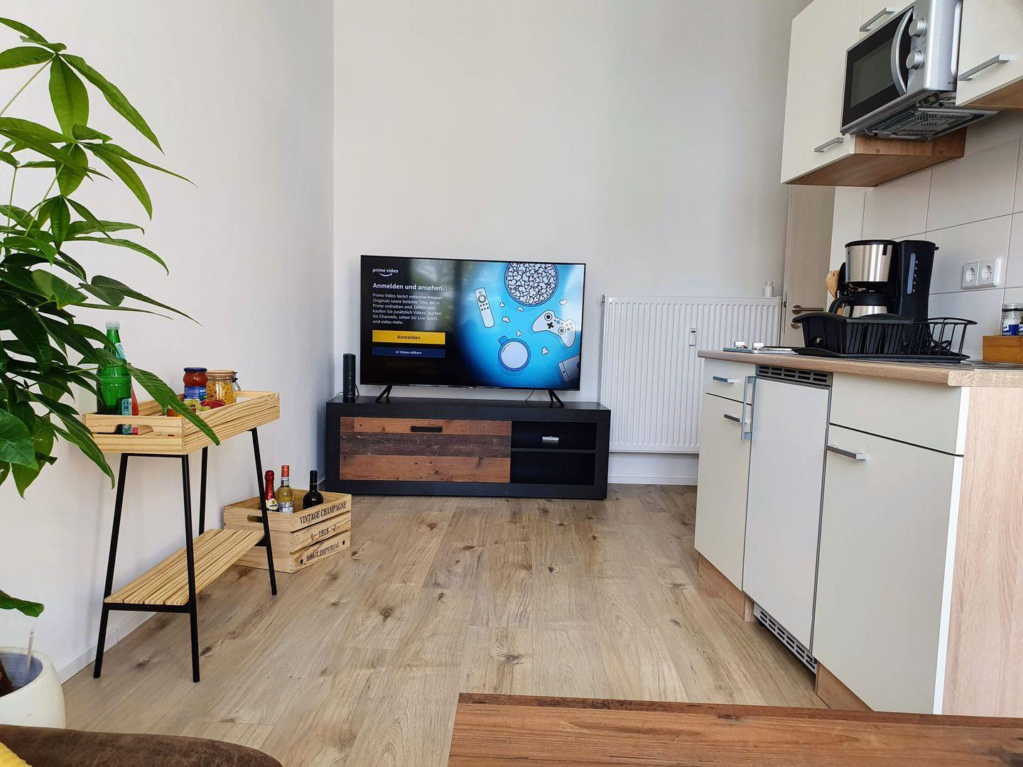 Das helle und einladende Wohnzimmer ist der perfekte Ort, um nach einem ereignisreichen Tag zu entspannen. Hier können Sie es sich auf dem gemütlichen Sofa bequem machen und Ihren Lieblingsfilm auf dem Fernseher genießen. Zudem haben Sie freien Zugang zum WLAN, so dass Sie auch während Ihres Urlaubs immer connected bleiben können. Für eine angenehme Raumtemperatur sorgt die Heizung, und der Ventilator ist besonders in den warmen Monaten eine willkommene Erfrischung.