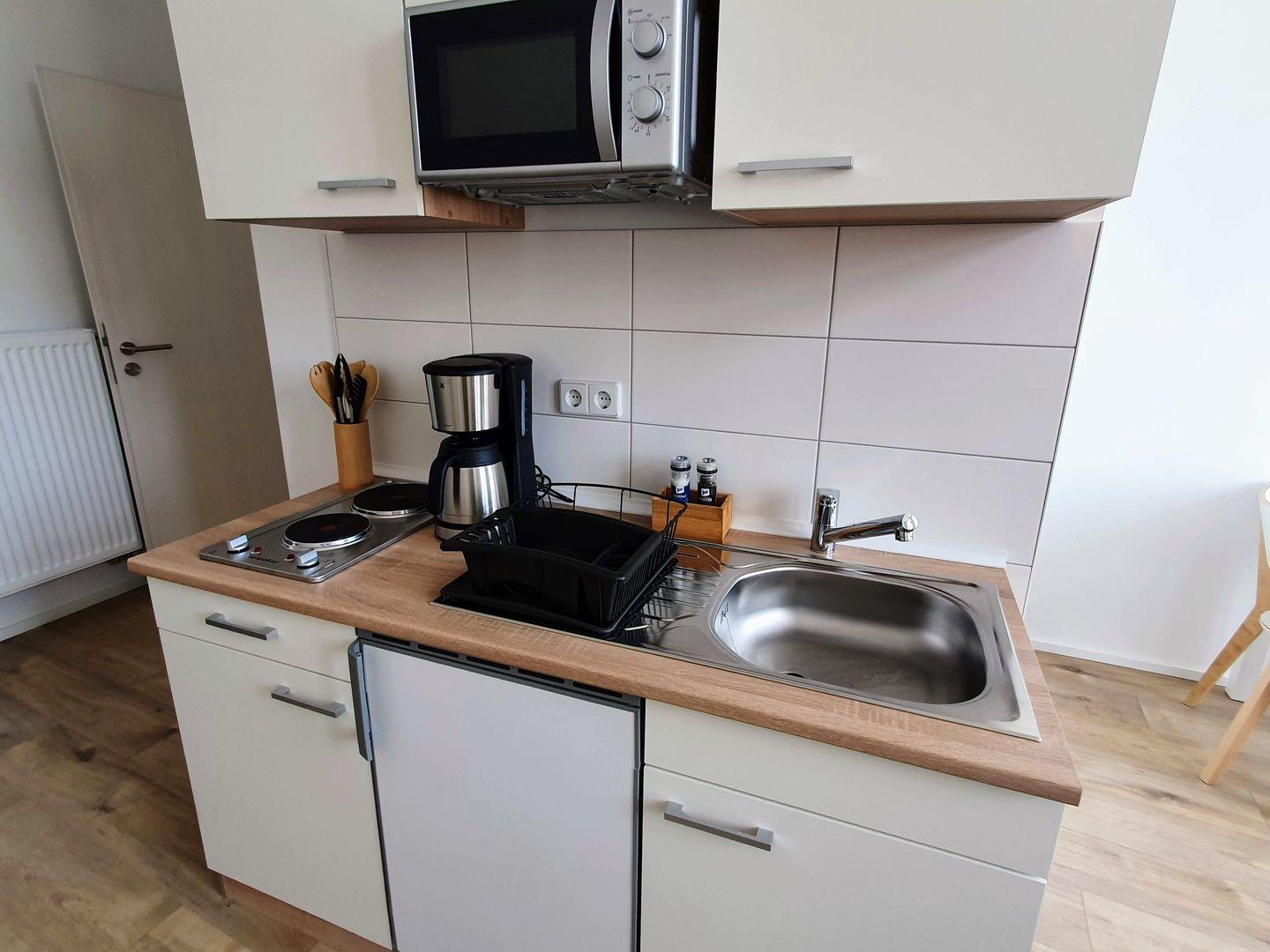 Ihr Aufenthalt im HOGULU - Haus 1, Appartement 23 wird durch die durchdachte Ausstattung noch angenehmer. Die offene Küche mit modernem Design ist komplett ausgestattet und verfügt über alles, was Sie benötigen, um köstliche Mahlzeiten zu zaubern. Neben einem Herd, einem Kühlschrank mit Gefrierfach, einer Mikrowelle, einem Wasserkocher und einer Kaffeemaschine stehen Ihnen auch Geschirr, Besteck und Küchenutensilien zur Verfügung. Der großzügige Essbereich lädt dazu ein, gemeinsame Mahlzeiten in geselliger Runde einzunehmen.