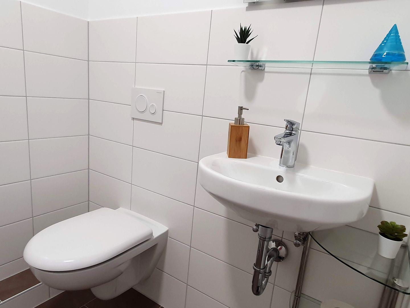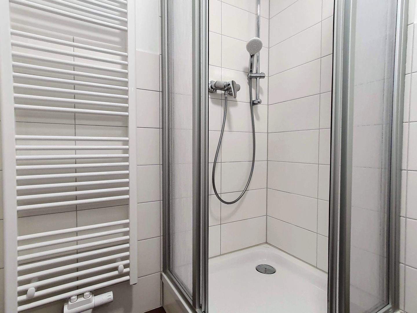 Das moderne Badezimmer ist mit einer Dusche, einem Waschbecken, WC und einem Haartrockner ausgestattet. Hier können Sie sich frisch machen und sich auf den Tag vorbereiten oder nach einem aufregenden Tag in der Stadt erfrischen. Warmes Wasser steht Ihnen jederzeit zur Verfügung, damit Sie den maximalen Komfort genießen können.