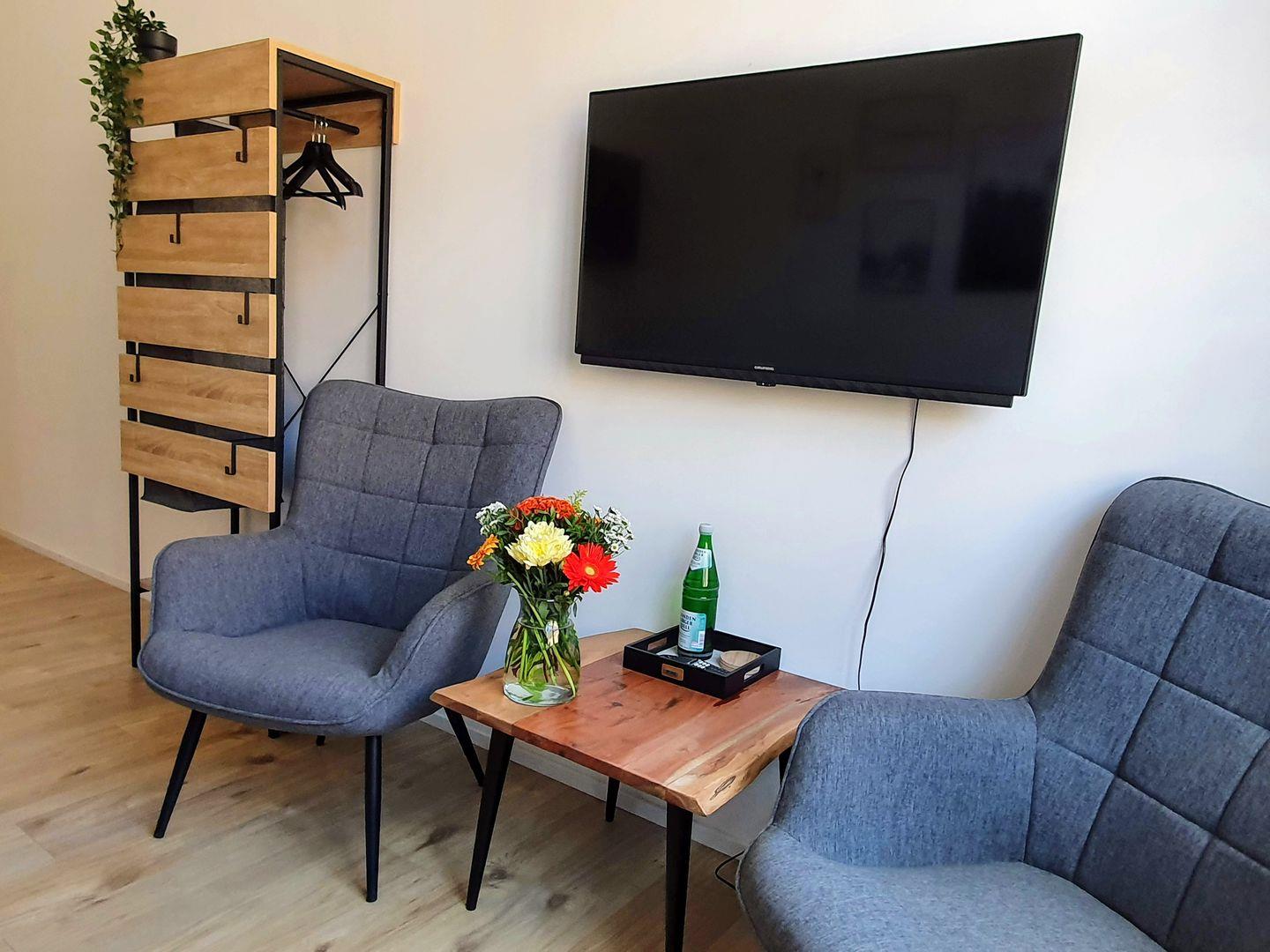 Das Appartement verfügt über eine einladende Schlafmöglichkeit, die exzellenten Schlafkomfort verspricht. Hier können Sie nach einem erlebnisreichen Tag in der Stadt entspannen und neue Energie tanken. Der Wohnbereich ist hell und freundlich gestaltet und lädt dazu ein, nach einem langen Tag gemütlich zu entspannen. Ausgestattet mit einem Fernseher, bietet er die ideale Möglichkeit, einen entspannten Abend zu genießen. Zudem sorgt ein Ventilator im Appartement für angenehme Luftzirkulation, besonders an warmen Sommertagen.