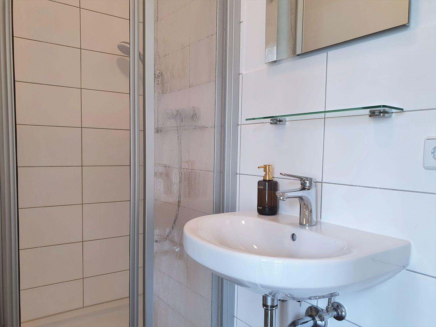 Das Appartement umfasst ein gemütliches Schlafzimmer. Das Badezimmer ist mit einer Dusche ausgestattet. Hier finden Sie auch einen Haartrockner sowie alle notwendigen Annehmlichkeiten, einschließlich eines Waschbeckens und eines WCs.