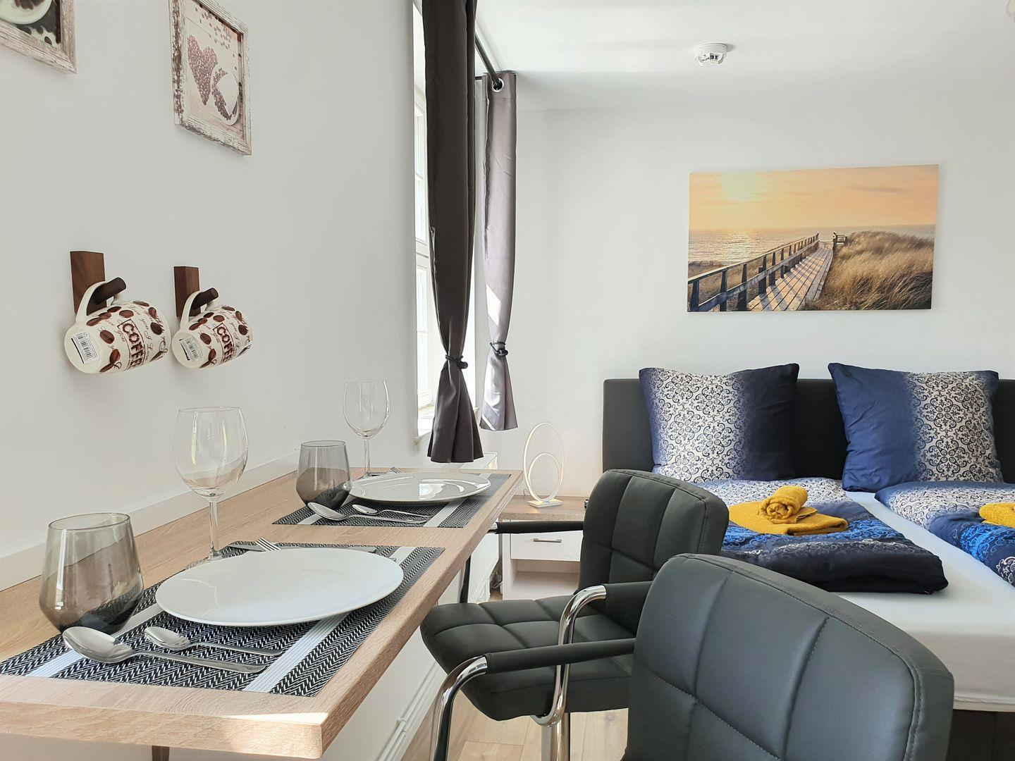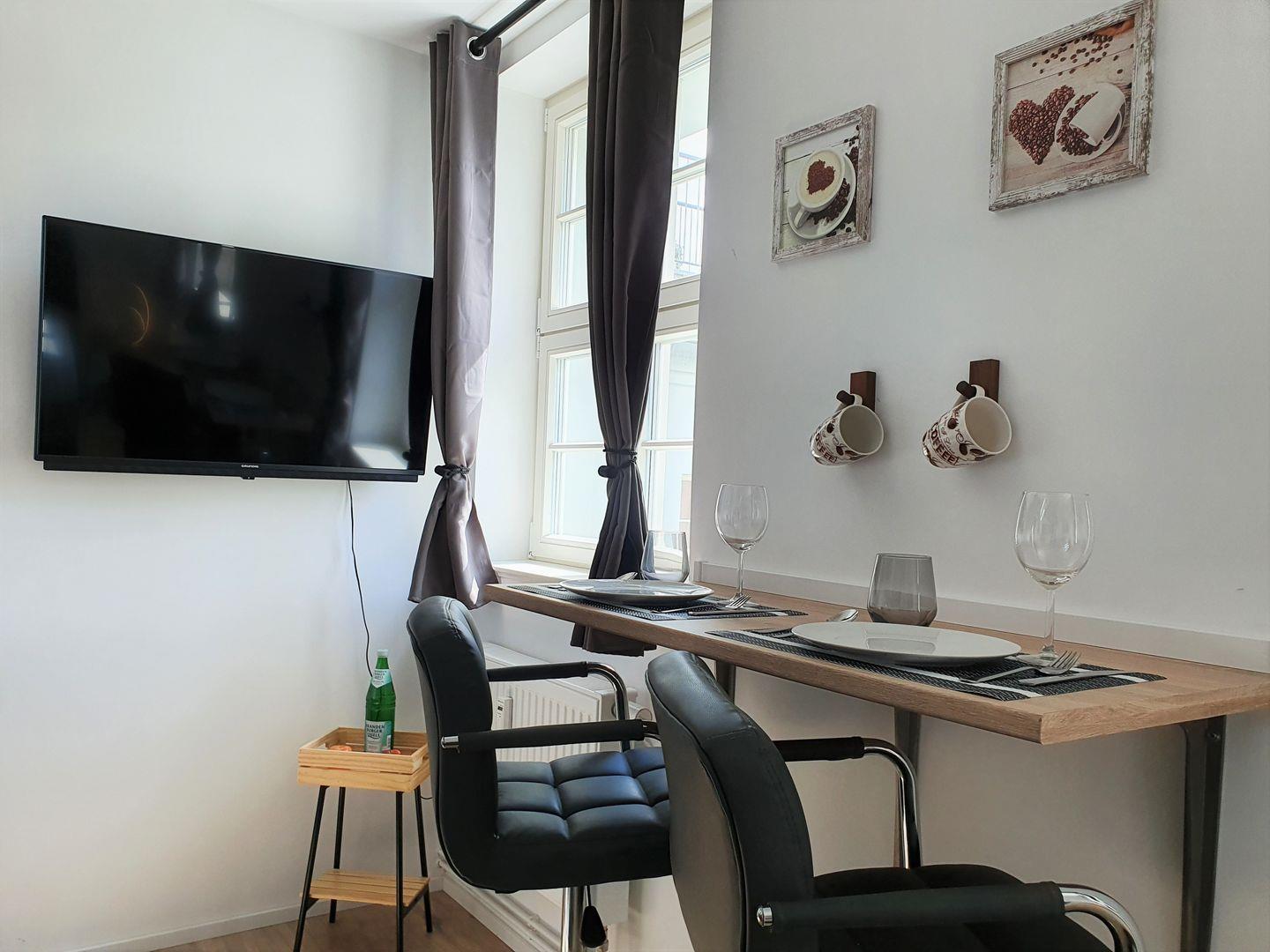 Die komfortable Einrichtung wird durch einen Tisch und einen TV im Wohnbereich ergänzt, sodass Sie sich nach einem aktiven Tag in der Stadt zurücklehnen und entspannen können. WLAN und Internetzugang stehen selbstverständlich zur Verfügung und ermöglichen es Ihnen, jederzeit mit Freunden und Familie in Kontakt zu bleiben oder die schönsten Plätze der Umgebung zu recherchieren.