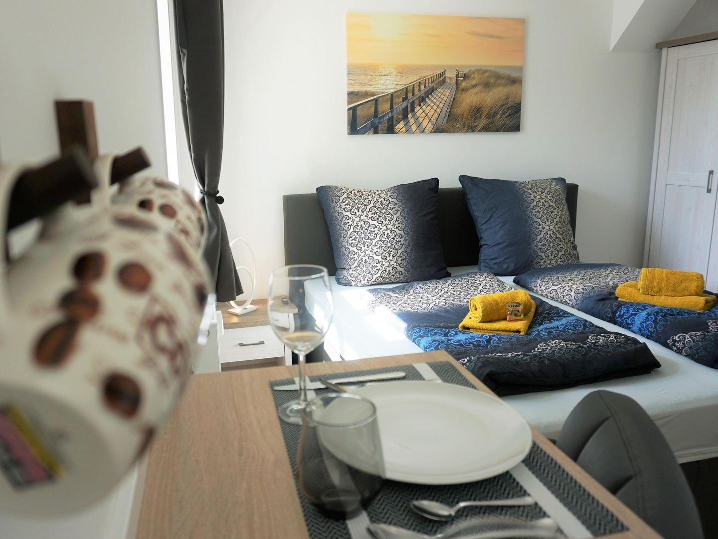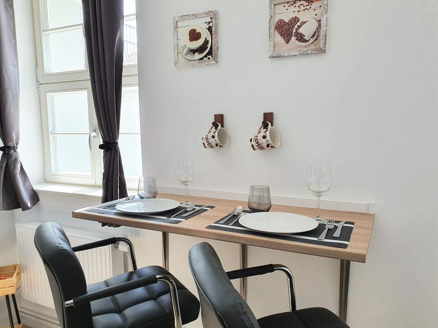 Die Ferienwohnung bietet Schlafmöglichkeiten für bis zu zwei Personen und ist damit ideal für Paare oder Alleinreisende. Bei der Einrichtung wurde Wert auf eine gemütliche und einladende Atmosphäre gelegt. Der offene Wohnbereich, der mit einer voll ausgestatteten Küche und einem Essbereich verbunden ist, lädt zu geselligen Abenden ein, während Sie sich mit Leckereien aus der Region verwöhnen. Die Küche verfügt über moderne Geräte, darunter einen Kühlschrank mit Gefrierfach, sowie eine Mikrowelle, einen Toaster und eine Kaffeemaschine – alles, was Sie benötigen, um Ihre eigenen Mahlzeiten zuzubereiten.