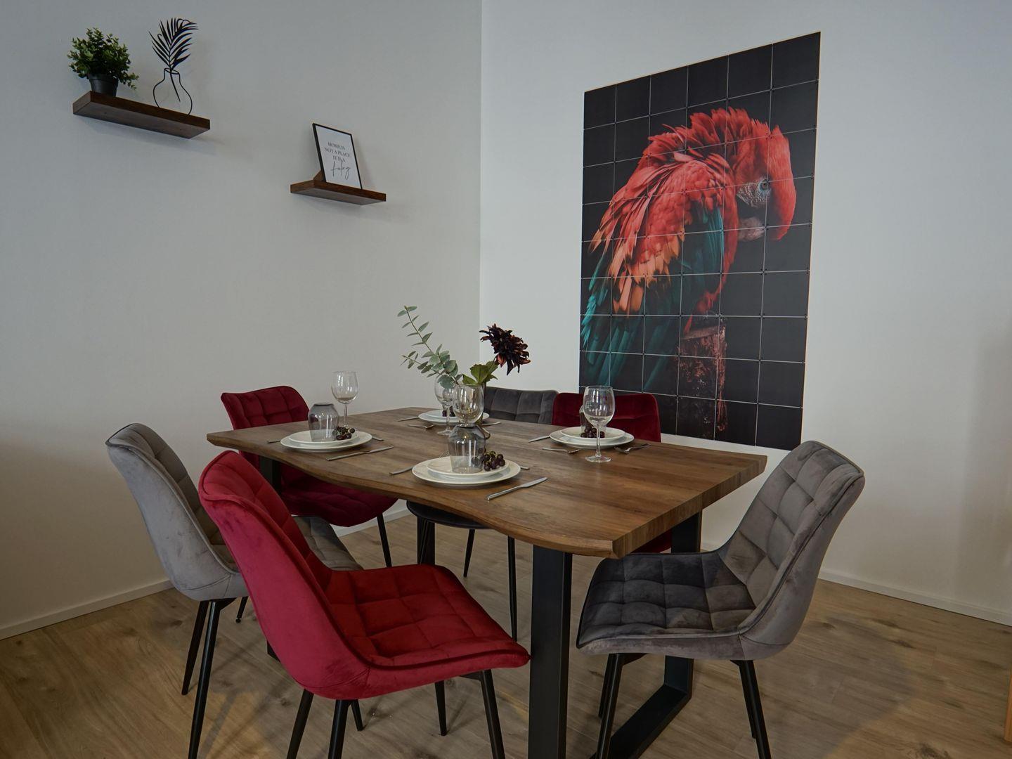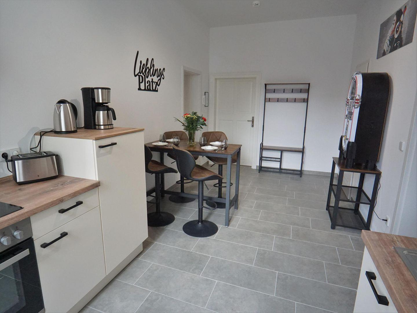 Die Ferienwohnung ist vollständig ausgestattet und bietet Ihnen alles, was Sie für einen angenehmen Aufenthalt benötigen. Der Wohnbereich ist mit einem bequemen Sofa und einem großen Esstisch ausgestattet, an dem die gesamte Familie Platz findet. Hier können Sie Geselligkeit pflegen, Brettspiele spielen oder einfach entspannen. Ein TV sorgt für Unterhaltung, und mit WLAN können Sie jederzeit online sein, um Ihre Erlebnisse mit Freunden und Familie zu teilen.