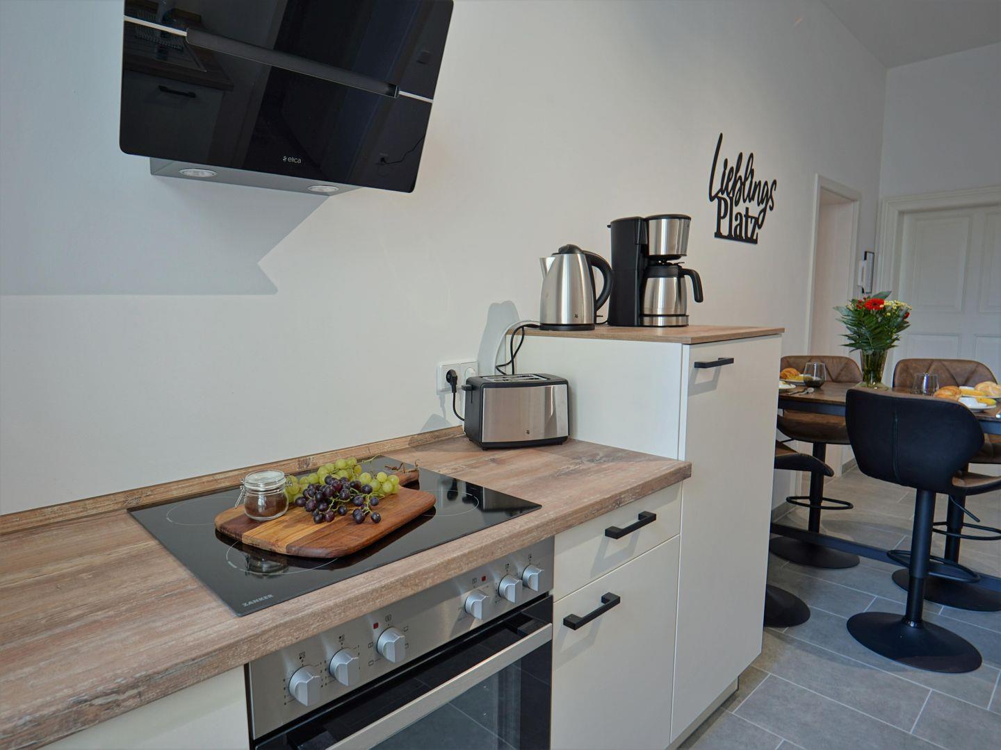Die gut ausgestattete Küche lässt keine Wünsche offen. Mit einem Herd, Backofen, Kühlschrank, Spülmaschine und zahlreichen Küchenutensilien können Sie Ihrer Kreativität beim Kochen freien Lauf lassen. Genießen Sie das Frühstück auf der gemütlichen Terrasse oder bereiten Sie ein festliches Abendessen für die gesamte Familie zu – Ihnen stehen alle Möglichkeiten offen. Auch für den Kaffee-Liebhaber gibt es eine Kaffeemaschine, und ein Wasserkocher sowie ein Toaster sind ebenfalls vorhanden.