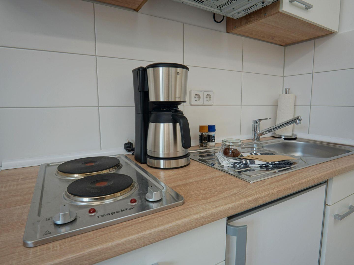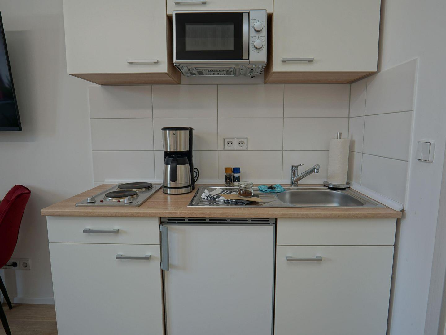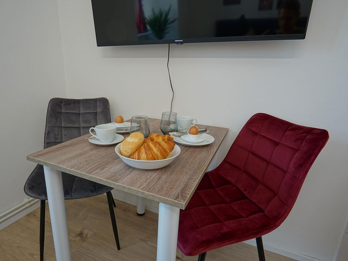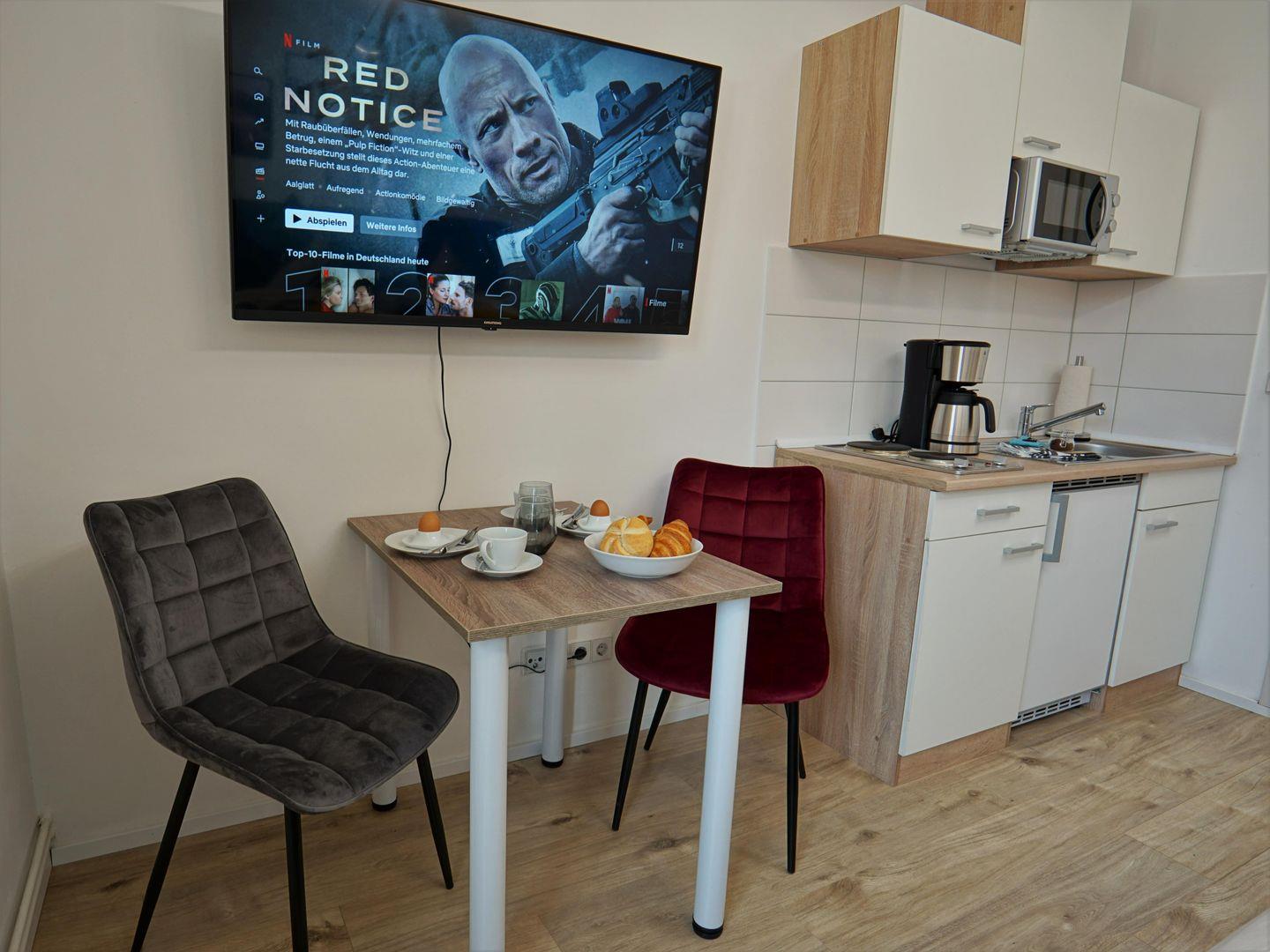 Die Unterkunft zeichnet sich durch eine einladende Atmosphäre aus, die zum Wohlfühlen einlädt. Der Wohnbereich ist hell und freundlich gestaltet und verfügt über einen Fernseher, der für gemütliche Filmabende sorgt. Eine umfassende Küchenausstattung inklusive Herd, Kühlschrank, Mikrowelle und Kaffeemaschine ermöglicht es Ihnen, kulinarische Köstlichkeiten selbst zuzubereiten. Ein komfortabler Esstisch lädt dazu ein, beim gemeinsamen Essen schöne Gespräche zu führen oder den Tag Revue passieren zu lassen.