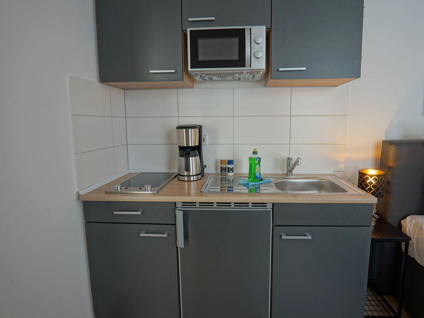 Die komfortable Unterkunft vereint modernes Design mit einer einladenden Atmosphäre, um Ihnen einen erholsamen Aufenthalt zu garantieren. Die Wohnung verfügt über einen praktischen Essbereich, ideal für gemütliche gemeinsame Mahlzeiten. Die voll ausgestattete Küche lässt keine Wünsche offen: Hier finden Sie alles, was Sie benötigen, um sich selbst zu versorgen. Mit Annehmlichkeiten wie Kühlschrank, Herd, Mikrowelle, Wasserkocher, Toaster und einer Kaffeemaschine, sind Sie bestens ausgestattet.