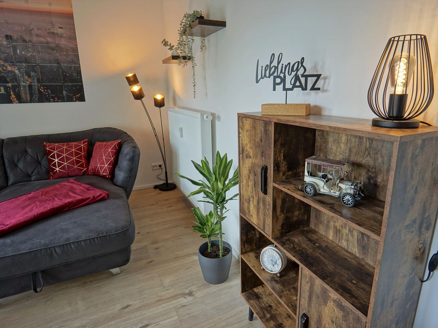 Die großzügig geschnittene Wohnung besticht durch ein helles und freundliches Wohnzimmer, das mit einer gemütlichen Sofaecke ausgestattet ist – der perfekte Ort, um die Erlebnisse des Tages Revue passieren zu lassen oder einen entspannten Filmabend zu genießen. Die große Fensterfront lässt viel Tageslicht herein und sorgt für eine angenehme Stimmung. Zudem steht Ihnen ein Fernseher zur Verfügung, um Ihre Lieblingssendungen und -filme zu schauen.