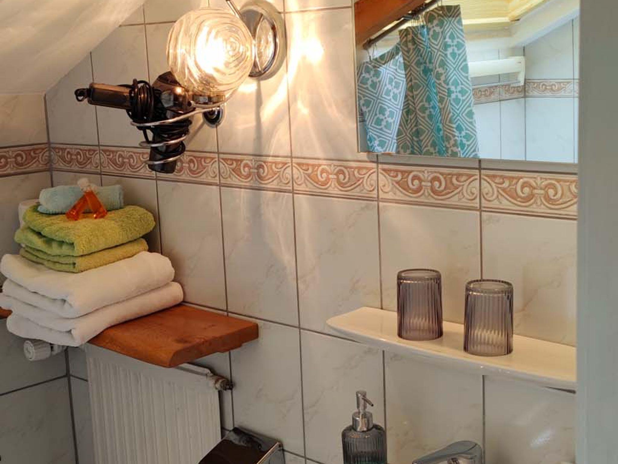 Im Tageslichtbad können Sie in unserer Duschbadewanne sowohl ein entspannendes Schaumbad genießen, als auch eine erfrischende Dusche. WC, Haartrockner, Handtücher, Spiegel übernWaschbecken und ein Kosmetikspiegel sind ebenfalls vorhanden.